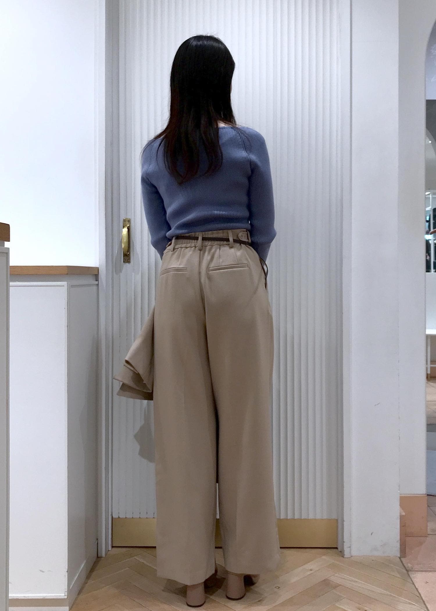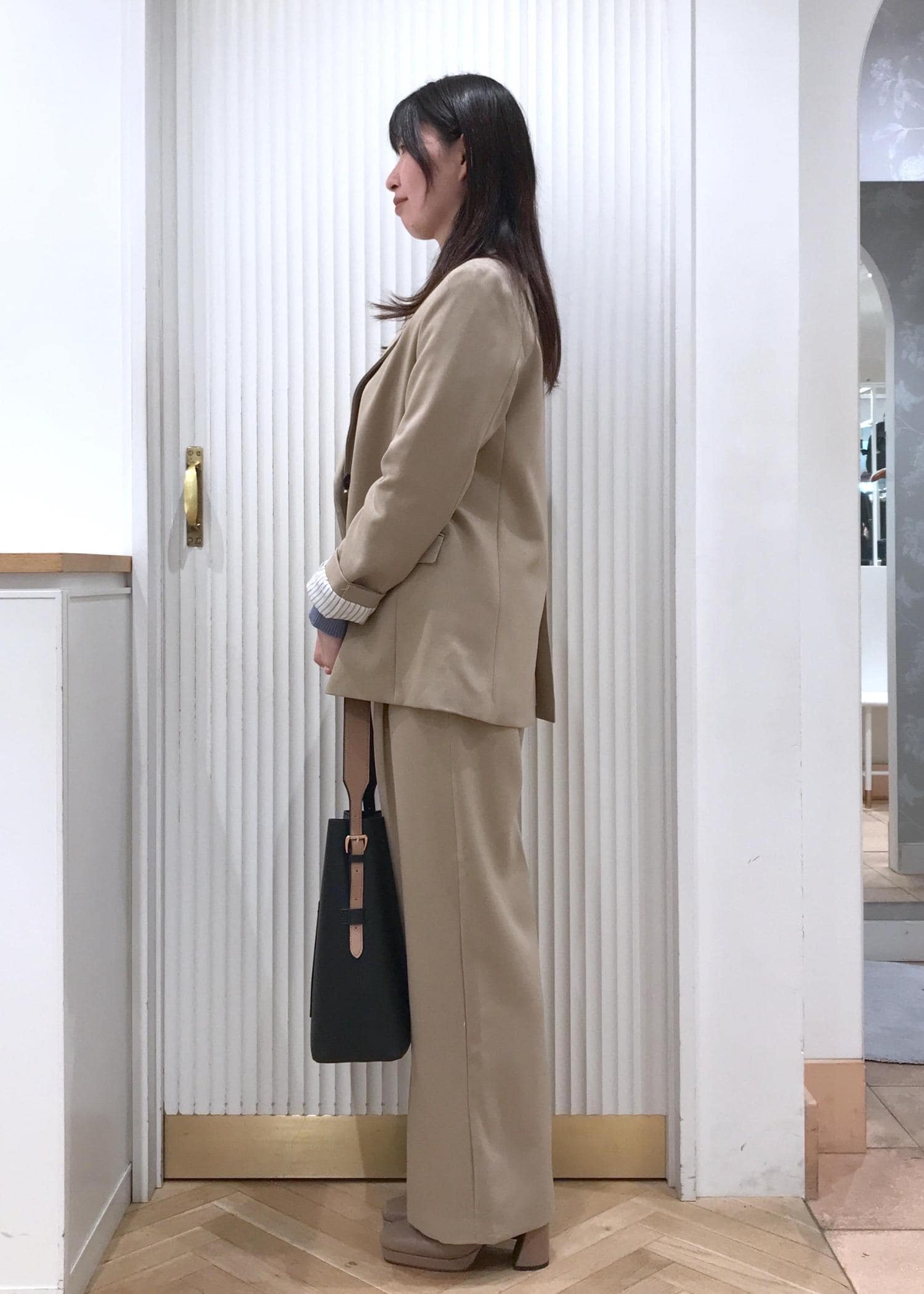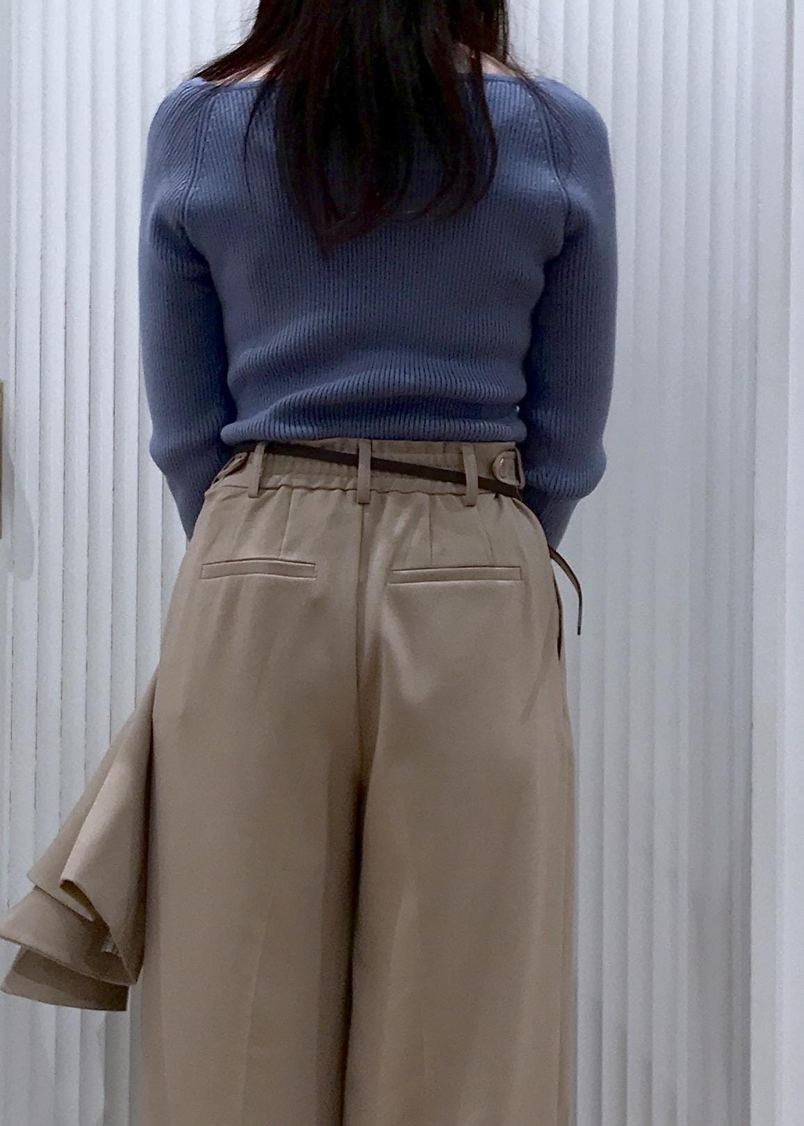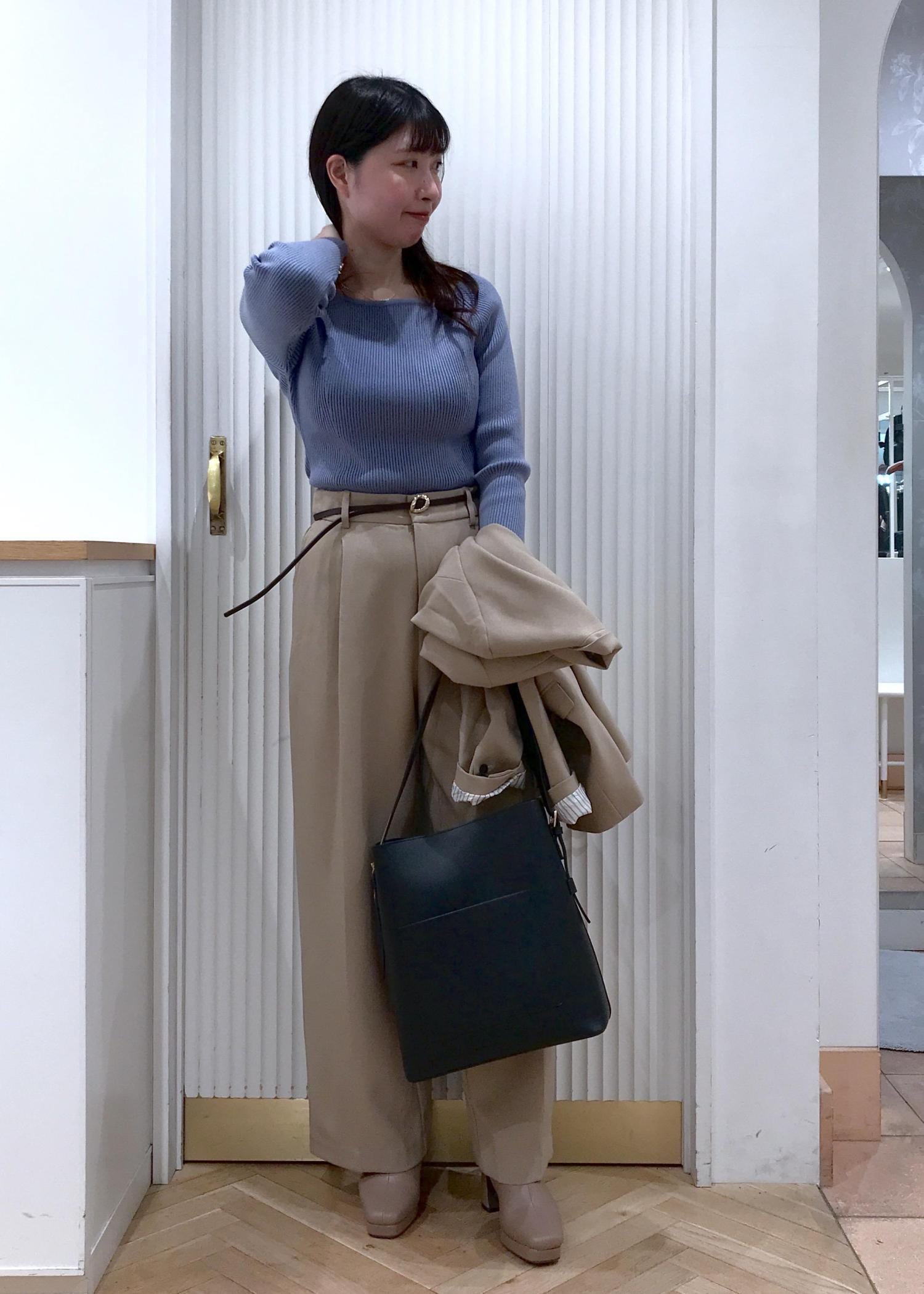 シンプルなスクエアリブニットと美easyのセットアップを合わせたお仕事コーデです。