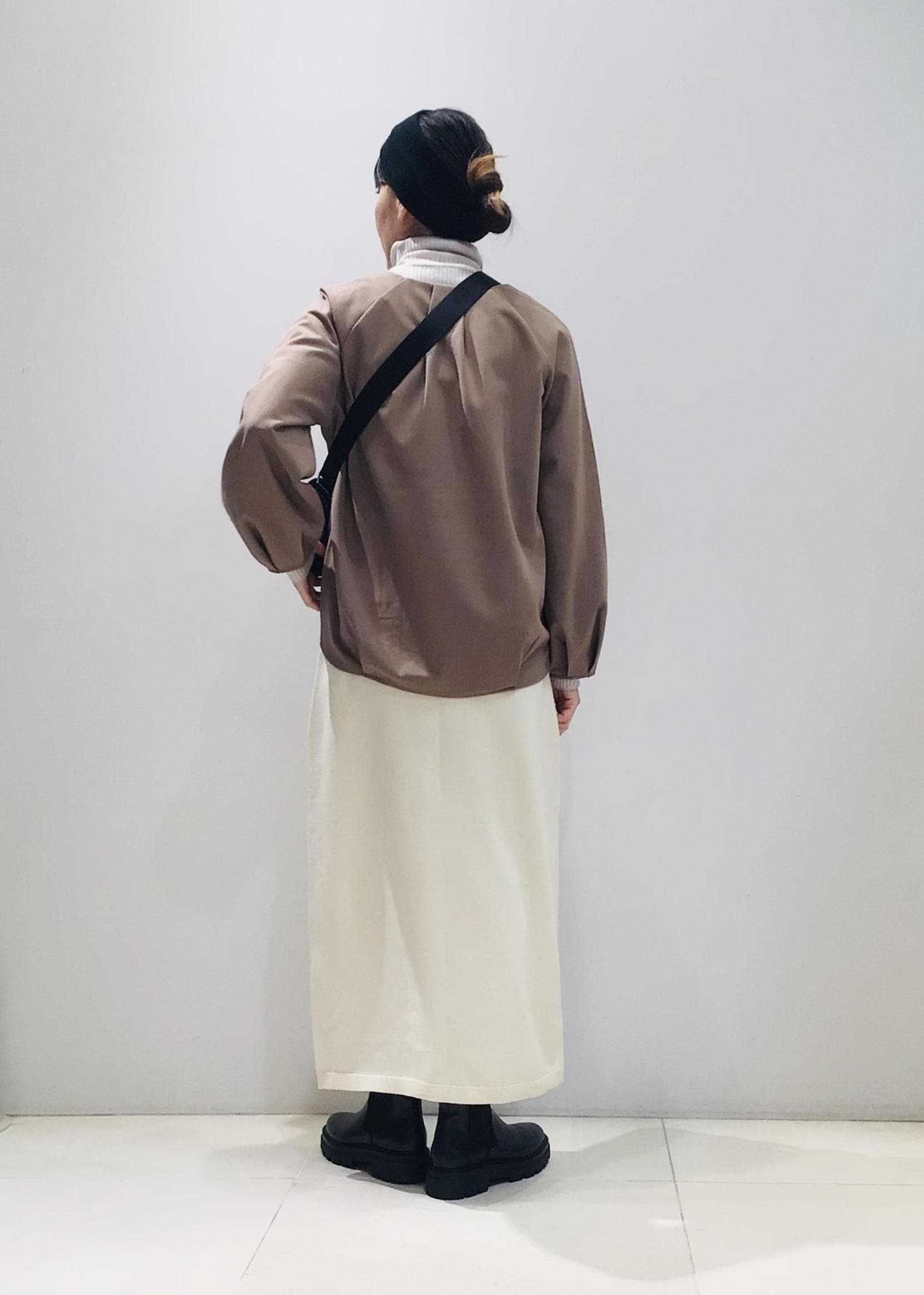 首周りのタックとさりげないコクーンシルエットが立体感のあるフォルムを作り出してくれるので