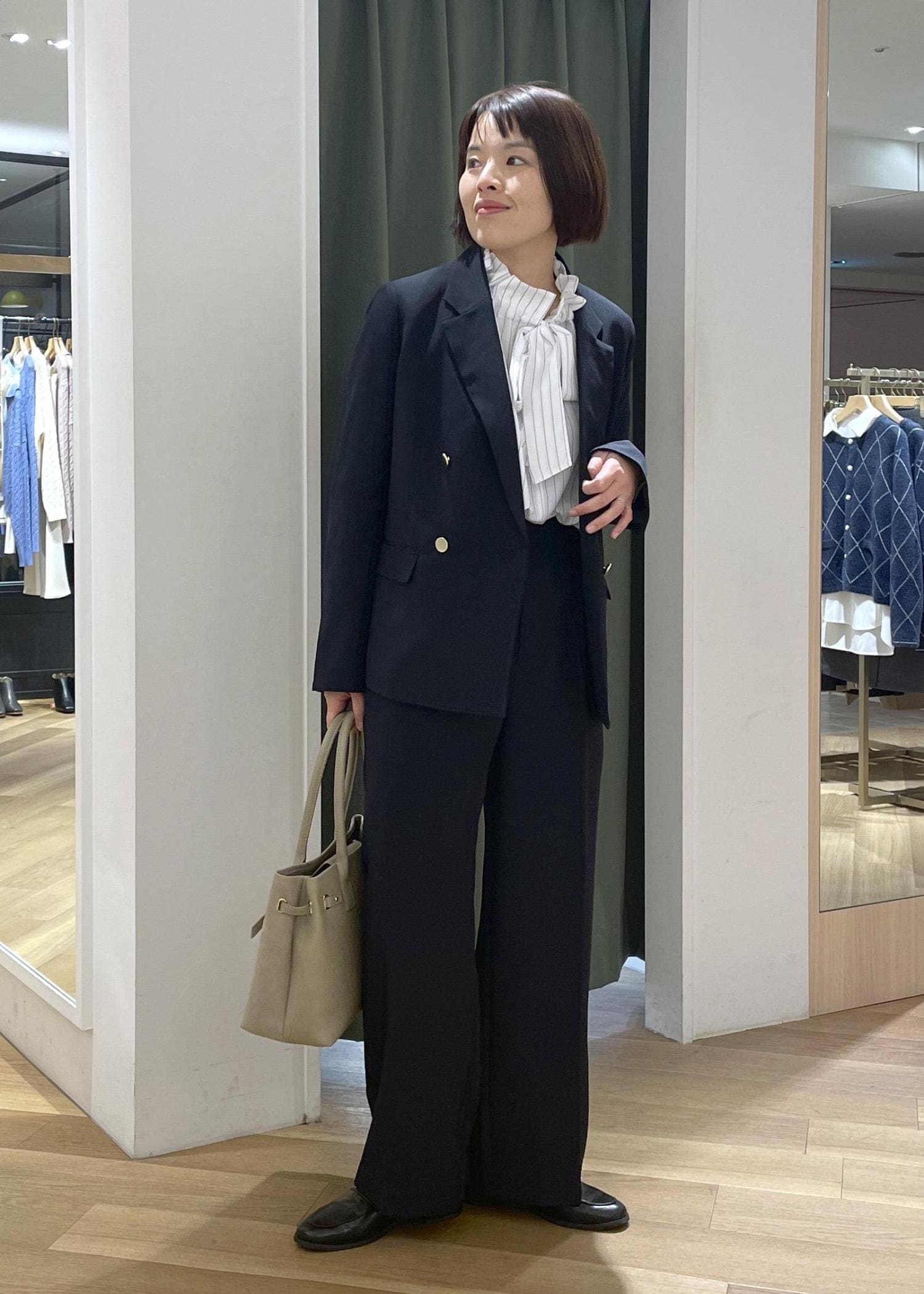 お仕事やセレモニーにもぴったりのジャケットセットアップコーデに、ハンサムなネイビーのミドル丈コートを合わせた通勤コーデです!