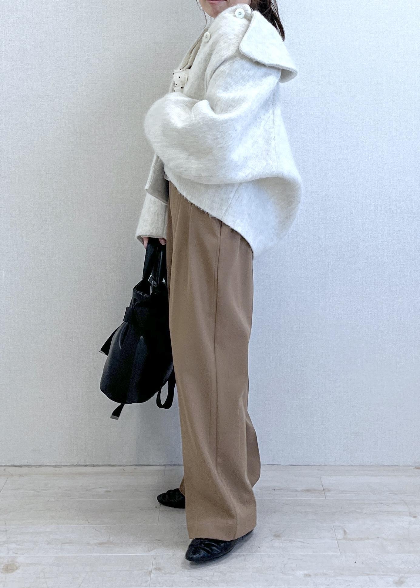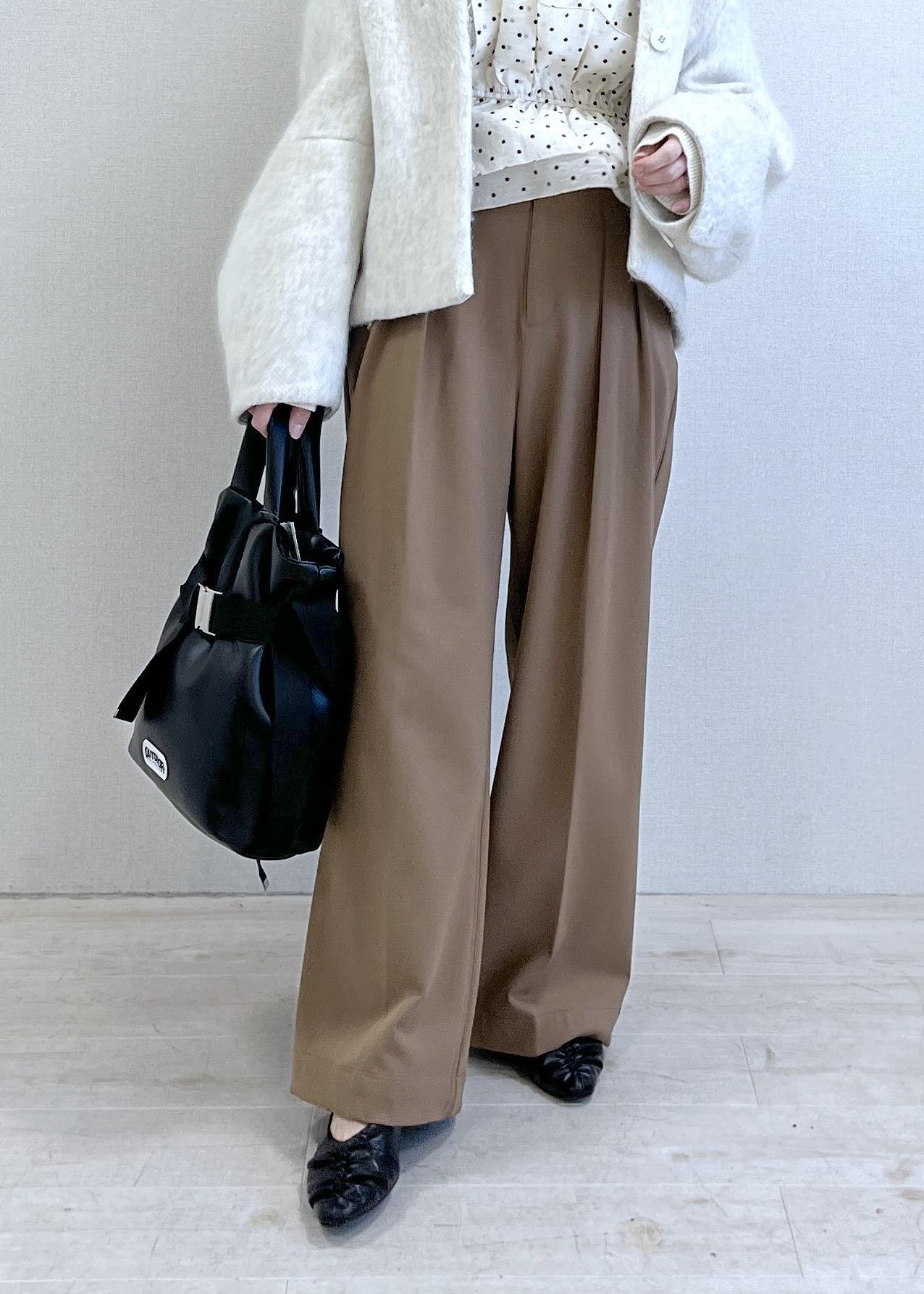 VISHot Beautyツータックワイドパンツ/イージーケアキャメル / S¥5,271レビュー152cmでSサイズ着用し、着丈はペタンコ靴でも床につきませんでした。シルエットがとてもキレイなワイドパンツで、裏起毛しているので冬にピッタリのパンツです。タック入りなのでボリューム感はありますが、不思議と膨らまずストンっとキレイに落ちてくれました。骨ナチュさんにはぴったりなボリュームボトムです。