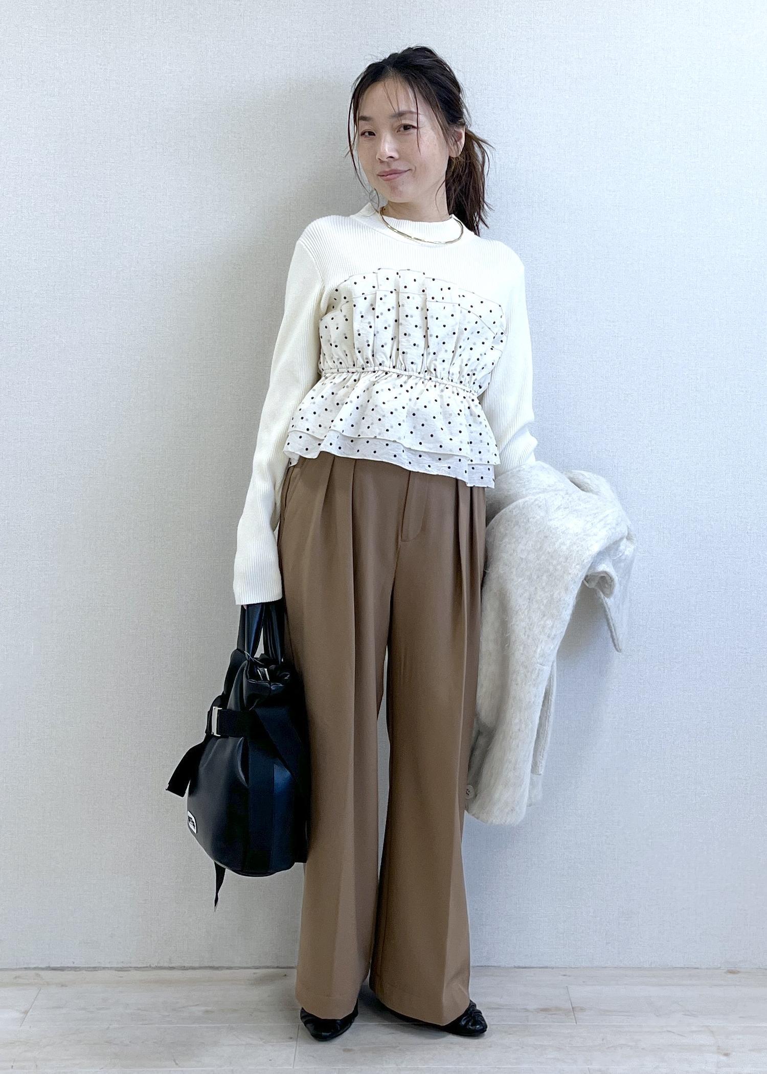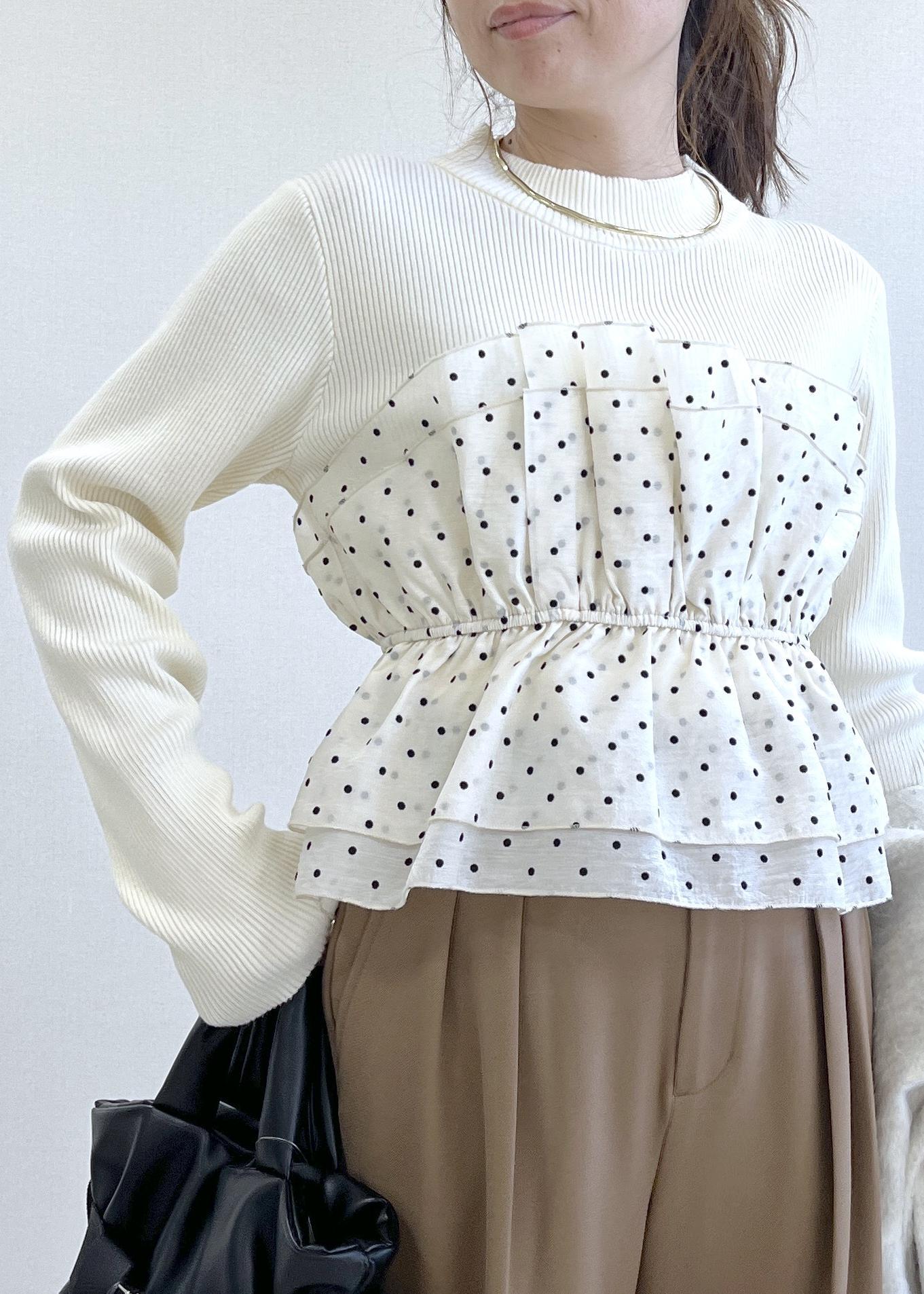 ドットビスチェのデザインが目を引く、さりげなく甘いトップス。ニットだから着心地は楽なのに、一枚で“ちゃんとして