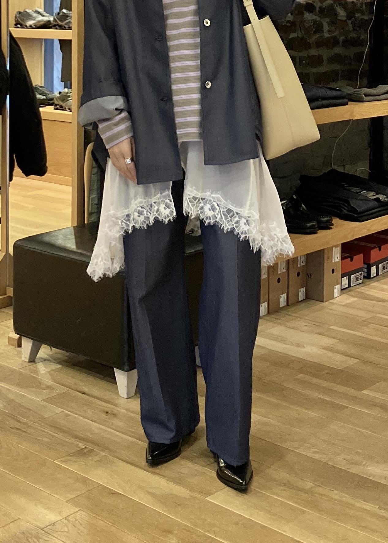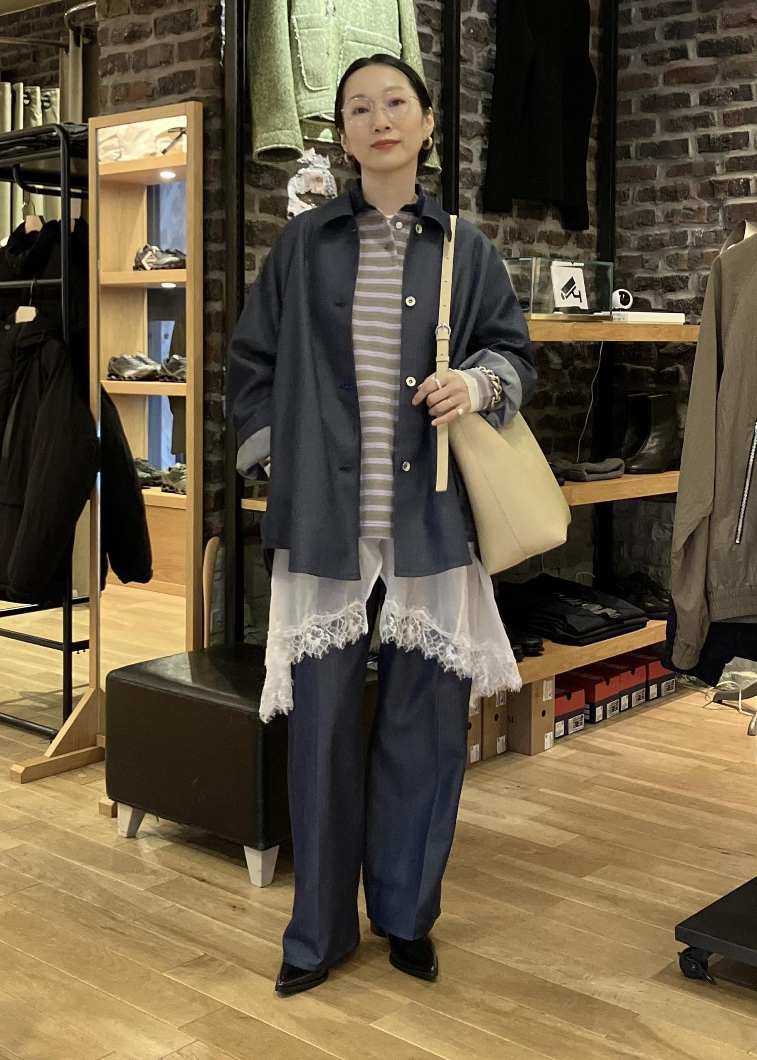 ボトムはスラックスのようなデニムなので、