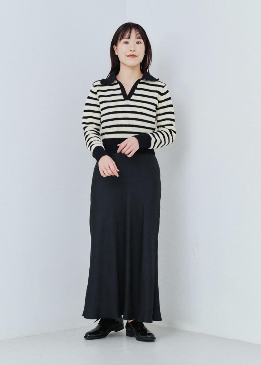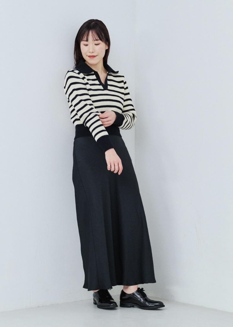 NEW! 予約ROPÉリンクルサテンマーメイドスカートブラック / 38¥25,300レビュー着丈は足首が隠れるマキシ丈。ウエスト周りはタイトですが、お尻から広がるシルエットで太ももやお尻周りのシルエットは拾いにくいです。