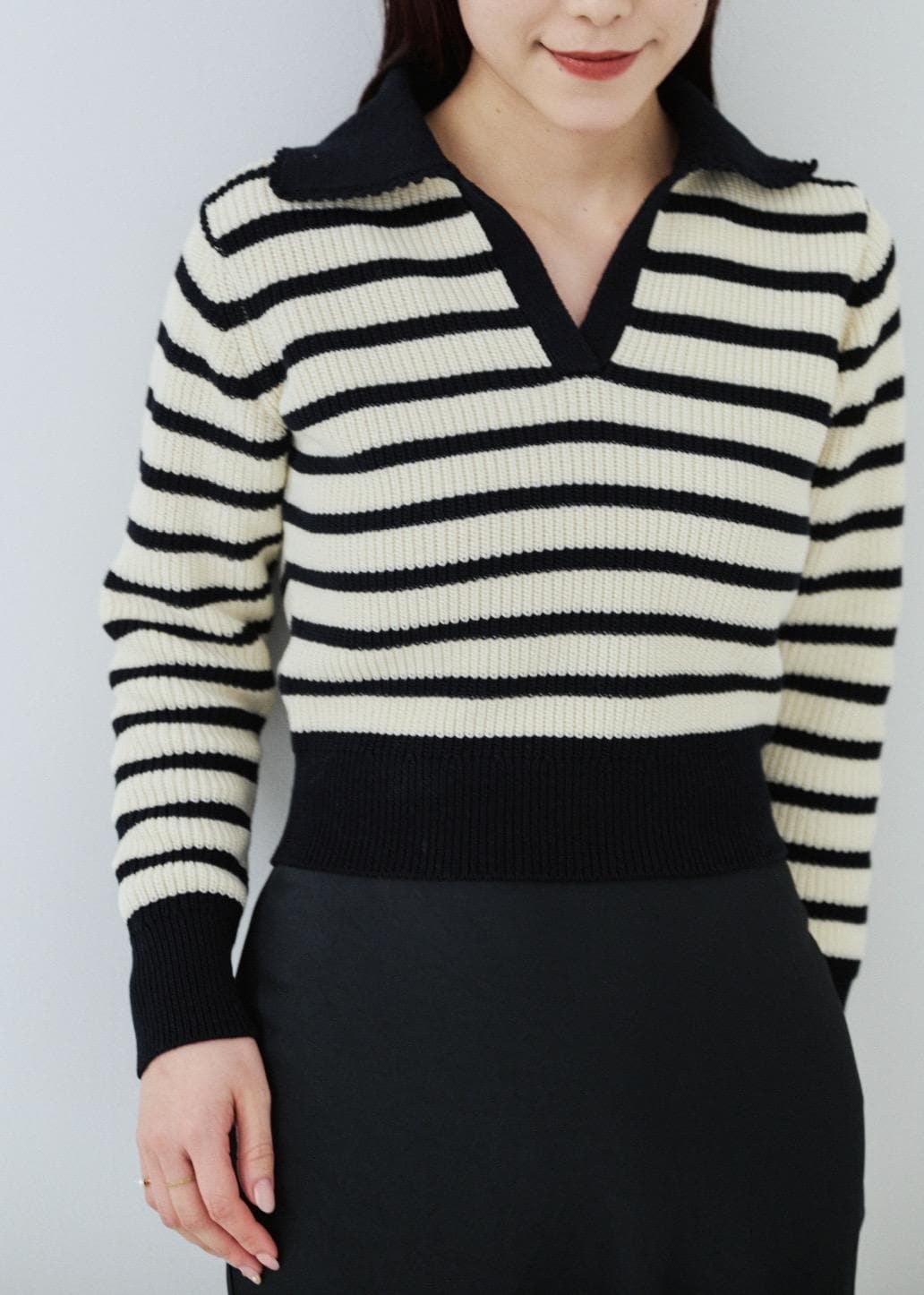 首元は襟の付いたスキッパーデザインで鎖骨はやや見えます。 -
