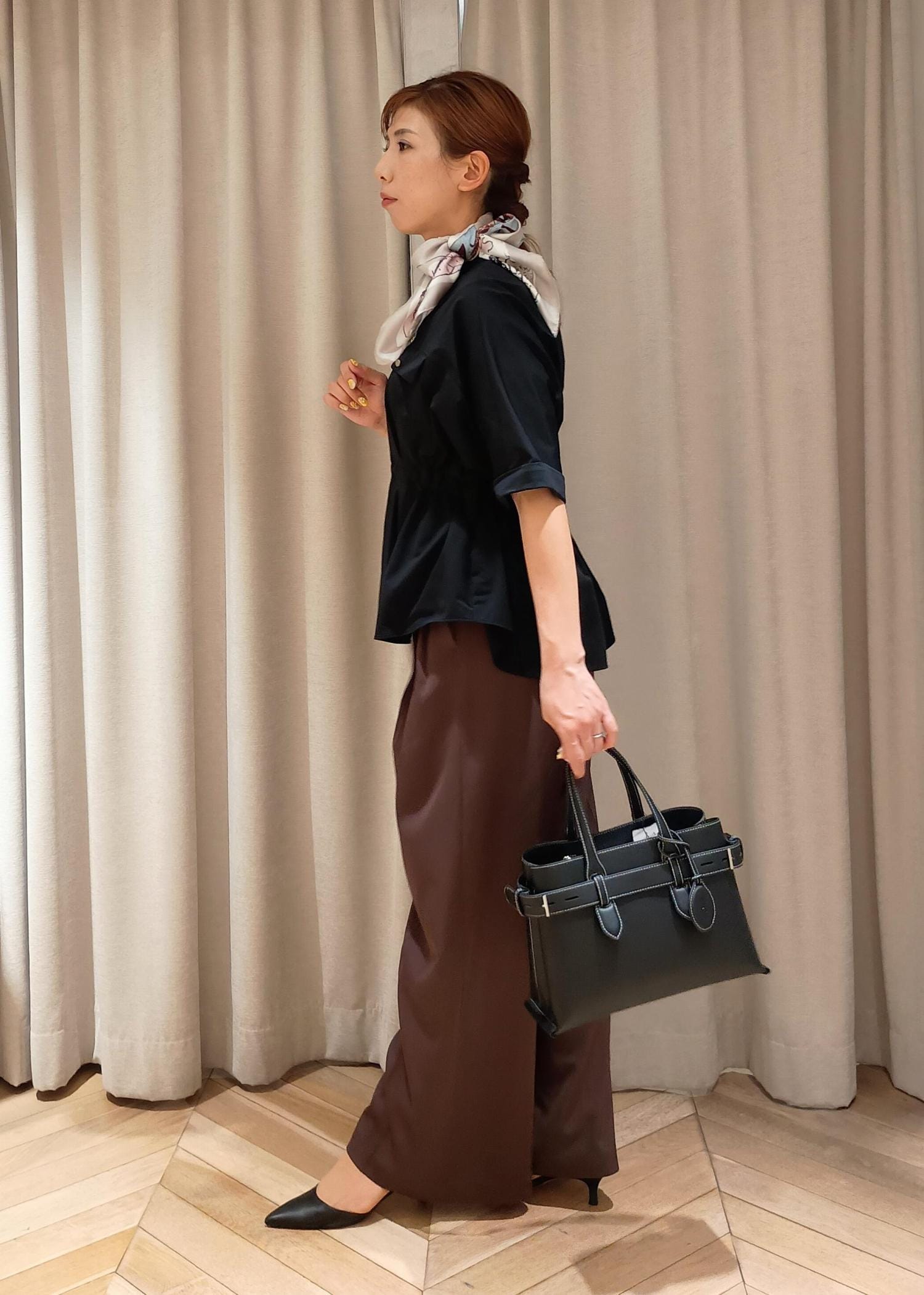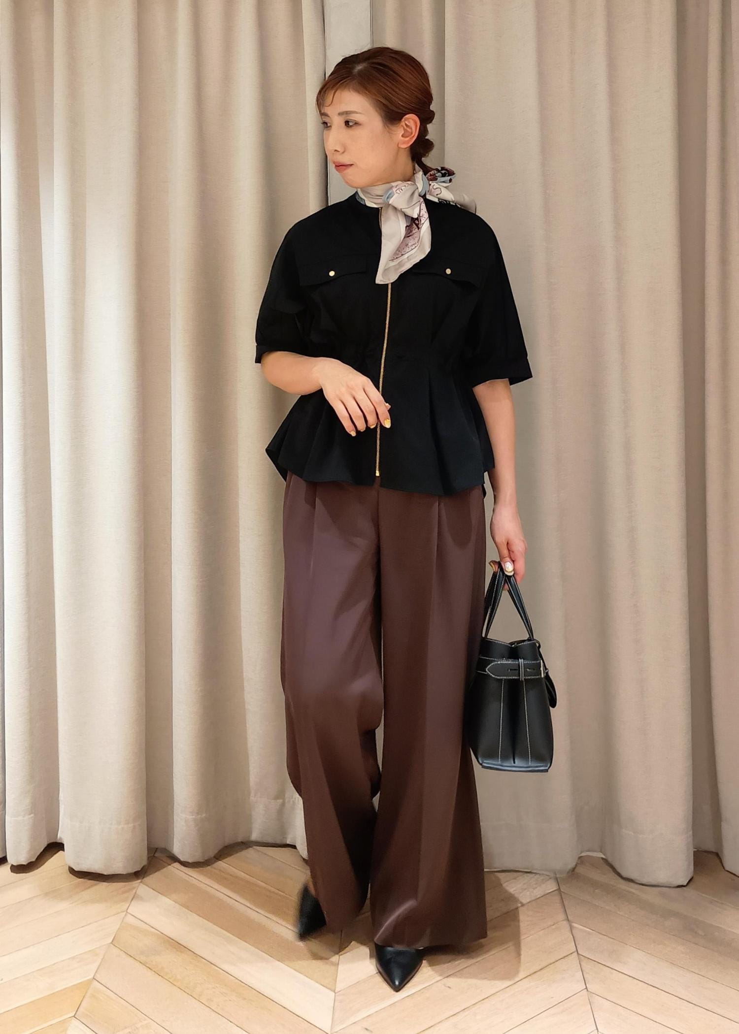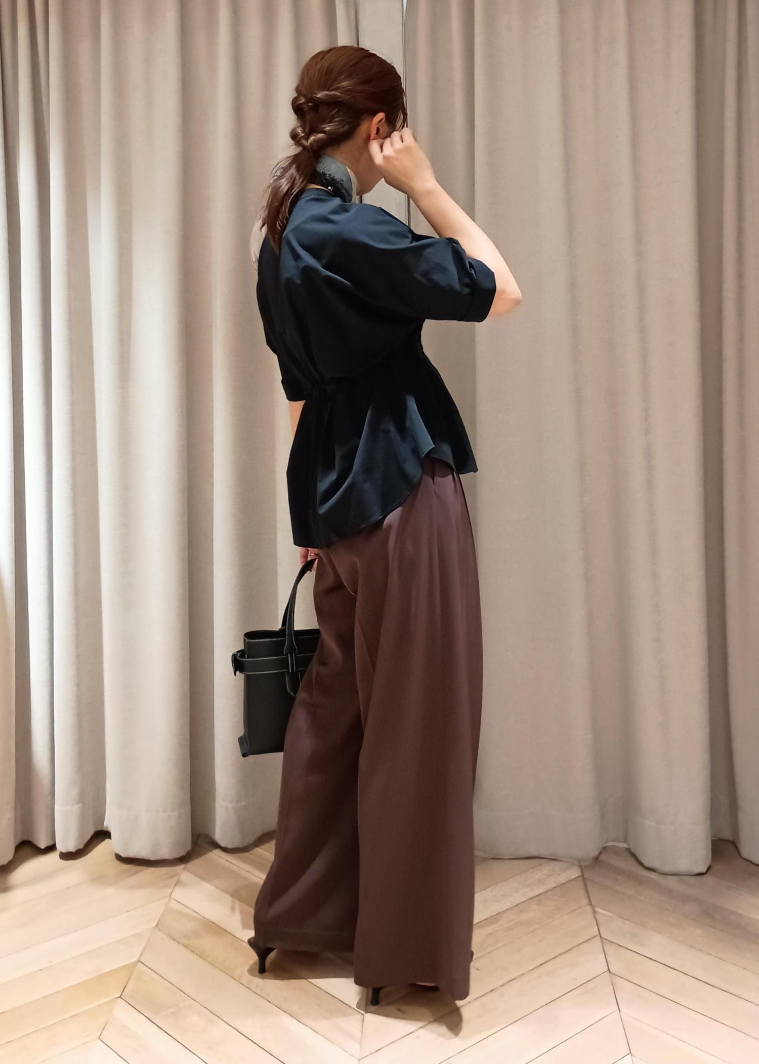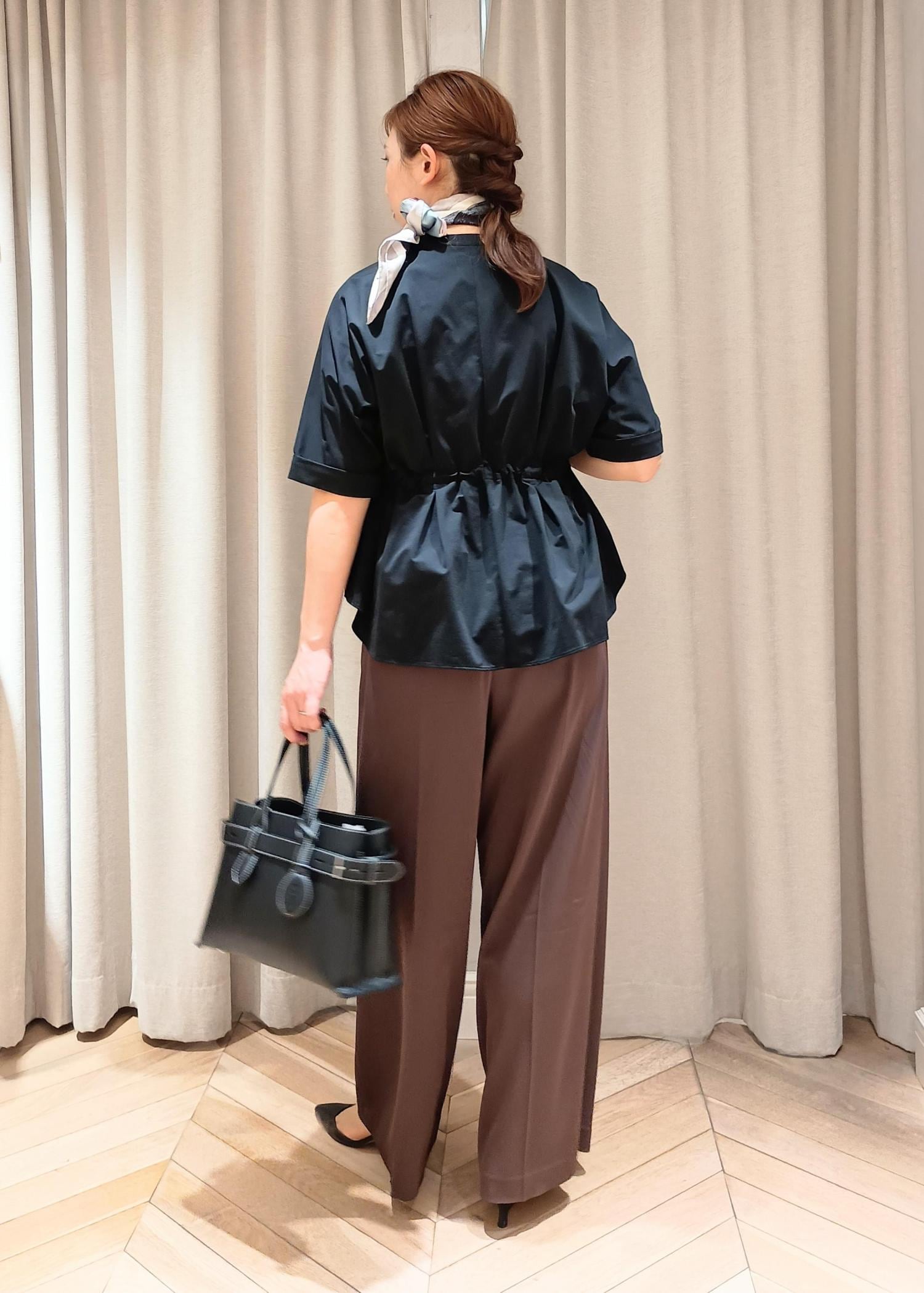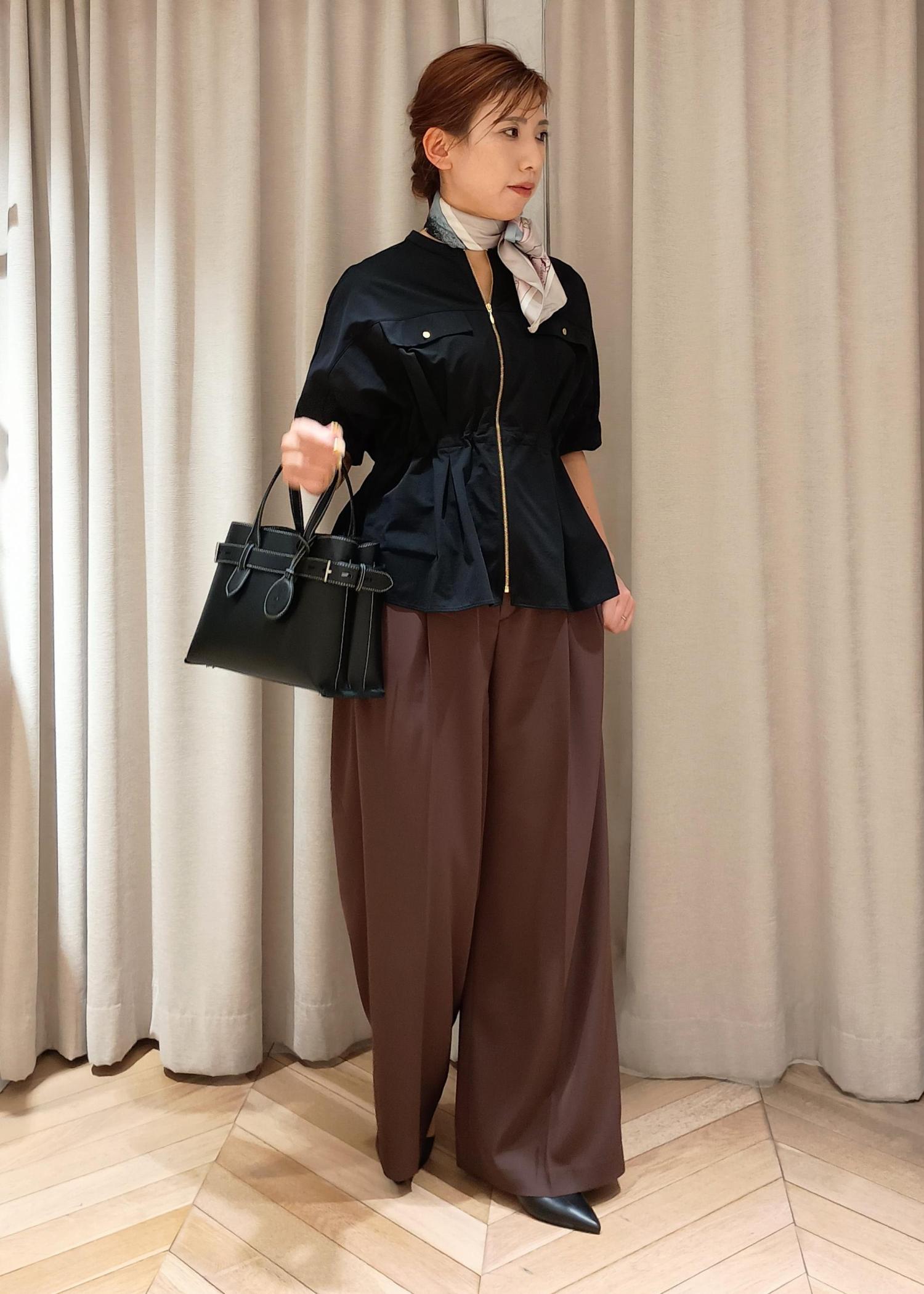 ペプラム切り替えになったトップスには、足のシルエットが分からないゆったり大きめなワイドパンツを合わせ、腰の位置が高くなるのでスタイルアップを狙えます。