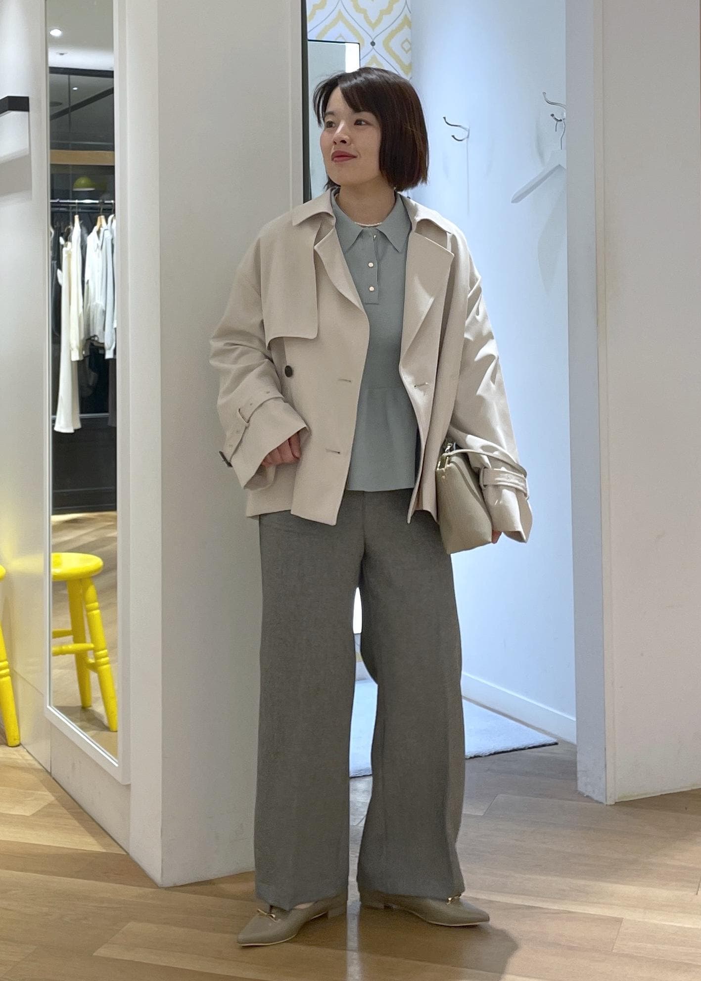 パンツはライトグリーンのパンツを合わせて春っぽく爽やかな印象でまとめました◎