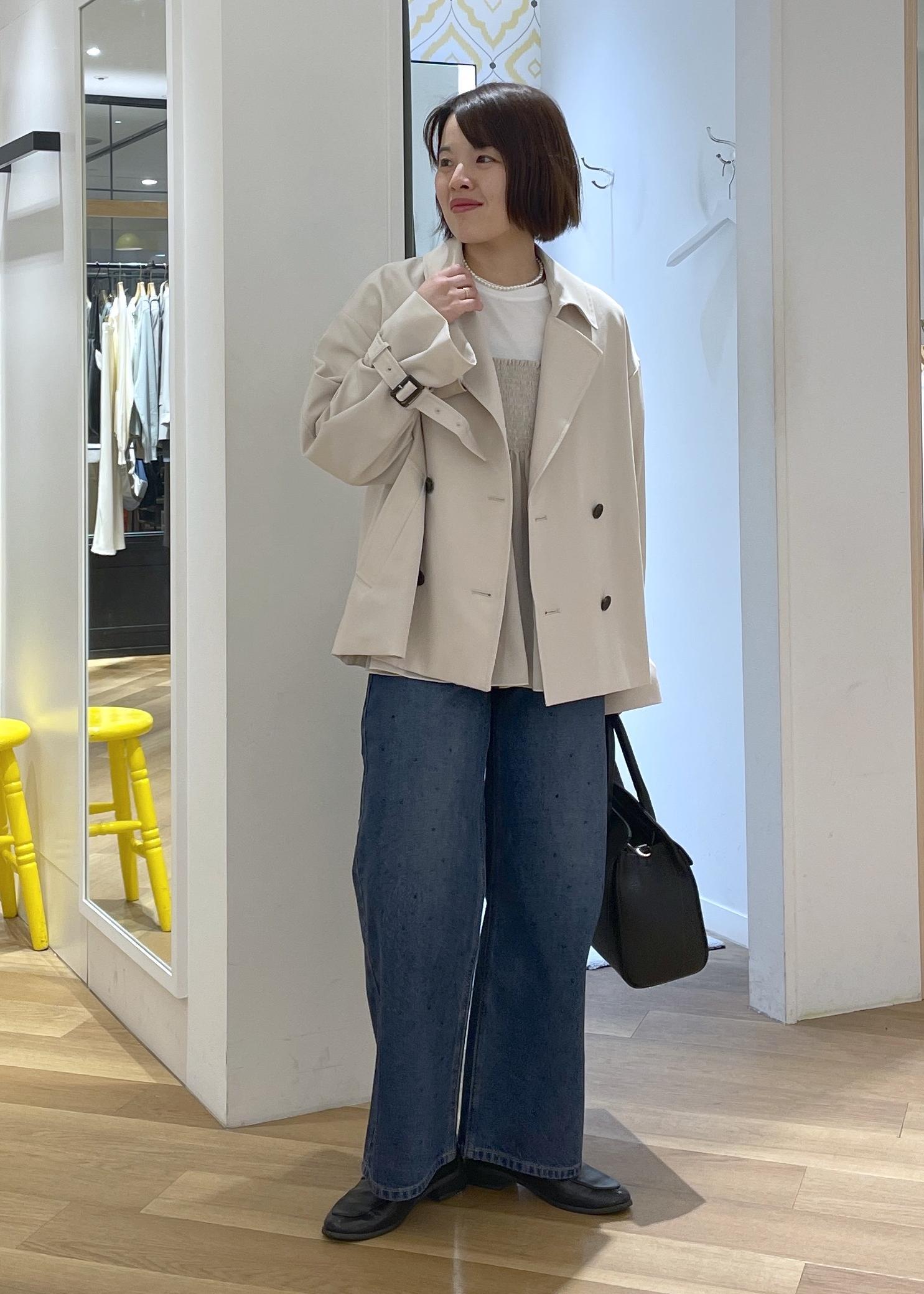 ジャケットがペプラムデザインでふんわりしたシルエットなので、落ち感のあるサテンのスカートを合わせて、大人っぽくメリハリのあるスタイルでまとめました!