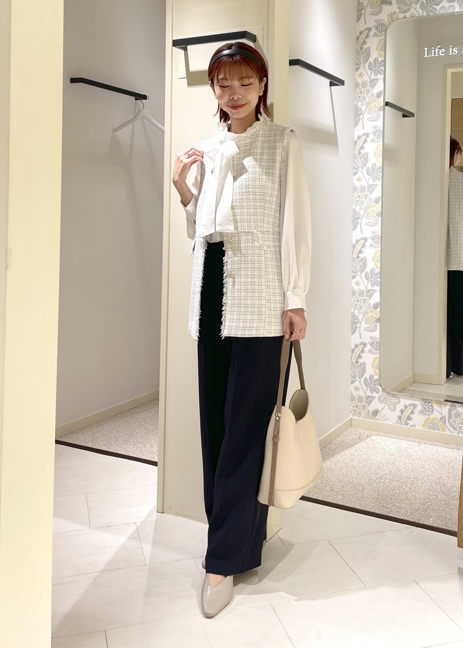 リボンは片結びで、ボトムにはネイビーのパンツを合わせることで甘すぎない大人カジュアルスタイルにまとめてみました。