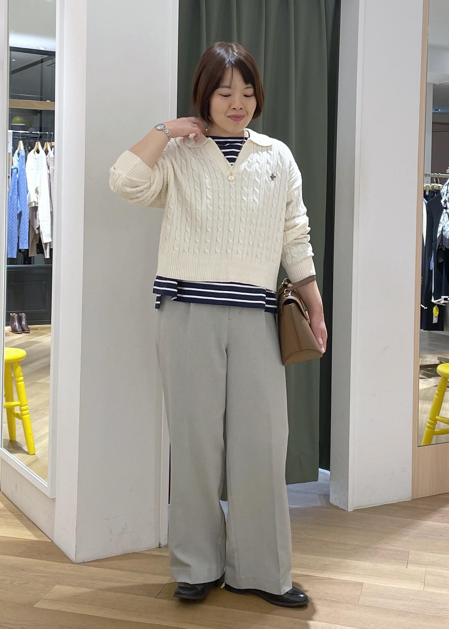 ケーブル編みが可愛い白のスキッパーニットにボーダーのカットソーをレイヤードした、大人カジュアルコーデです!