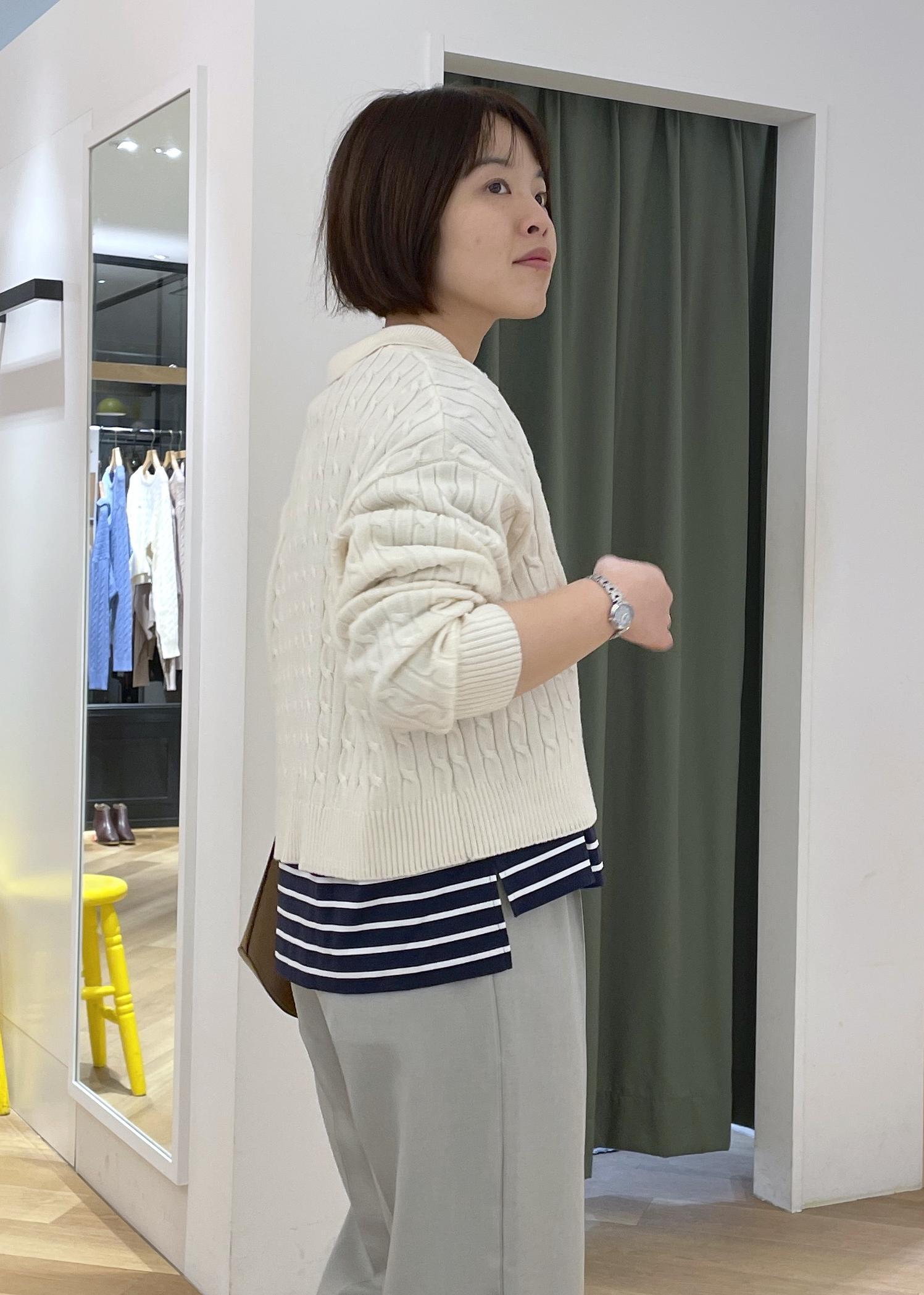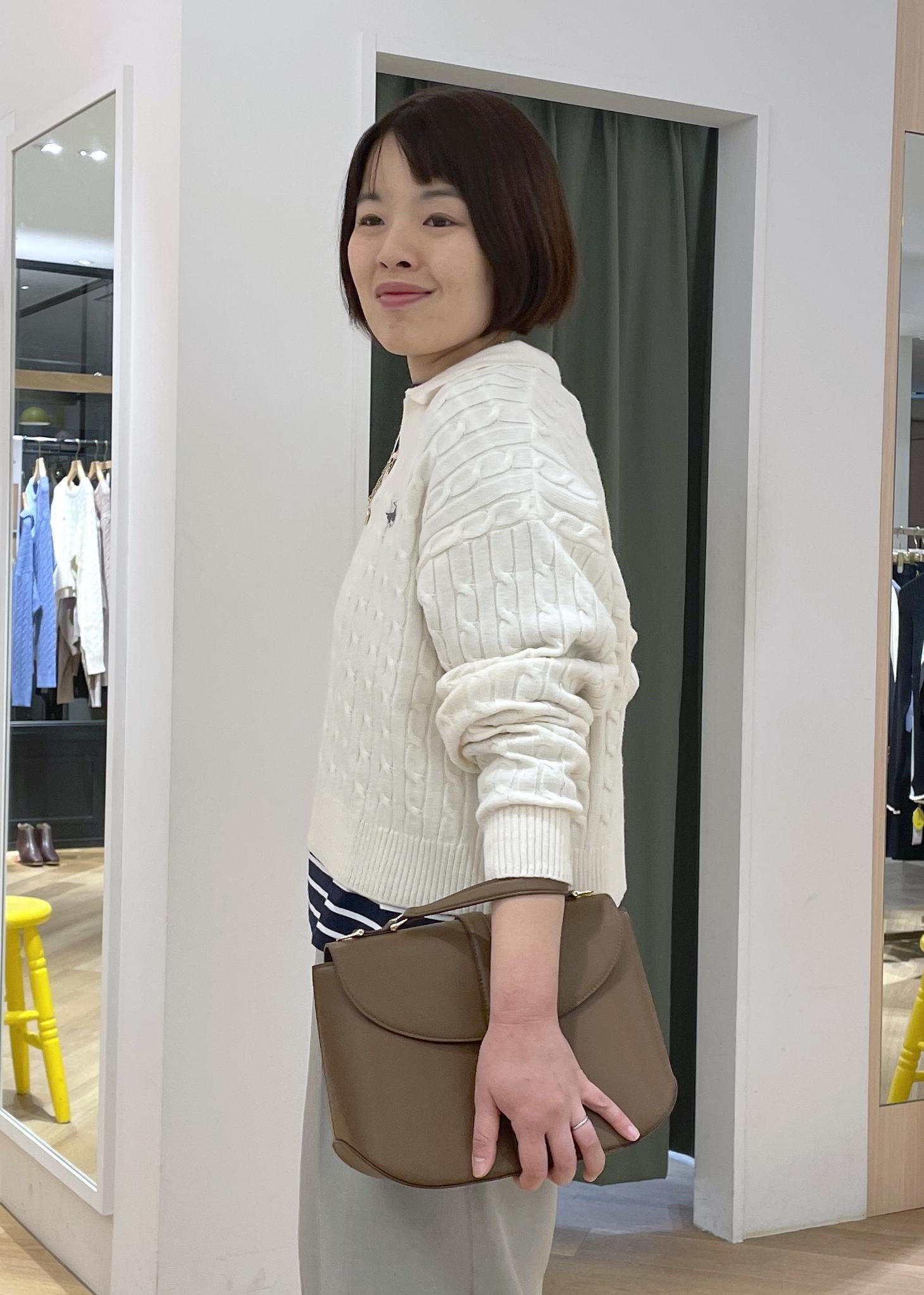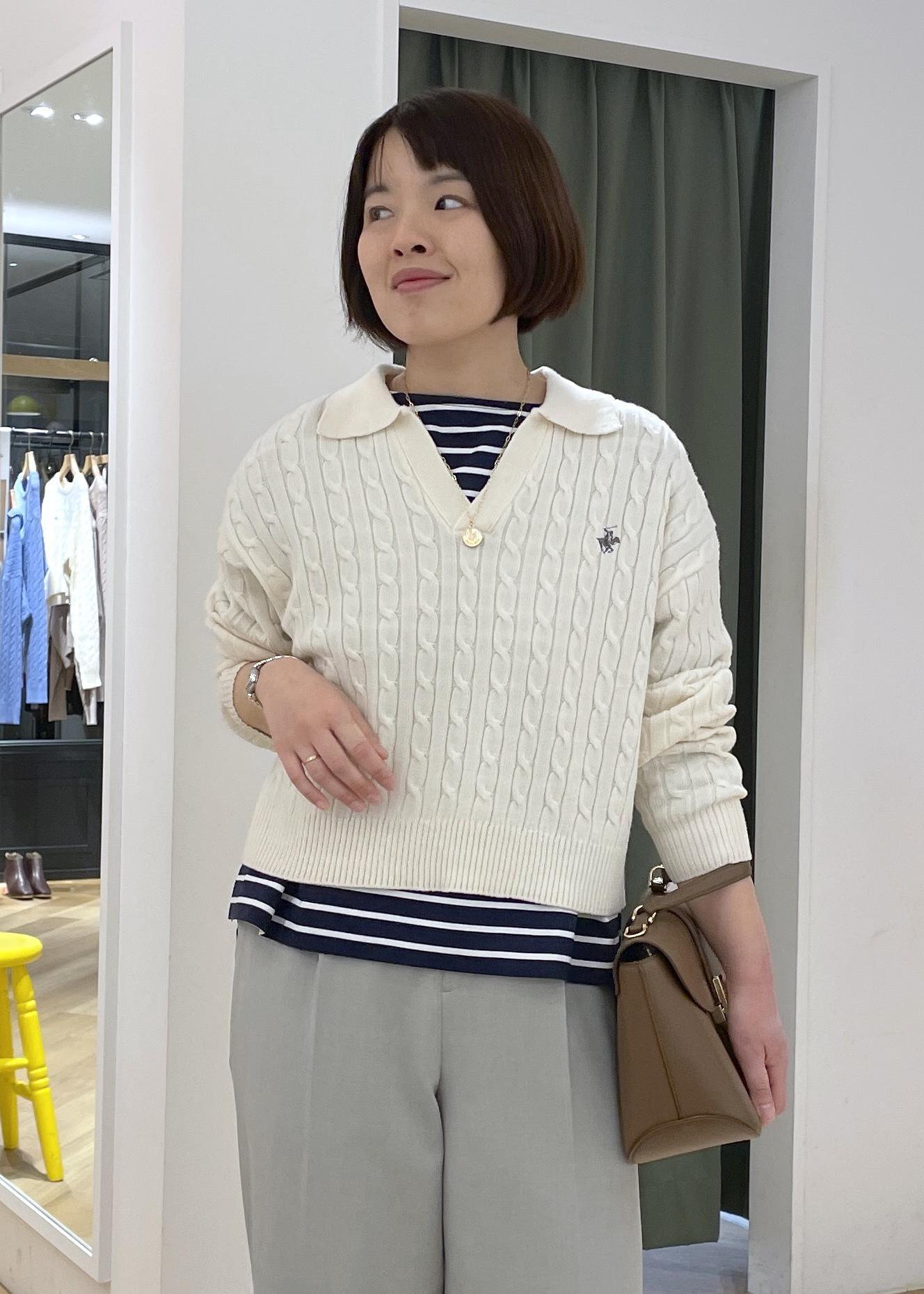 ROPÉ PICNIC【BEVERLYHILLS POLO CLUB・新色追加】ケーブル編みクロップドスキッパーニットキナリ / F¥5,995レビューもちもちで肌触りの良い生地です。敏感肌ですが、素肌に着てもチクチク感は無く着用できました。スキッパー襟なので顔周りもすっきり見えます。襟元の開きが気になる方はシャツはタートルネックを合わせるのもおすすめです。着丈はウエストが隠れるくらいなので、ハイウエストのボトムと合わせるのがおすすめです。