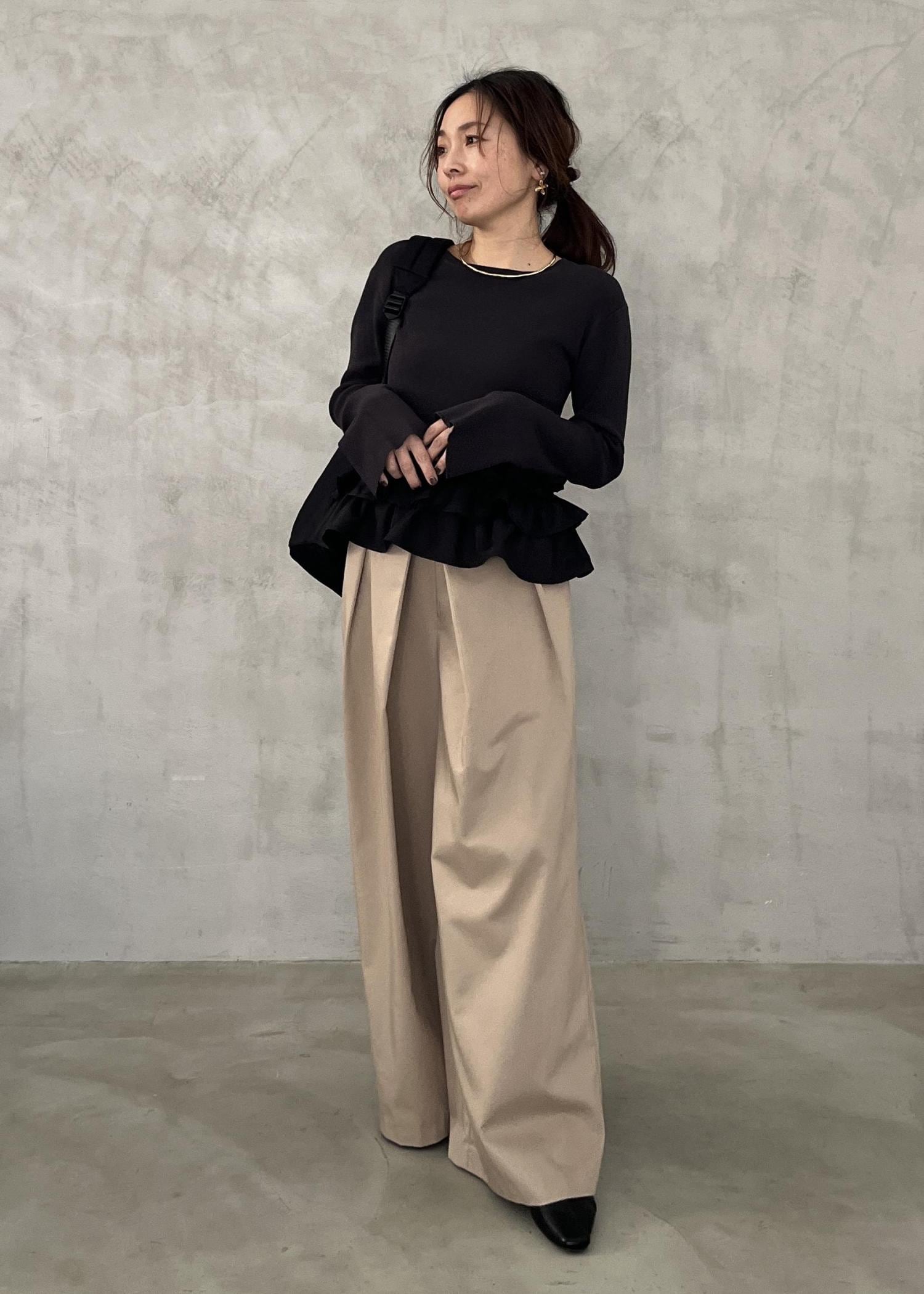 襟元と裾のフリルがアクセントとなり、一枚でおしゃれ見え、きちんと見えします。