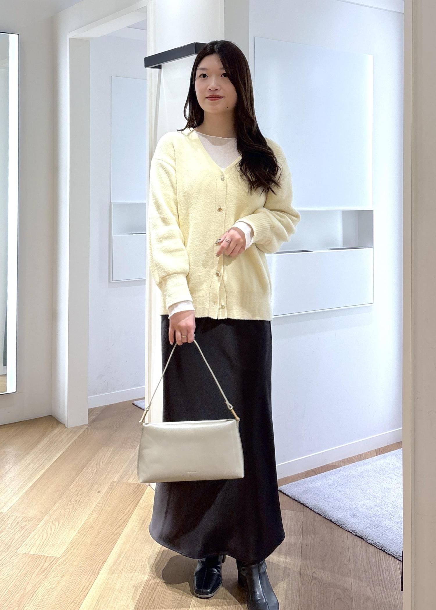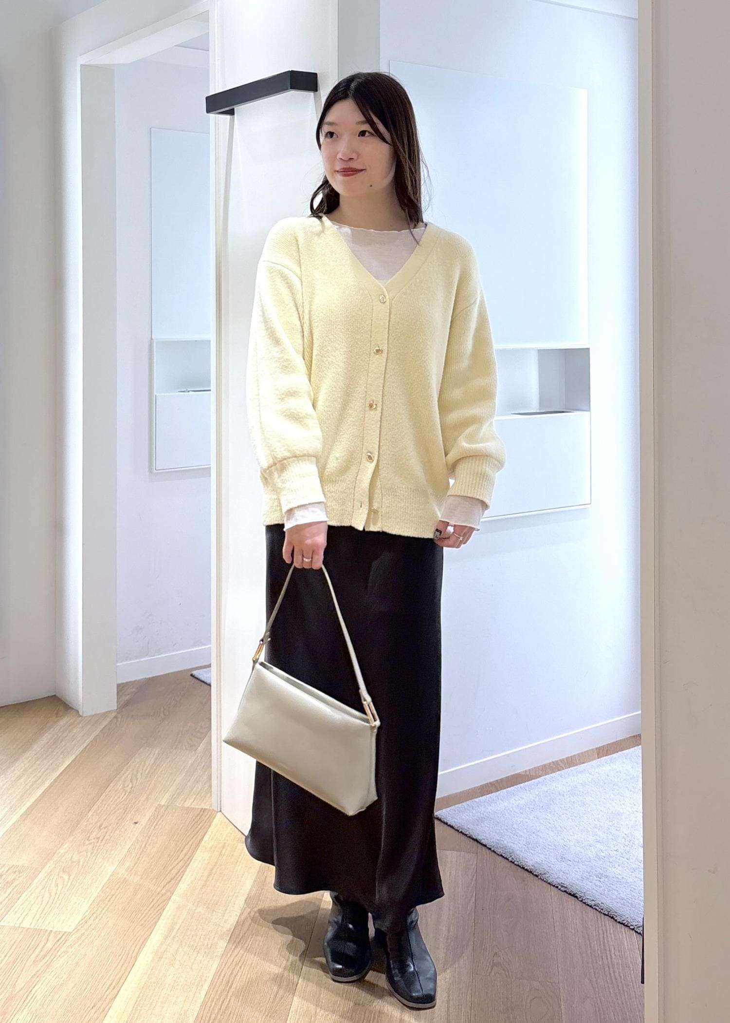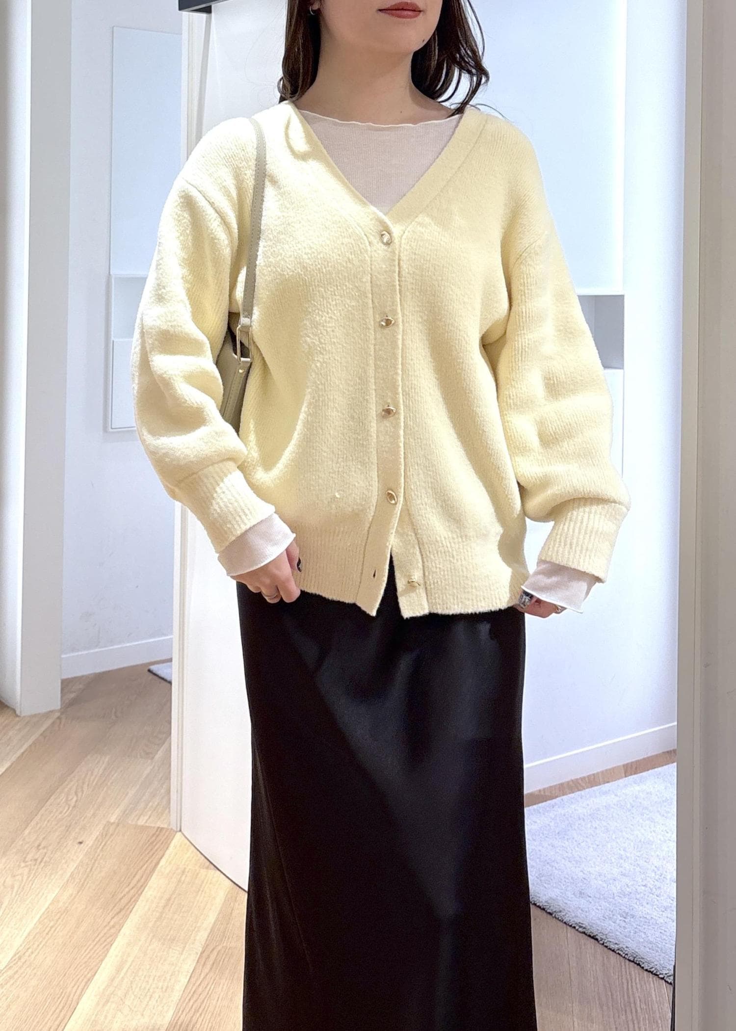 ゆったりと着られるカーディガンがとても可愛く、クリームのカラーが春らしさを取り入れられるコーデです♡