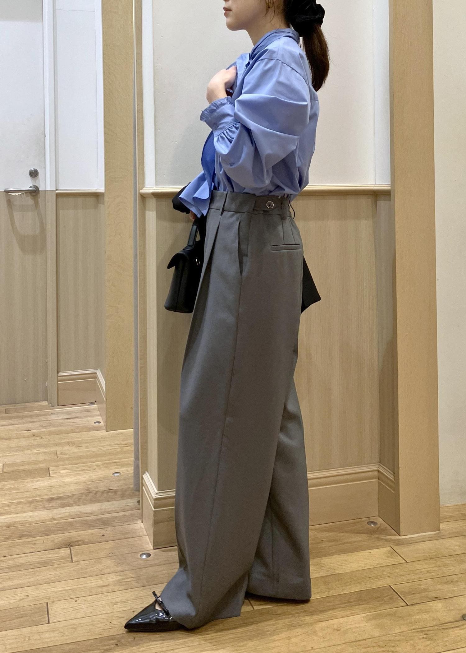 ワイドパンツは、ストンと落ちる綺麗なシルエットです。身長155cmで今回はゆるっと履きたかったので普段のボトムスより大きめのサイズのSサイズを着用してます。