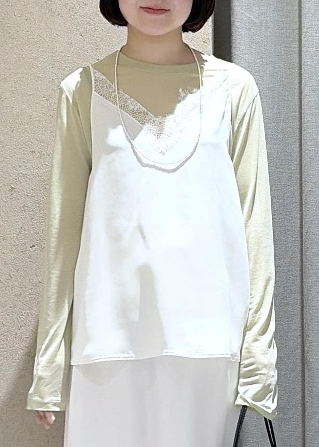 SALON adam et ropéフレンチレースフィブリルサテンキャミソールオフホワイト / F¥17,600レビュー身長155センチ普通体型でゆとりのあるサイズでした。ある程度肩紐は調節できるので夏場はヘルシーに肌見せもおすすめのアイテムです。裾にかけてAラインになっている分、肩紐の長さ次第でバストラインが気になる方でもある程度バランスはとれると思います。