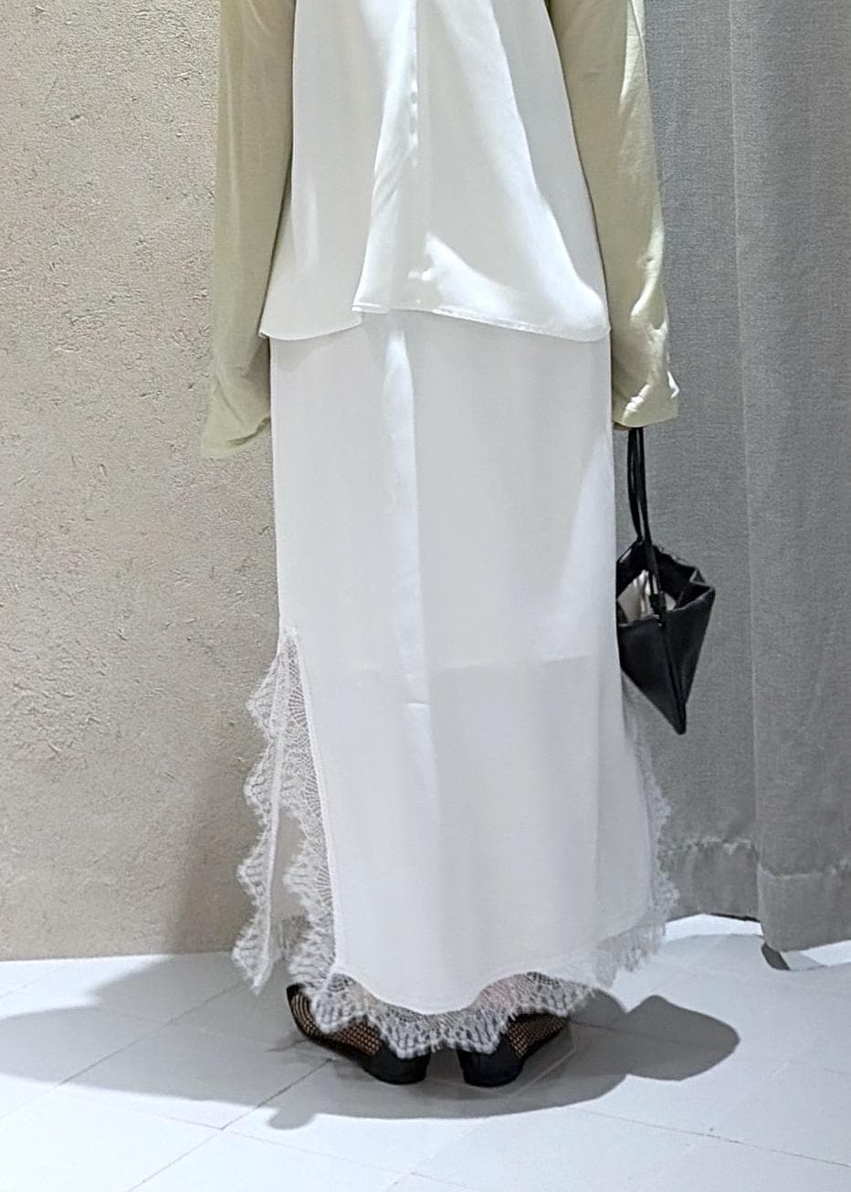 SALON adam et ropéフレンチレースパネルスカートオフホワイト / F¥25,300レビュー身長155センチが骨盤上ぐらいで着用してくるぶしにかかる程度の丈です。ホワイトはペチコートがついていますが濃いカラーのインナーは透けるので透けないようなベージュカラーのインナーで合わせるのが安心です。ウエストも紐で調節可能なのでストレスもなく着心地も良いです。