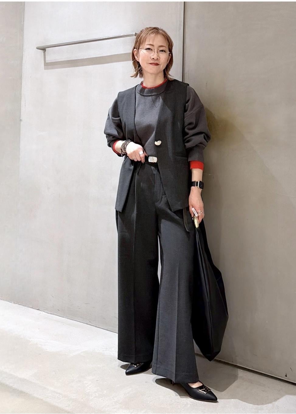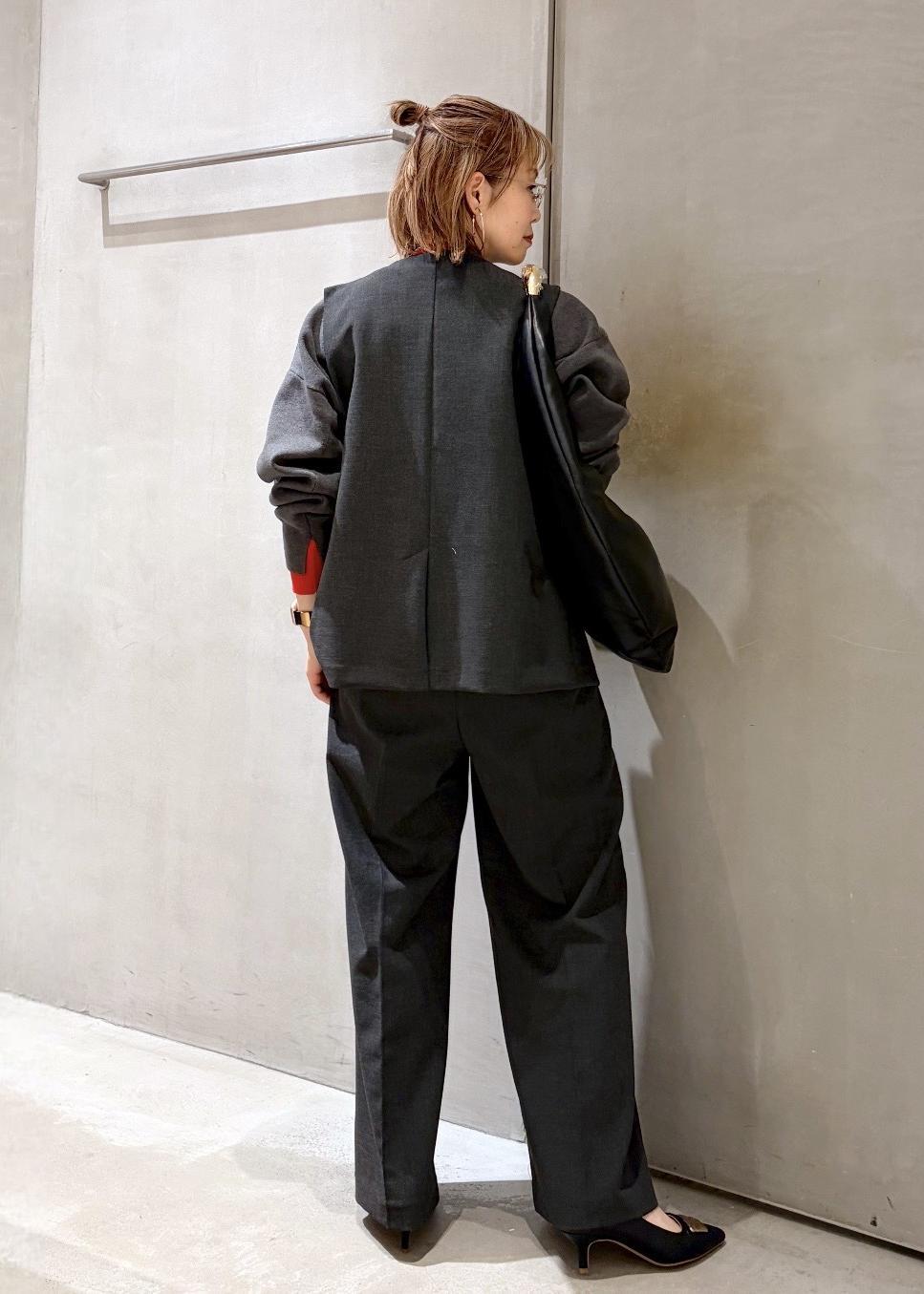 今回は普段使いもしやすいジレのセットアップに、レイヤードニットをインしました。