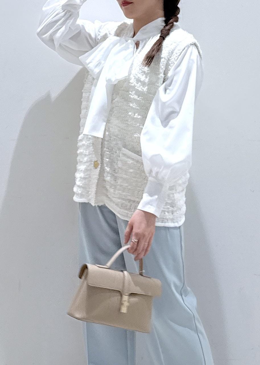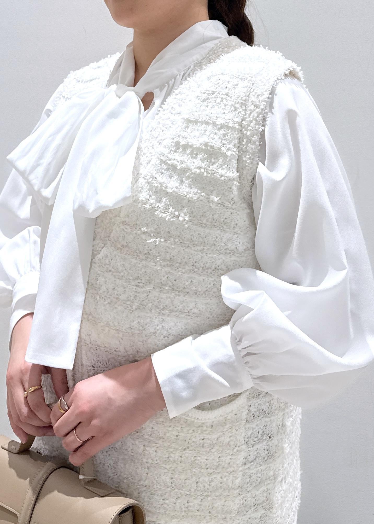 生地感薄めでサラッとしておりとても着やすいです。ボウタイ部分は意外と大きめでボリュームがあるので、小顔効果抜群◎3色とも裏地付きではありますが透け感があります。オフホワイトだとお袖部分から肌が見えました。 -