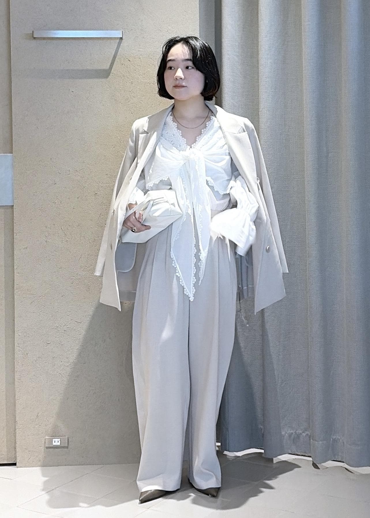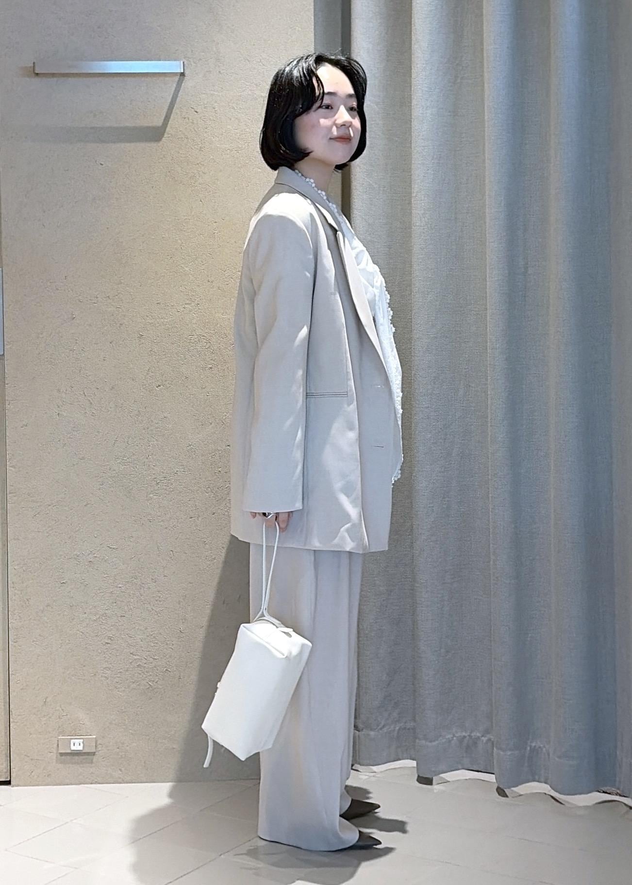 そこまでカッチリするスタイルは苦手だけどお食事会や謝恩会など普段も使えるコーディネートのぴったりのリネンのセットアップでコーディネートしてみました。春らしい柔らかなベージュでワントーンで今っぽく決まります。また、インナーにはイチオシのレースブラウスで合わせレディ感もプラスしてみました。