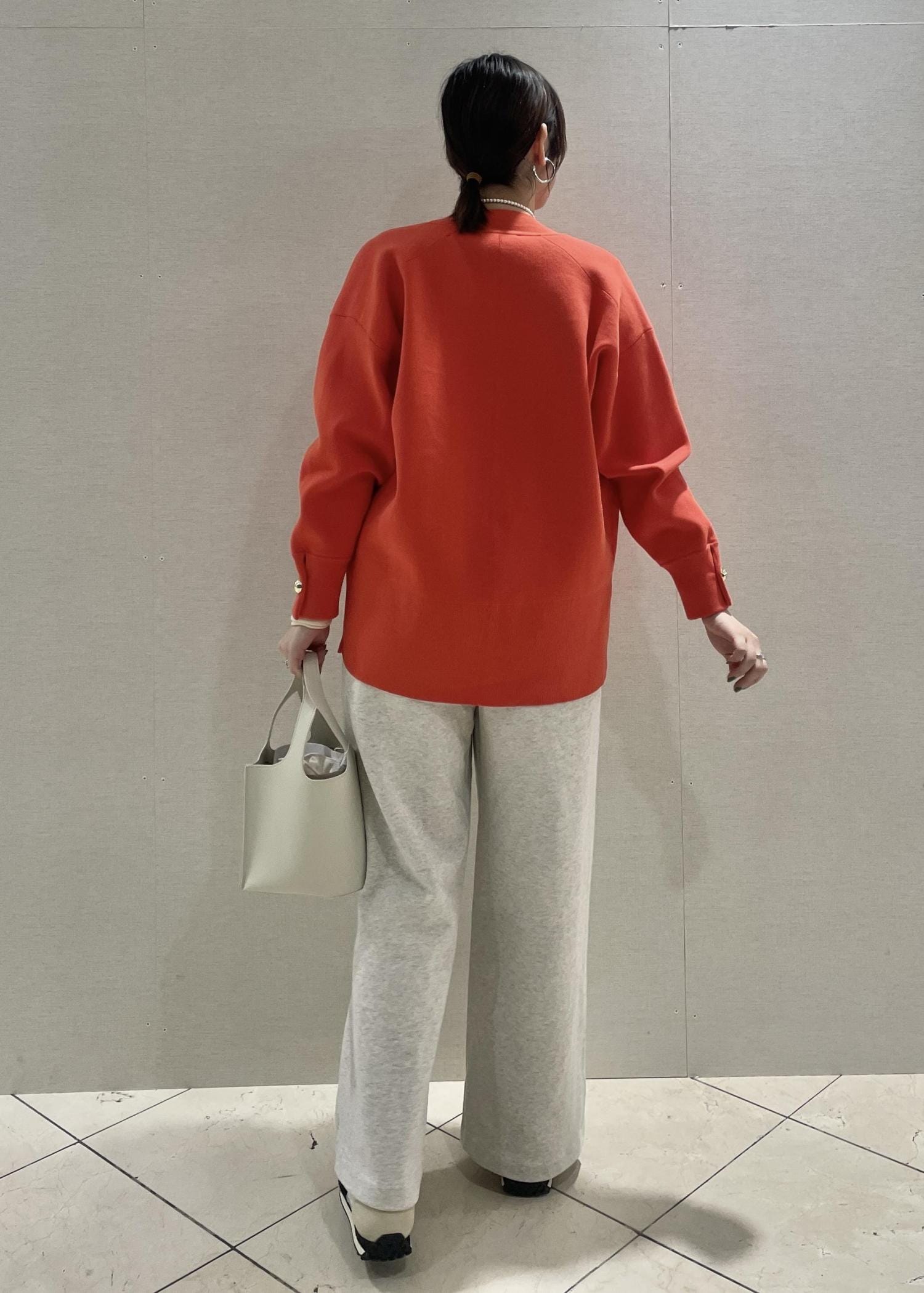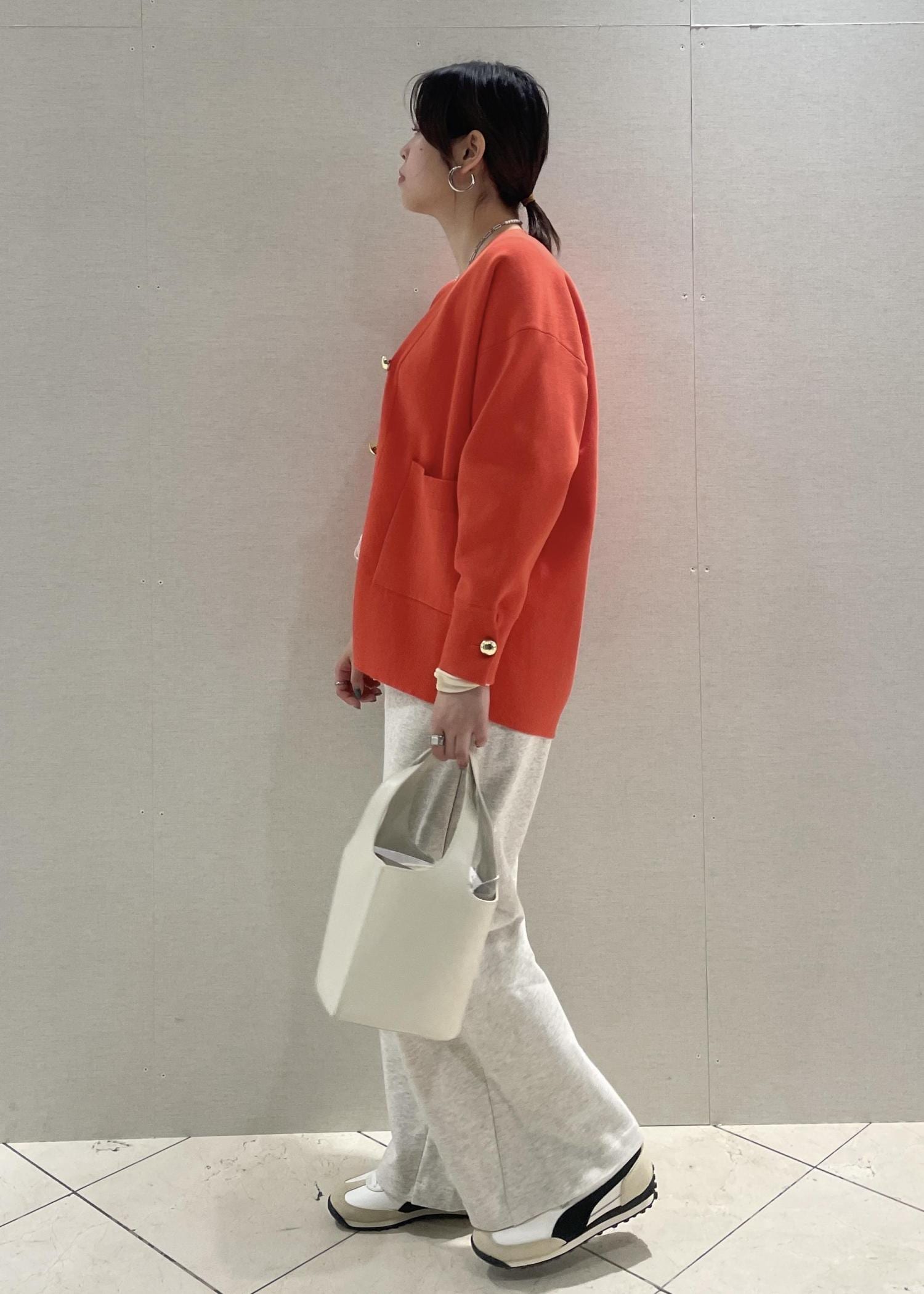 差し色として使っているオレンジのカーディガンを引き立たせるために、他のアイテムには淡いベージュや白をチョイスしております☺︎