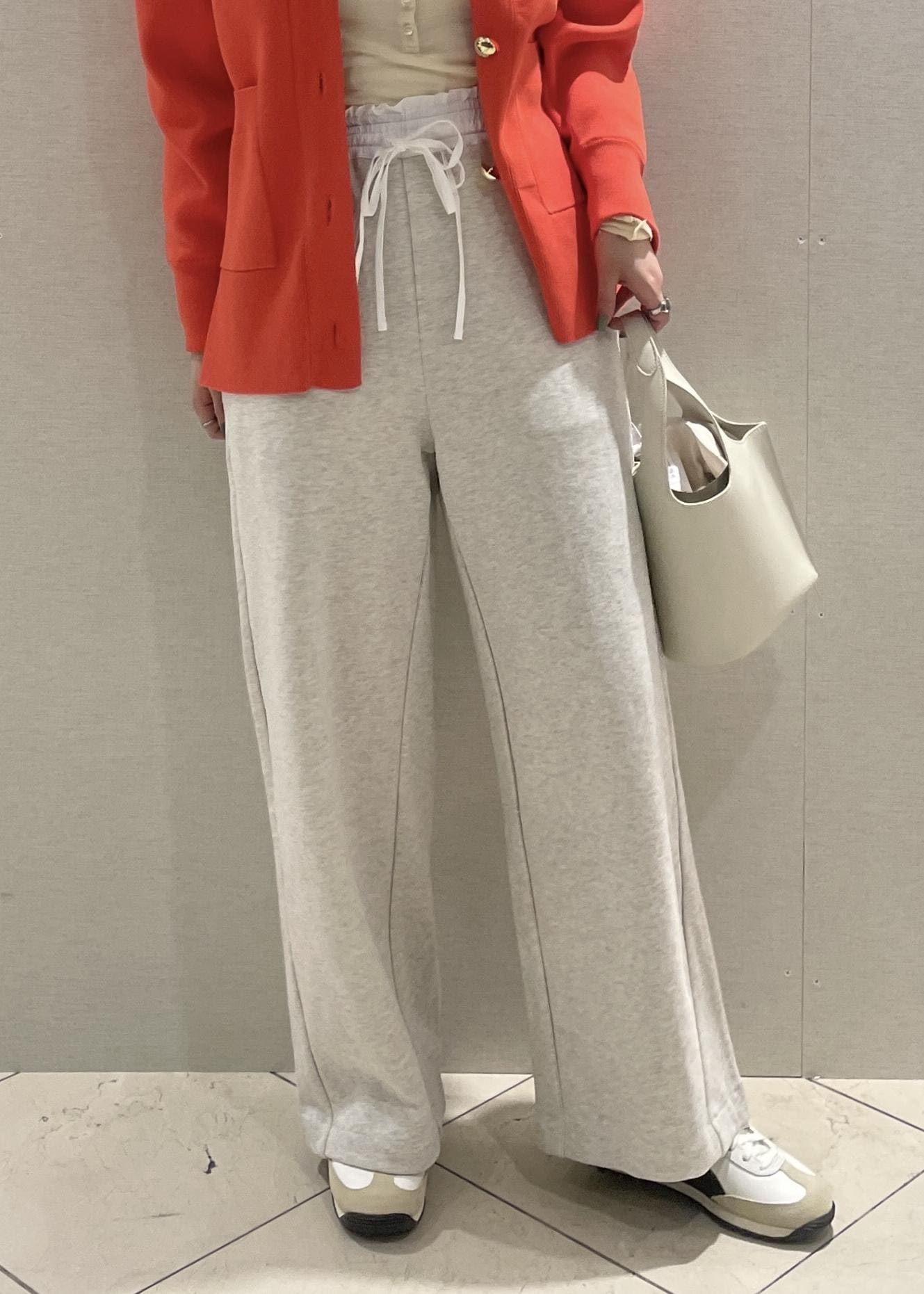 ボトムスに履いているスウェットはウエスト部分がフリルになっているので程よく華やかさ、外着感を演出してくれます◎