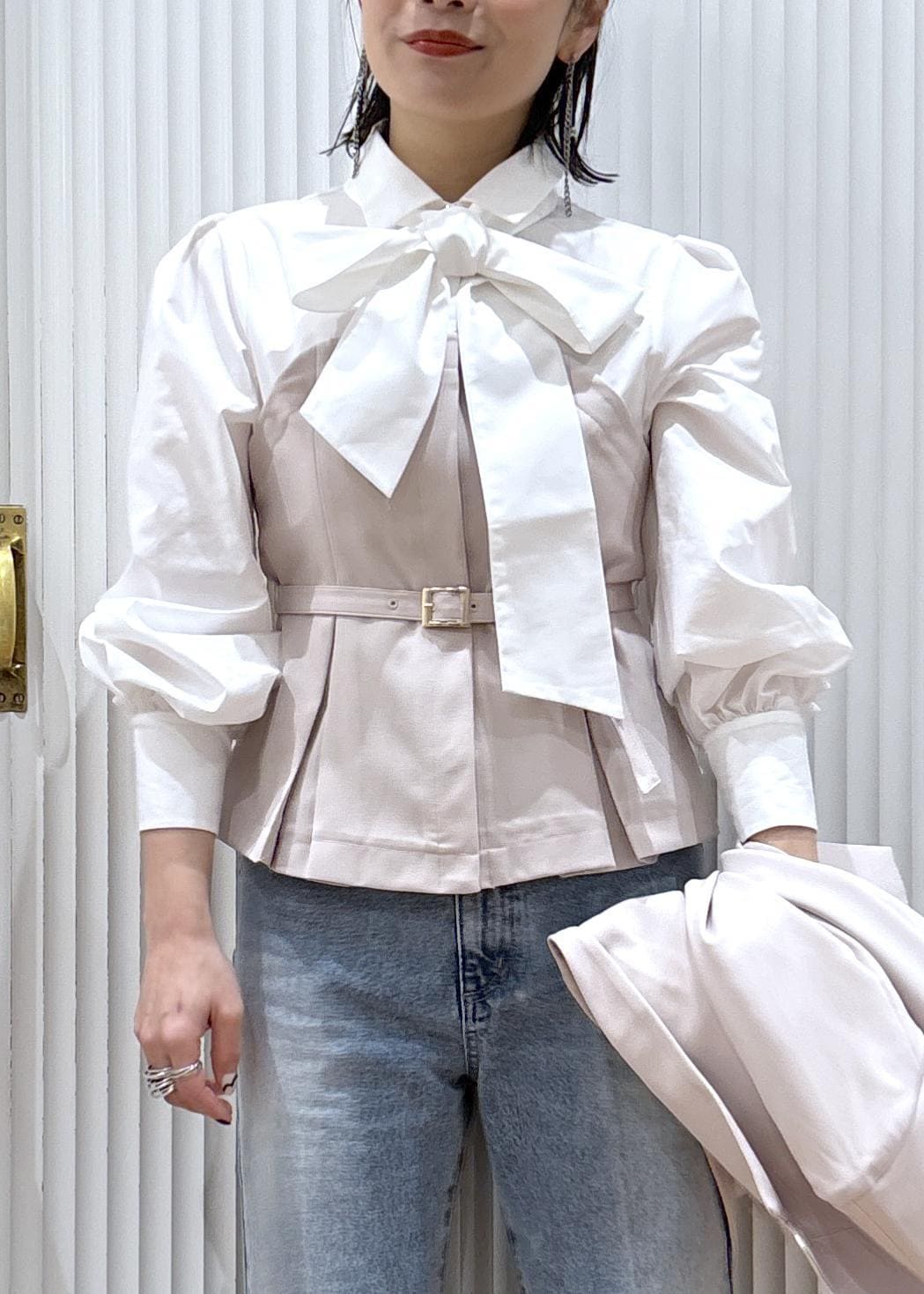 VIS【美easy】コンフォートボウタイドッキングシャツ/イージーケア・2WAYベージュ / F¥6,589レビュー157cmで肩周りや身幅のサイズ感はジャスト。長さは腰にかかる着丈です。シャツ部分ははりがありキチンと感のあるビスチェトップス。リボンは取り外しが出来るので用途に合わせてスタイリング出来ます。