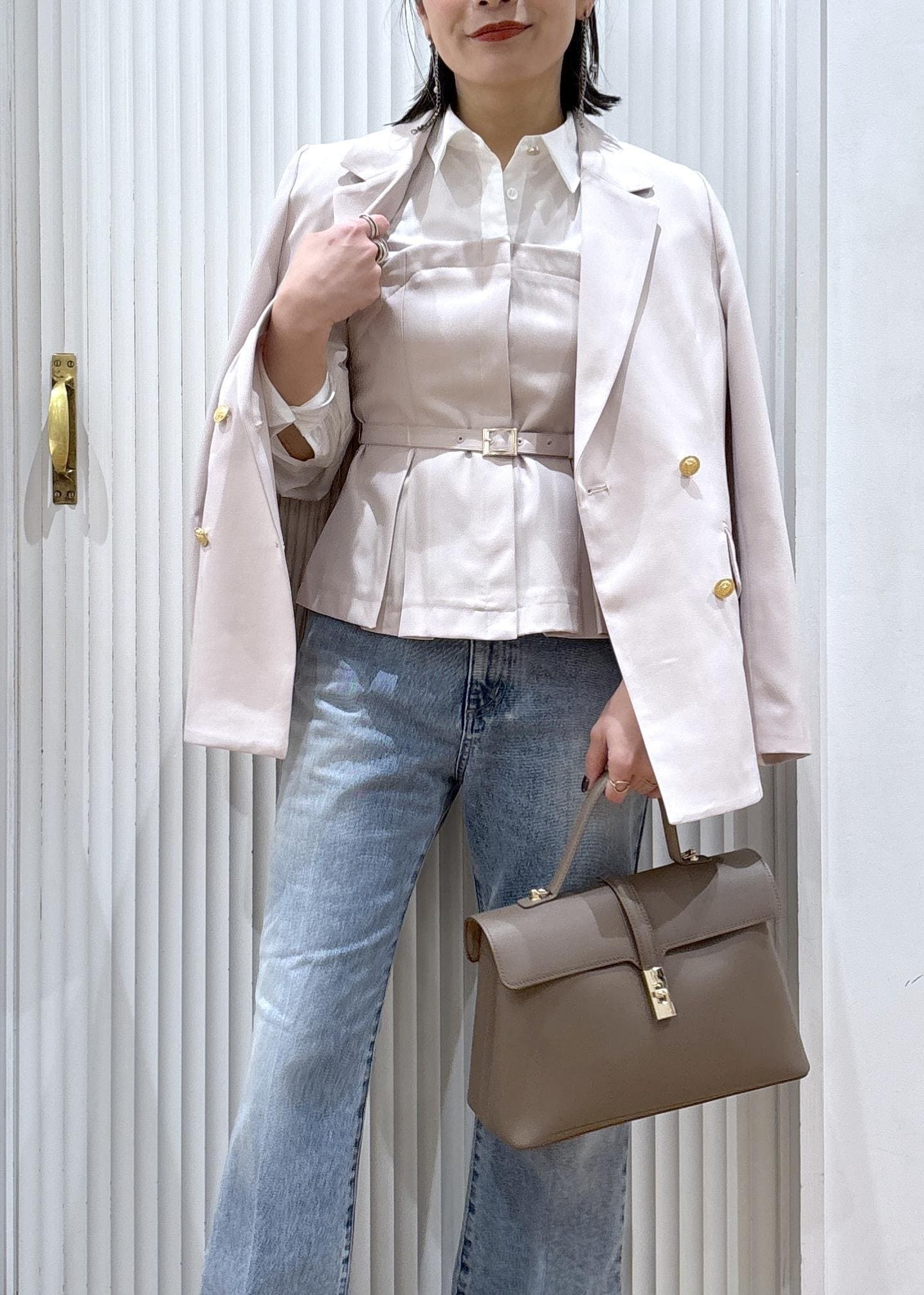 VIS【美easy】コンフォート金ボタンジャケット/イージーケア・UVケア・セットアップ対応ベージュ / S¥8,899レビュー157cm、Sサイズで肩周りや身幅のサイズ感はジャスト。長さはお尻にかかる着丈です。長袖のインナーを着用してジャストサイズなのでややゆったり着用したい方はサイズアップがお勧め。裏地はストライプ柄でポイントになるので袖を折り返しても可愛いです。