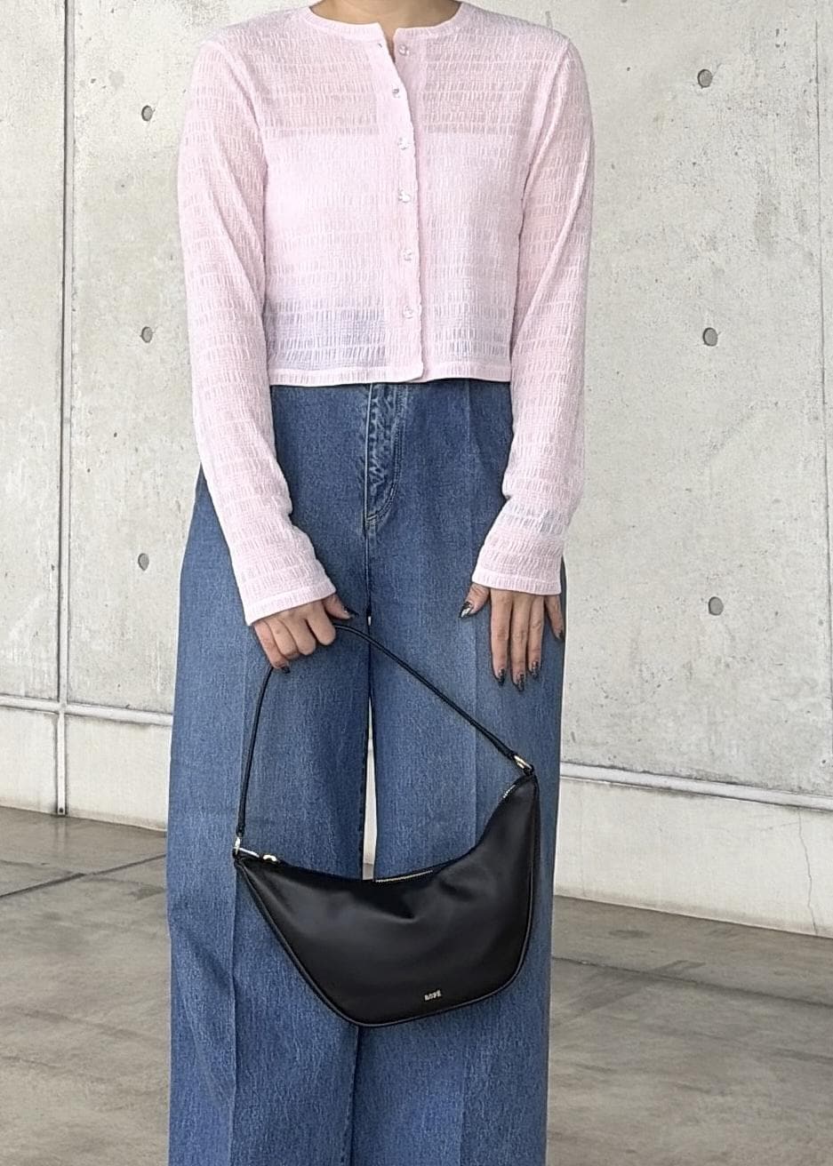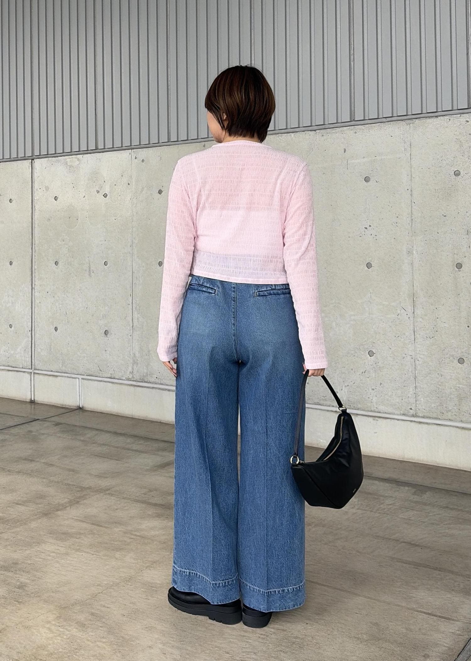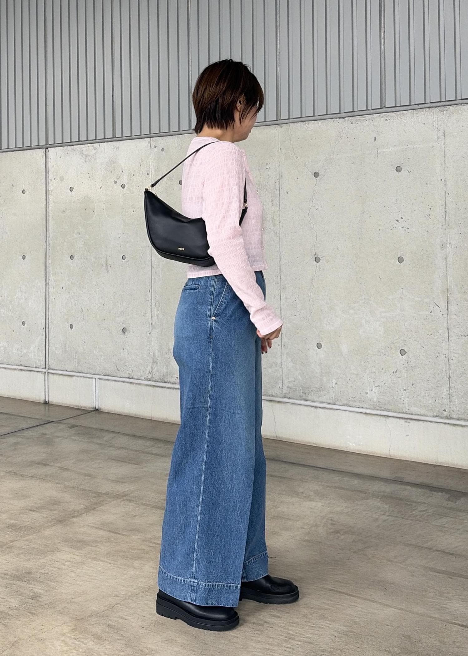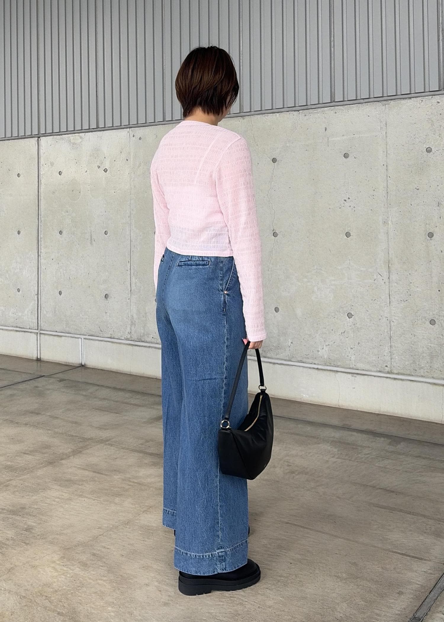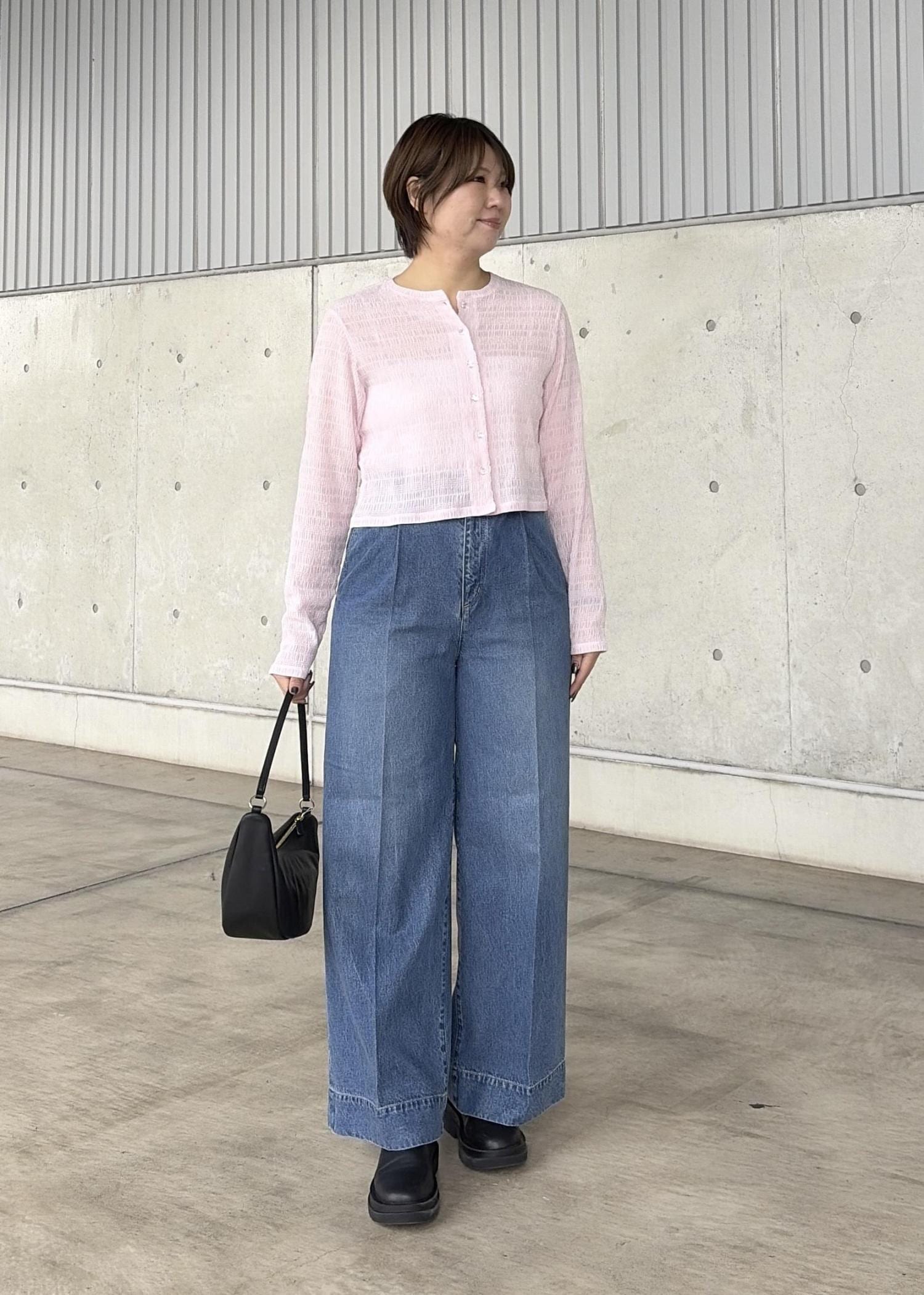 着丈はコンパクトですが、ハイウエストのボトムとは合わせやすく、スタイルアップ見えします。 -