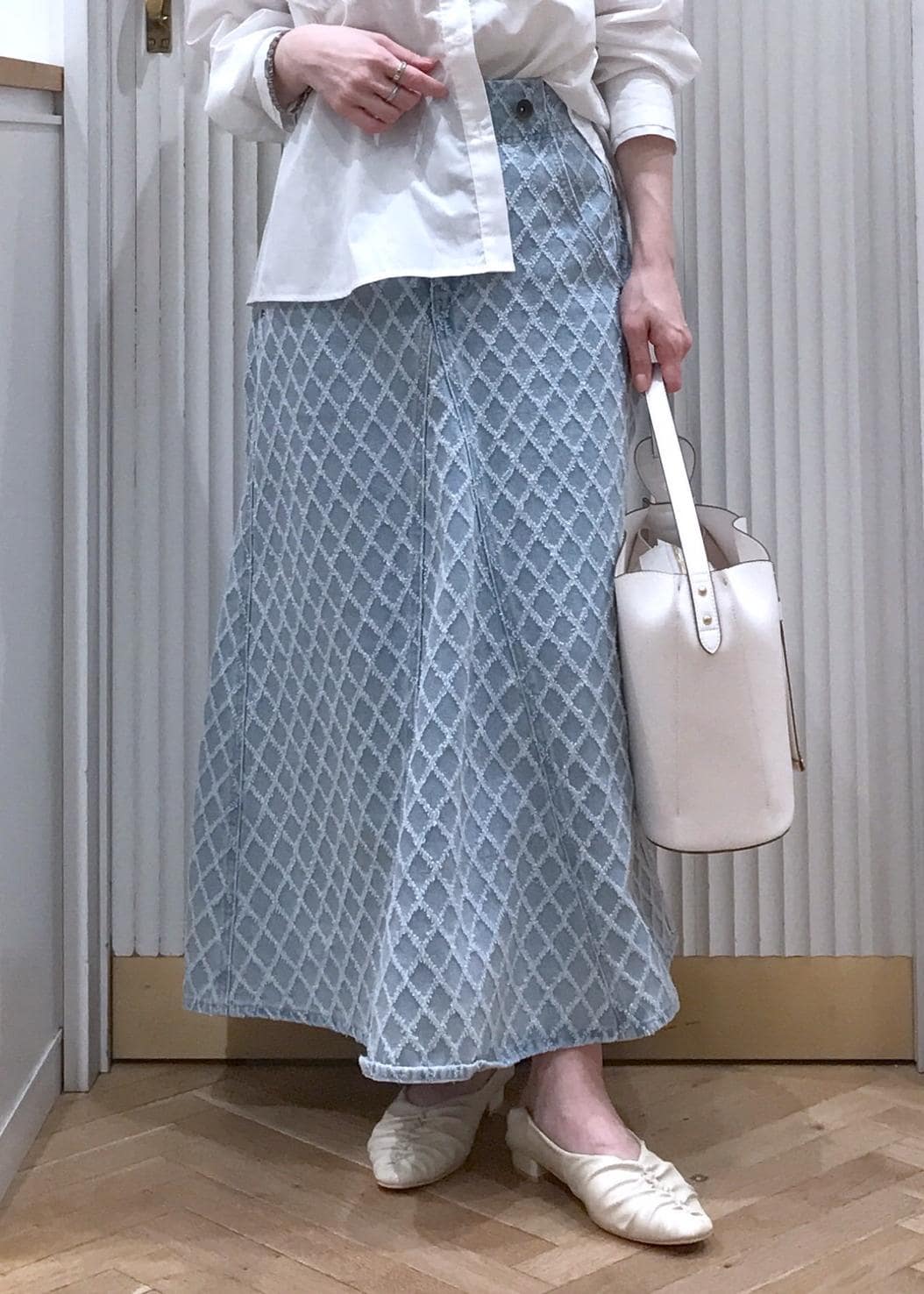 目を引く柄デニムはベーシックなシャツと合わせれば程よいカジュアル感で大人っぽくスタイリングできますよ。