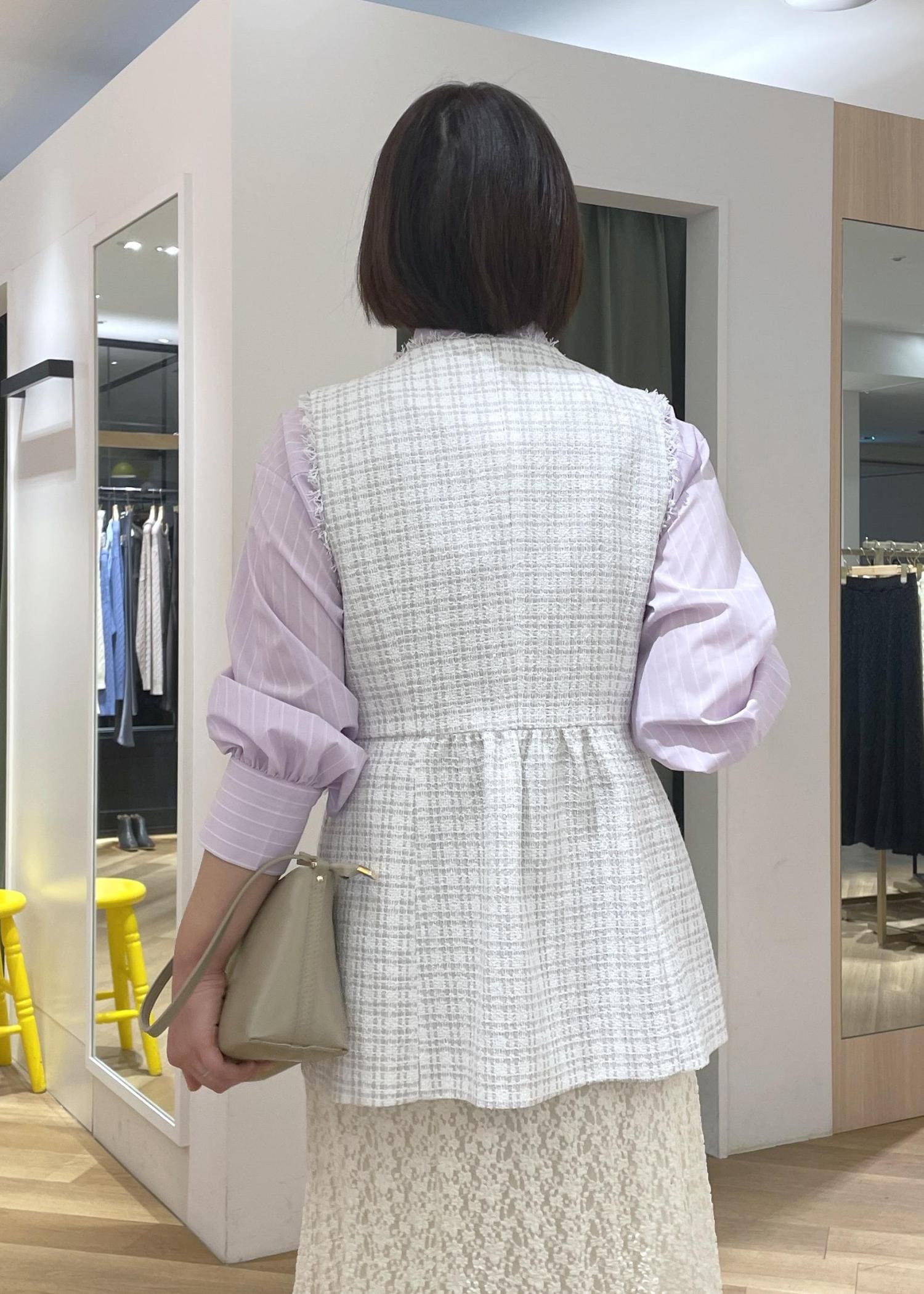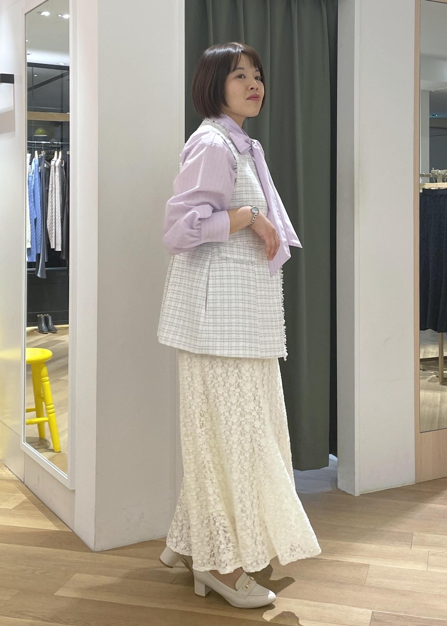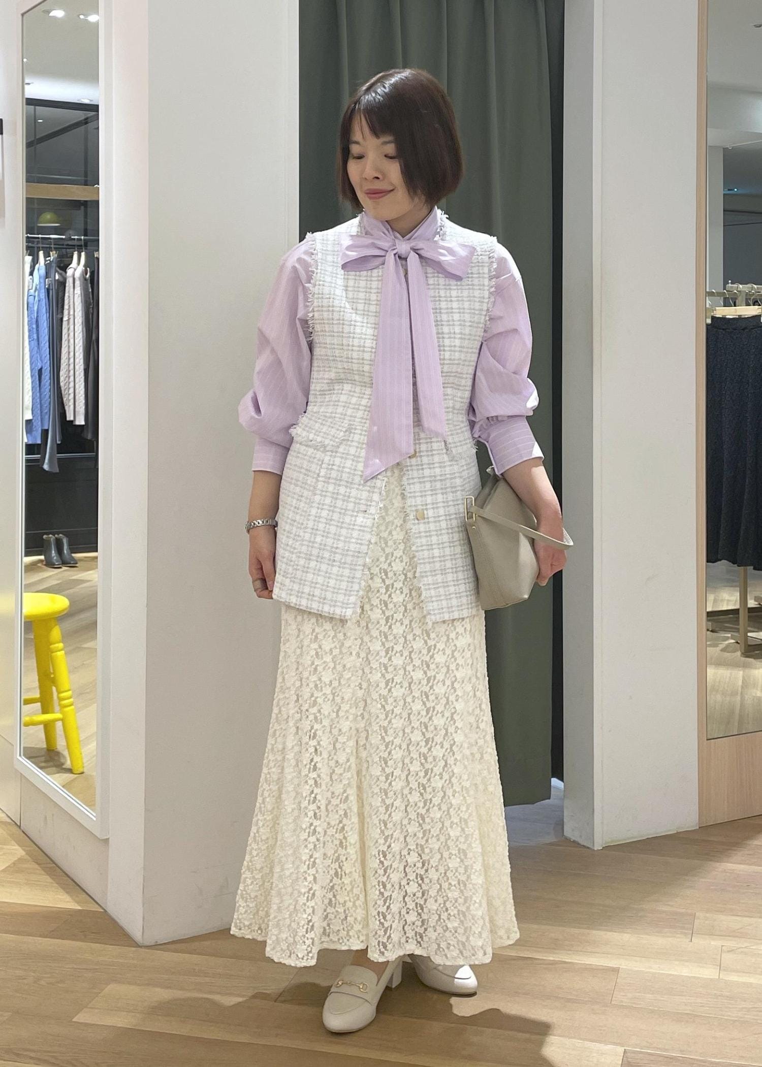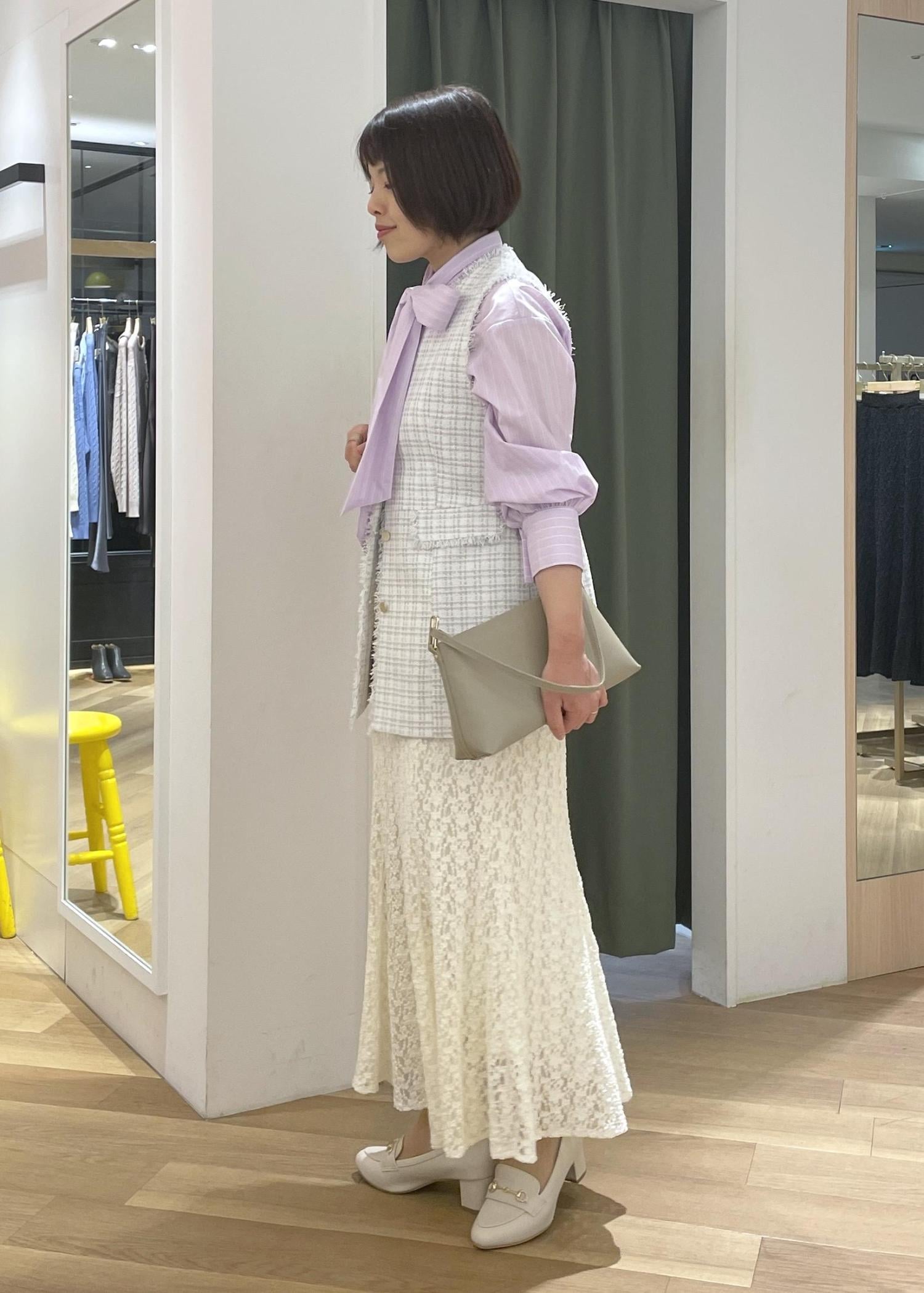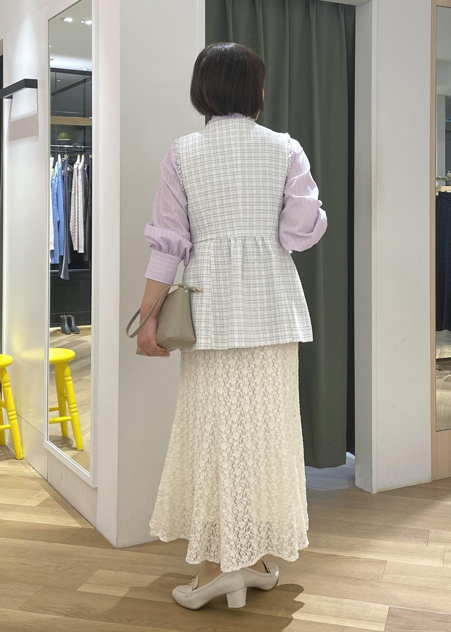 ツイードジレとレーススカートは近いカラーで合わせて、パープルのシャツが映えるコーデに◎
