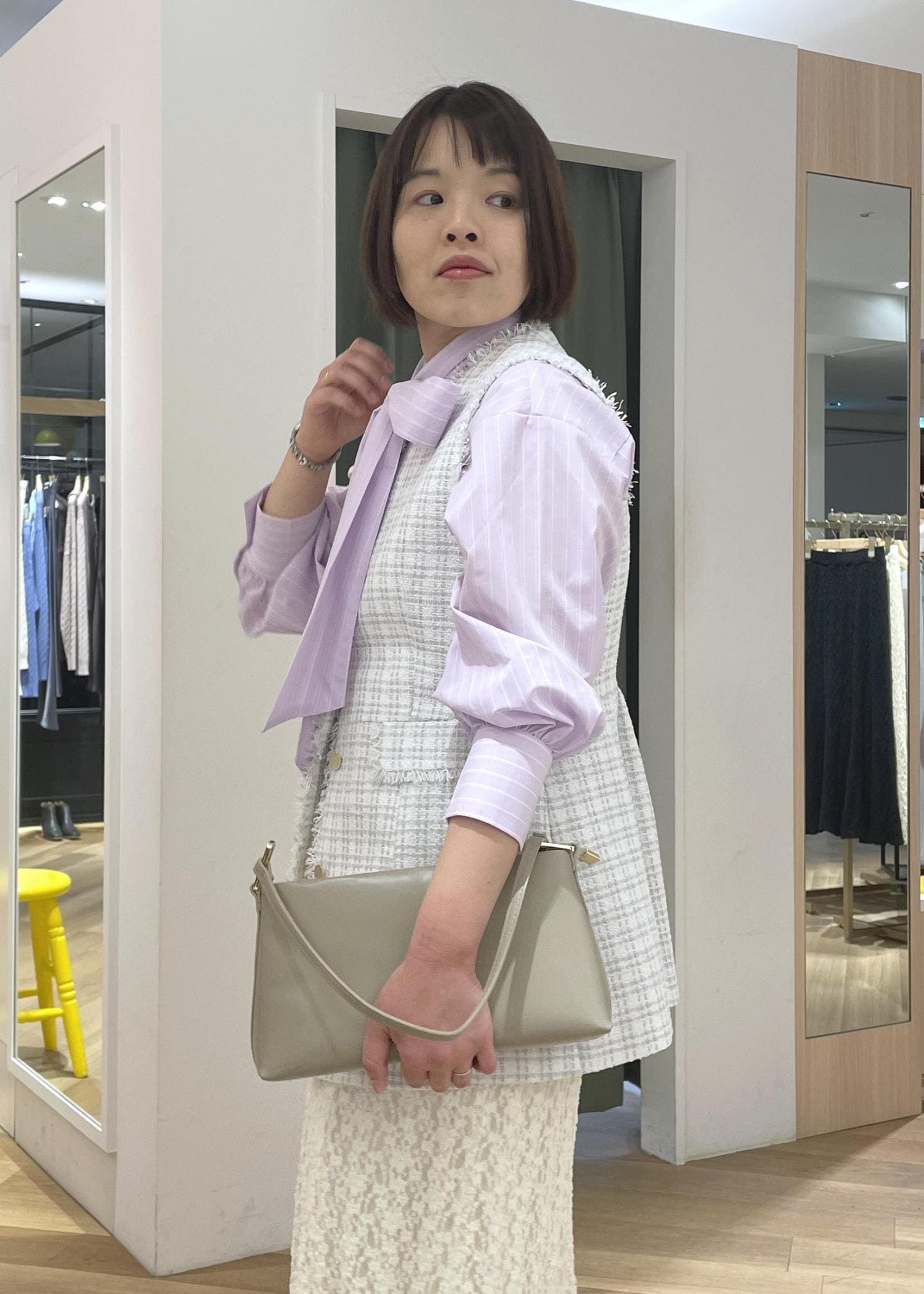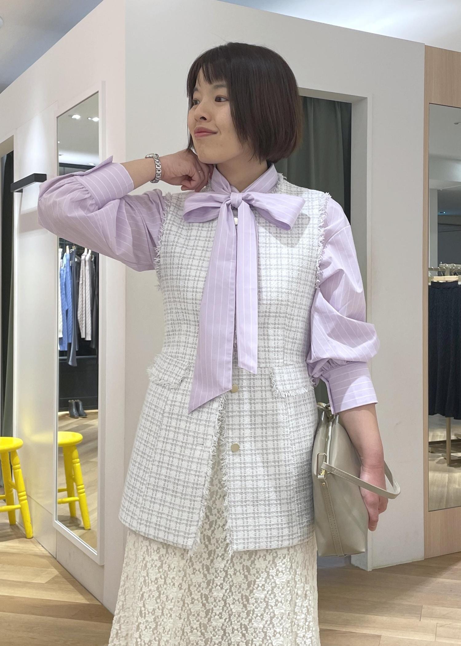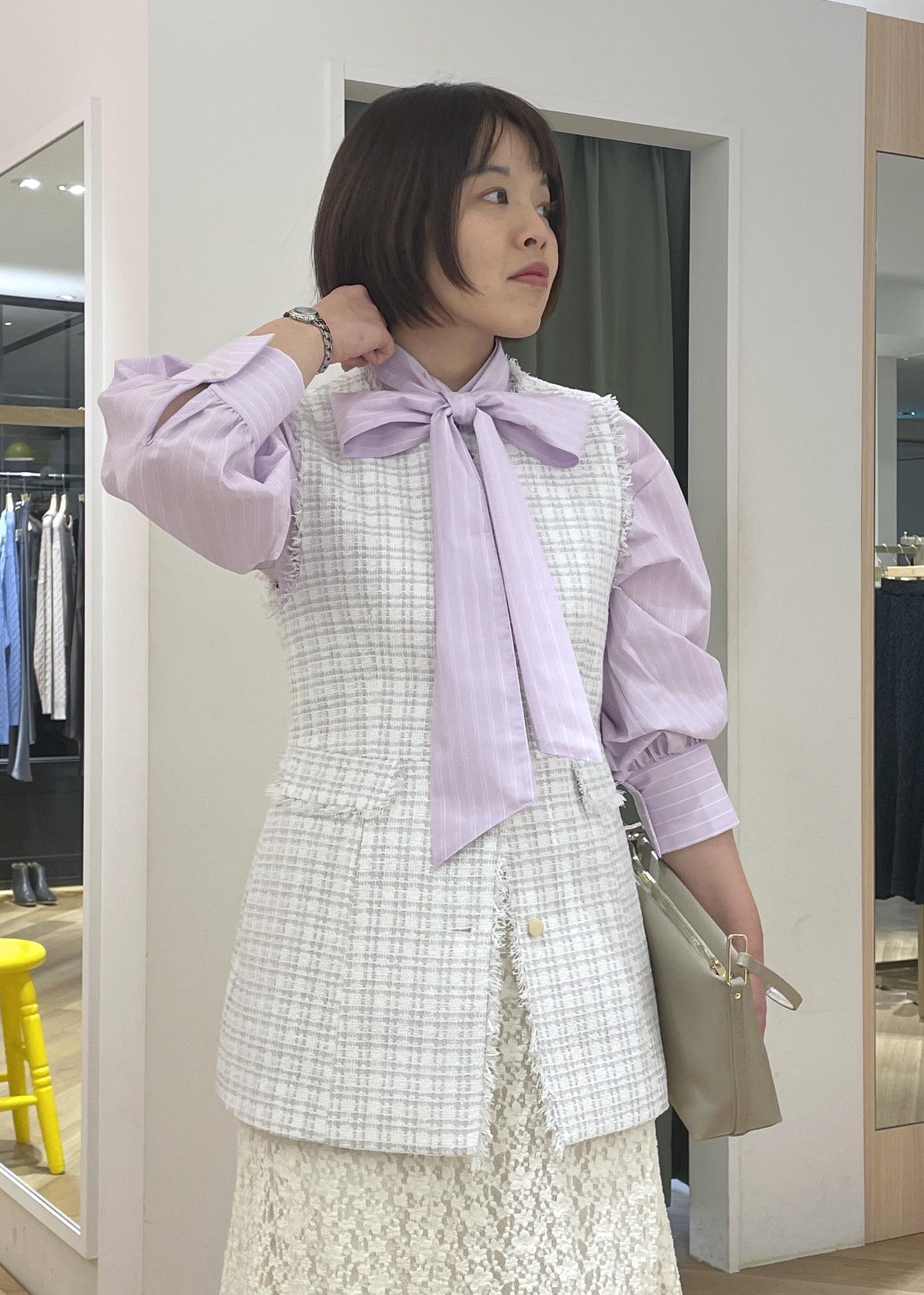 ツイードジレにリボンタイシャツを合わせた、女性らしさのある華やぎコーデです!
