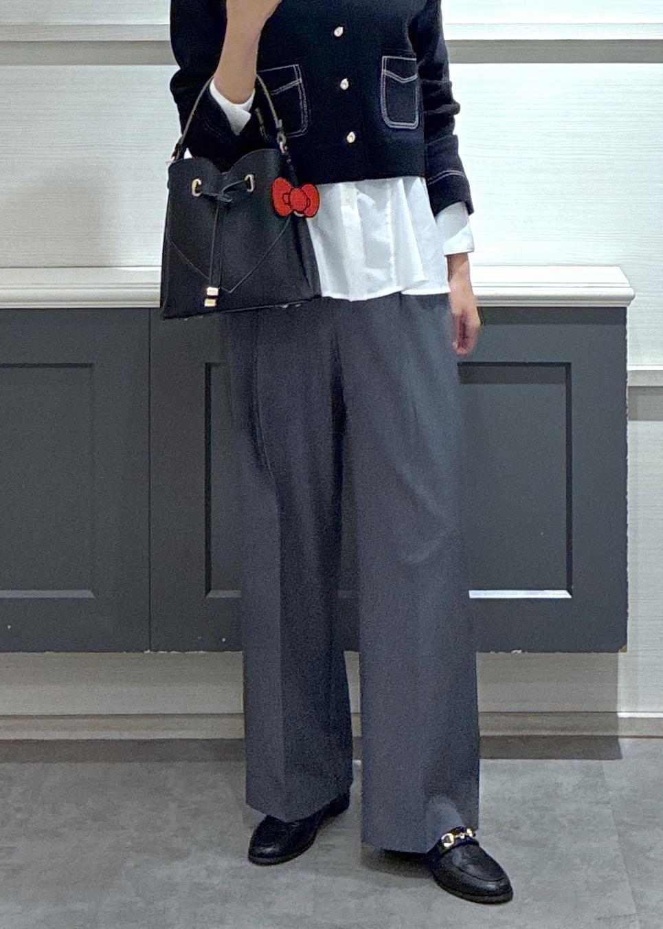カーディガンのネイビー色と相性の良いグレーのパンツを選ぶとキャラクターバッグも幼くなり過ぎず、大人でも楽しめました♡