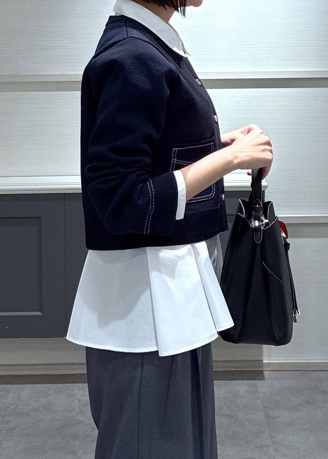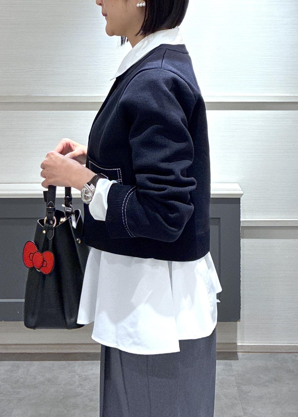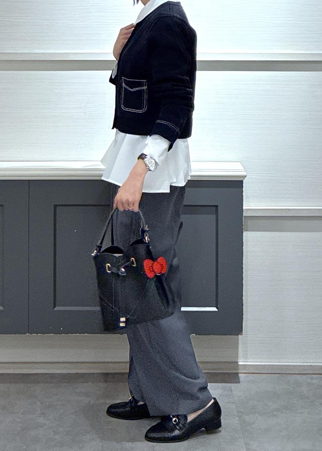 遊び心のあるステッチカーディガンはハローキティのバッグのかわいい世界観とマッチしていて、着ると春が待ち遠しくなるコーデです♪