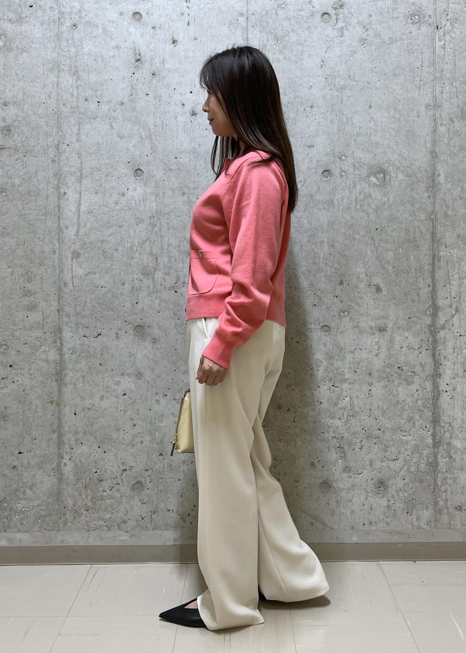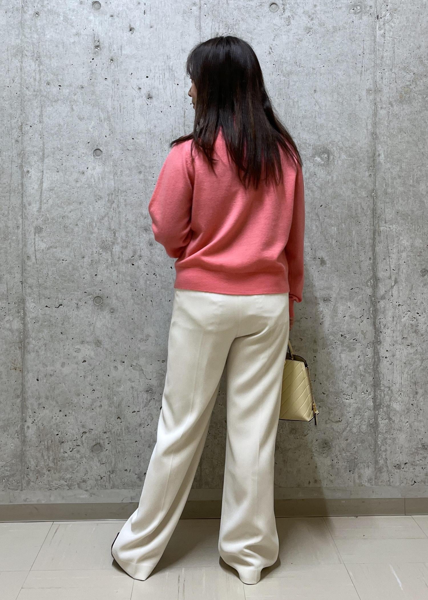 トップスはウールとカシミヤが入っているので、今の時期から春まで着れて長く着用できるスタイルです。