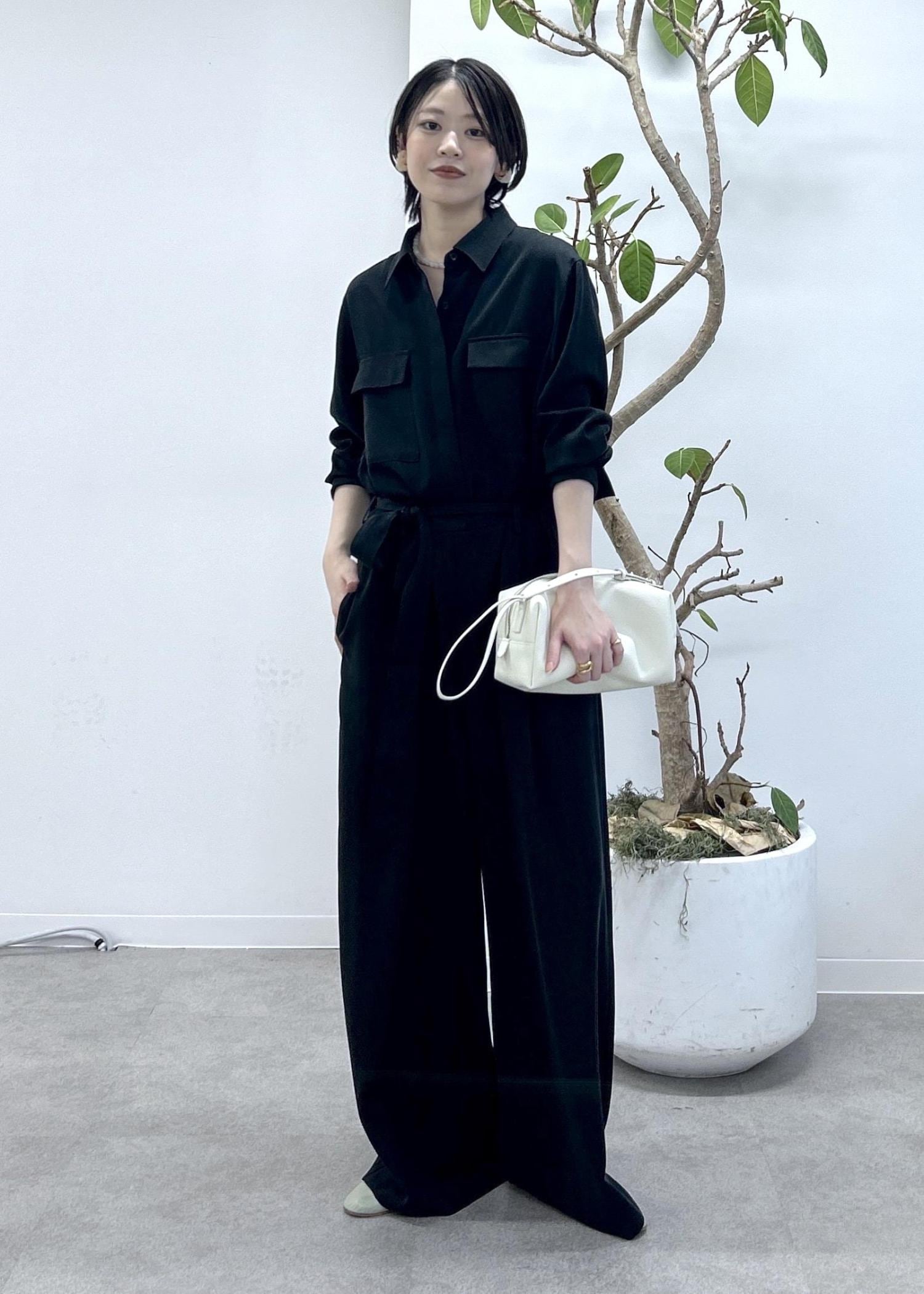 全体的にブラックだと暗くなってしまうので、シャツはあえてブルーをチョイスしました。