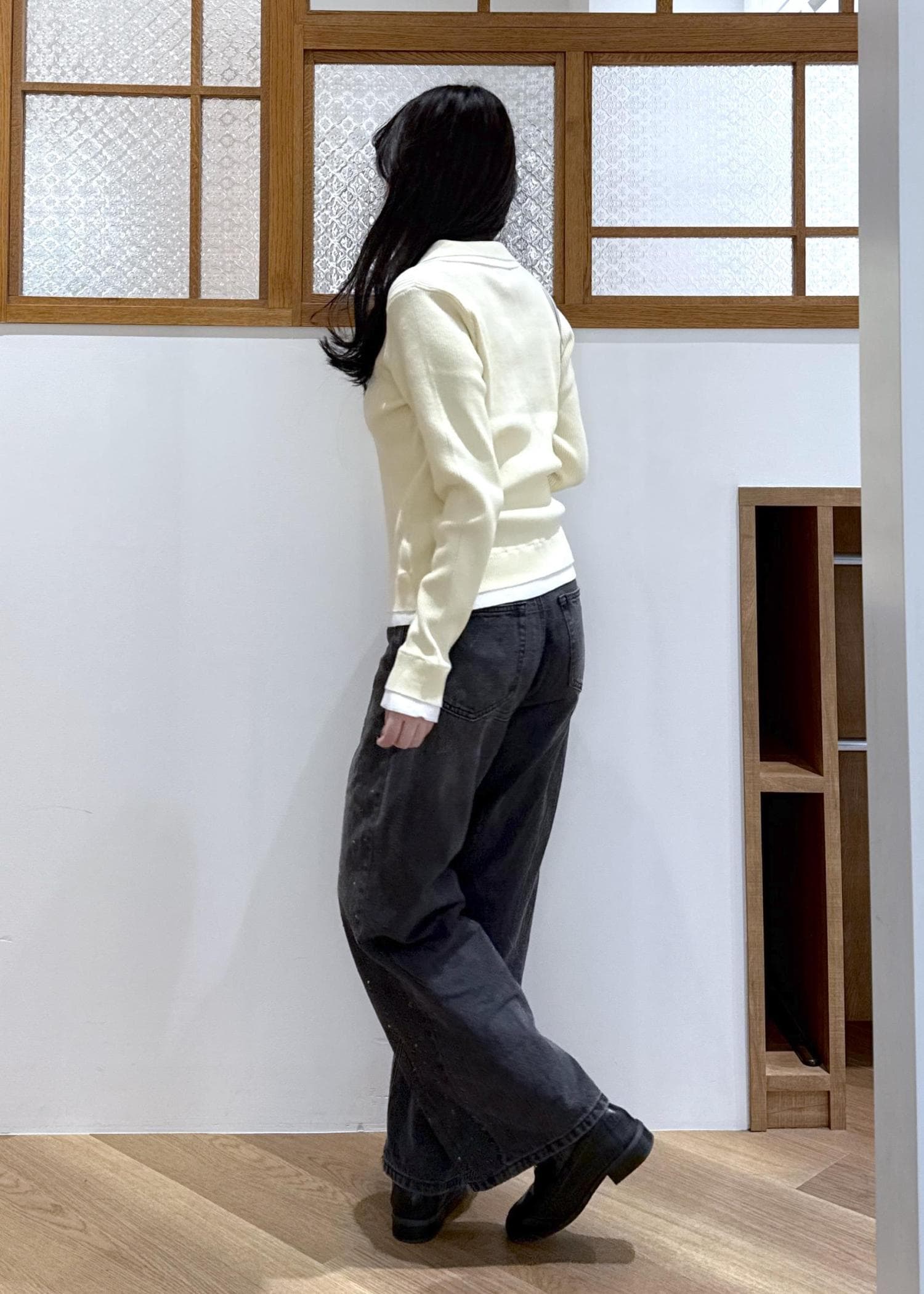 形はワイドめのシルエットで脚のラインを拾いにくいです。腰あたりからまっすぐ落ちるラインが綺麗です。 -
