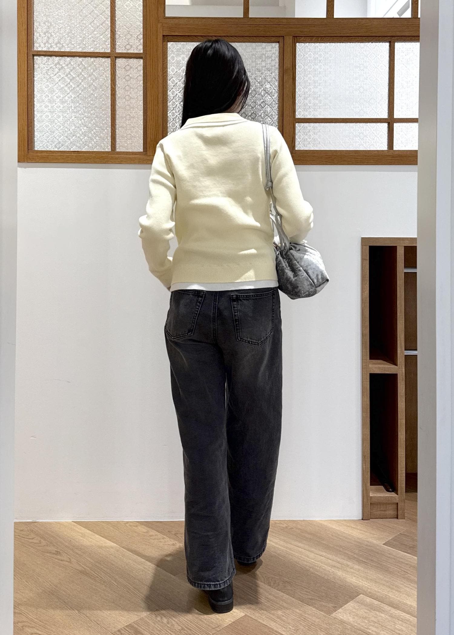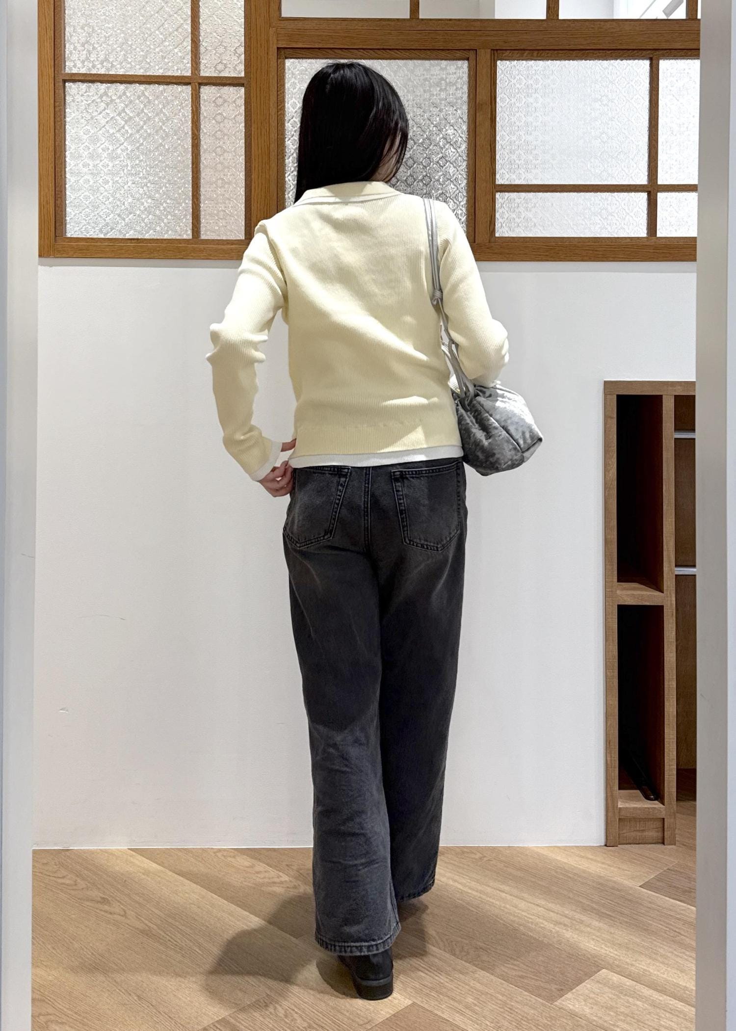 シルバーのバッグを合わせて、シャレ感をプラスしました。