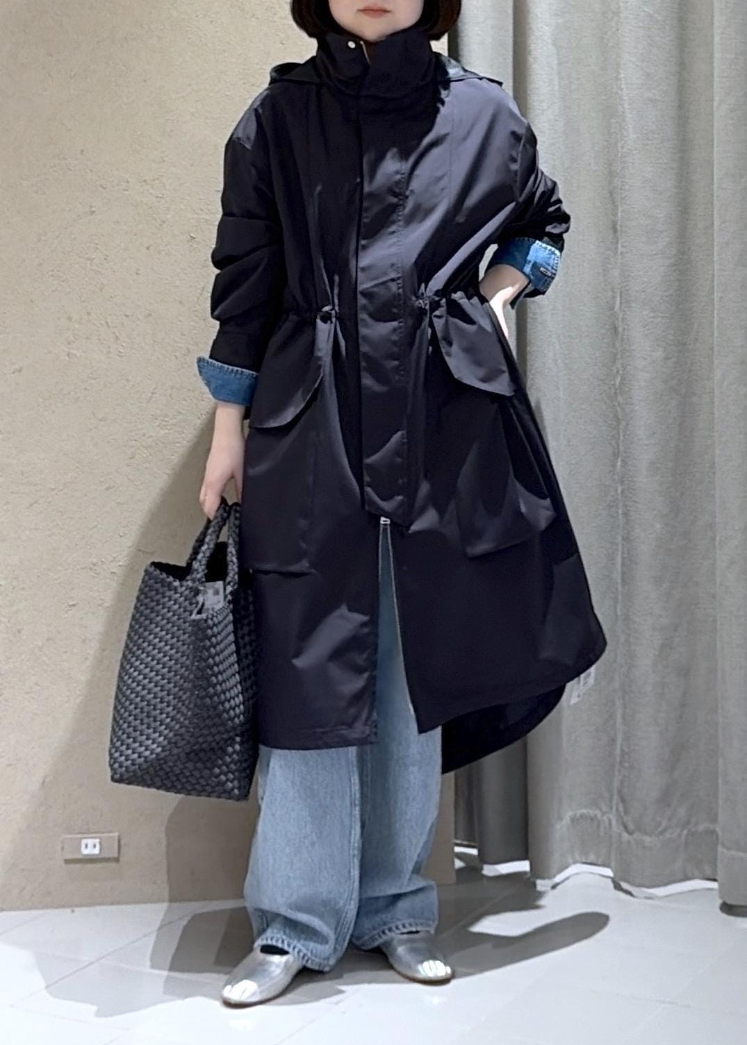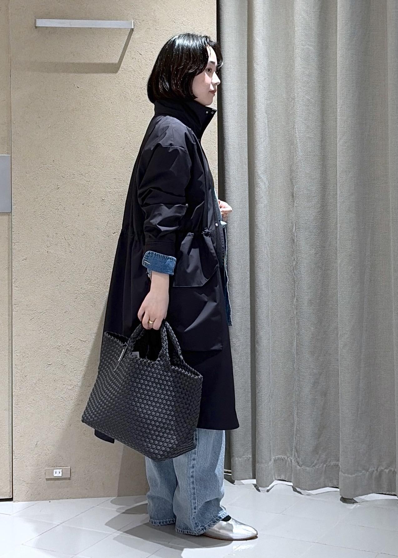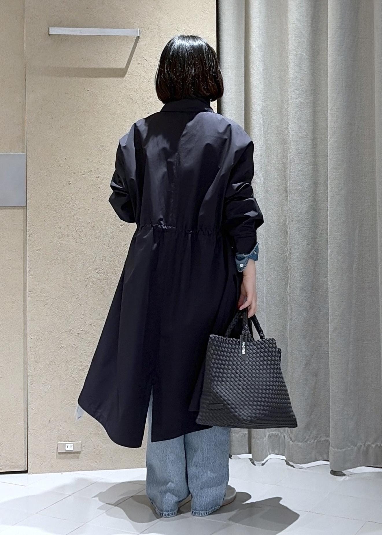 ミリタリーコート、デニムと全体的にカジュアルなコーディネートなのでナゲディのバッグで綺麗めな雰囲気もプラスしてみました。こちらのバッグもウェットスーツと同じお素材でお天気の悪い日にもおすすめです。