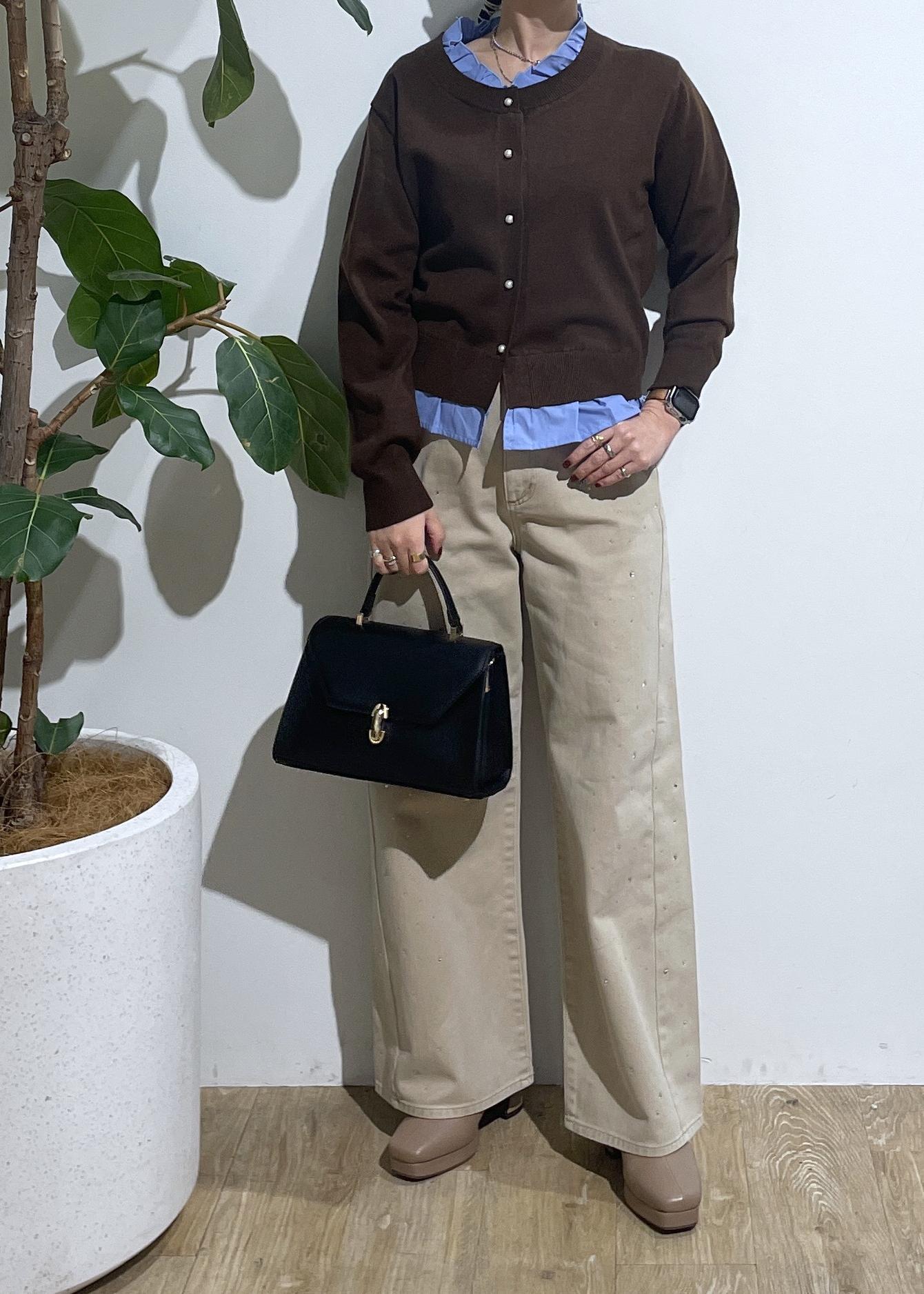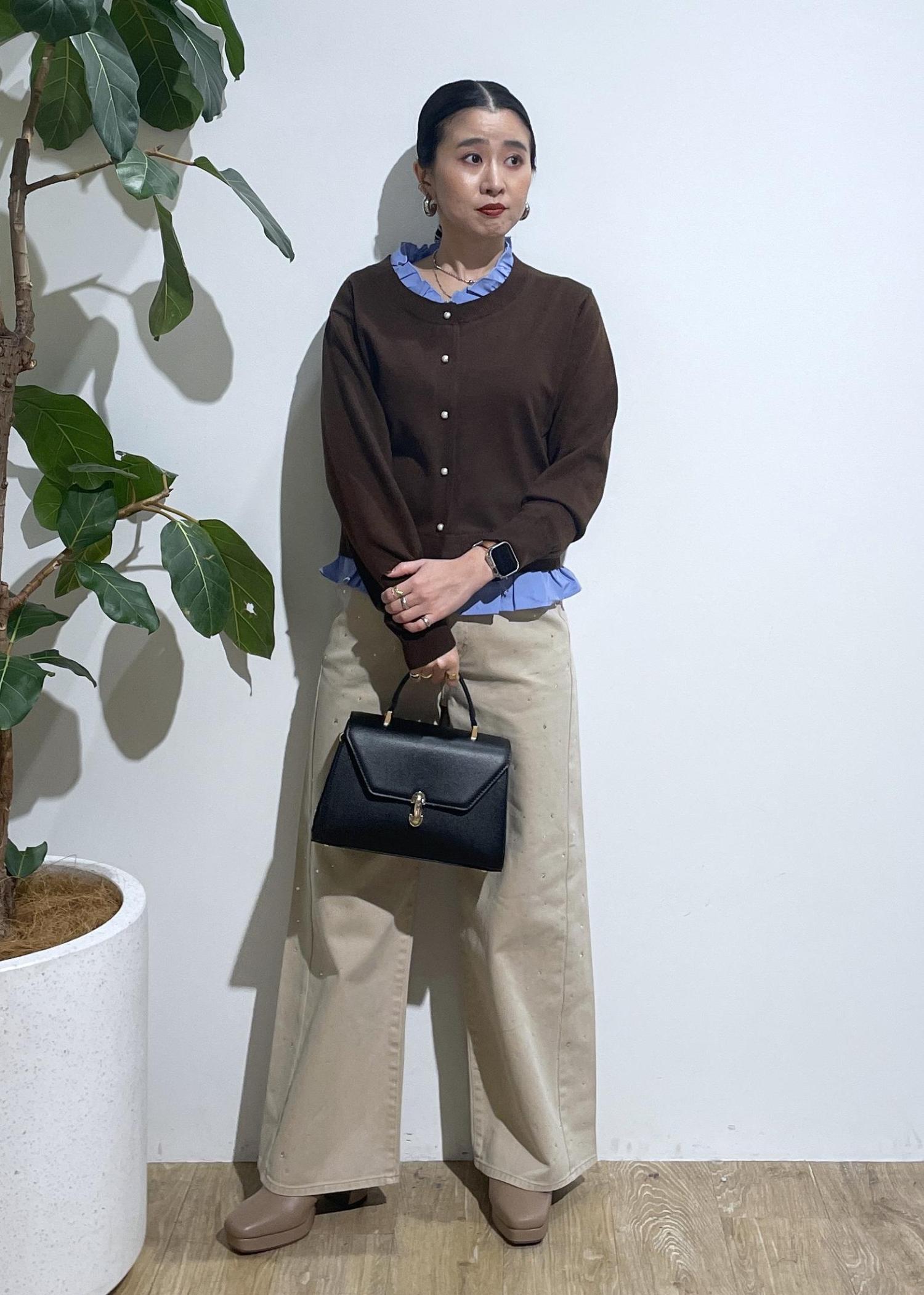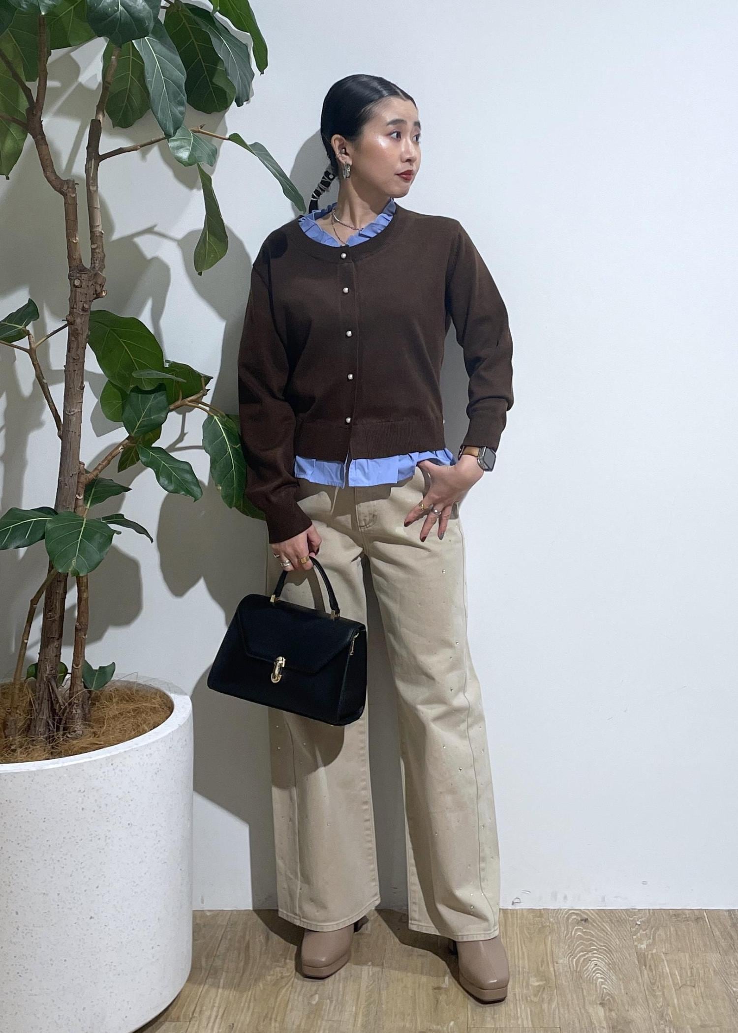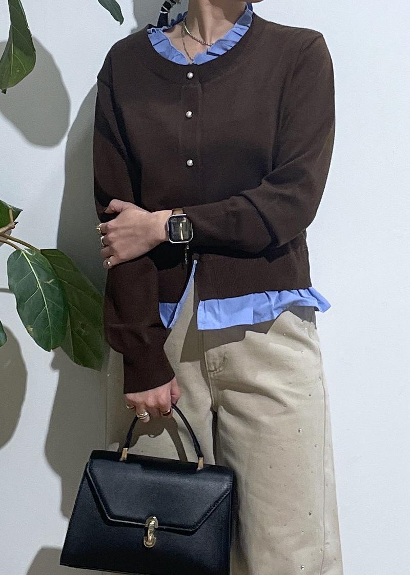 VIS【美得】フリル襟ドッキングニットカーディガントップスダークブラウン / F¥5,929レビューレイヤードスタイルになっているので1枚持っているだけでレイヤードを楽しめます‼︎
