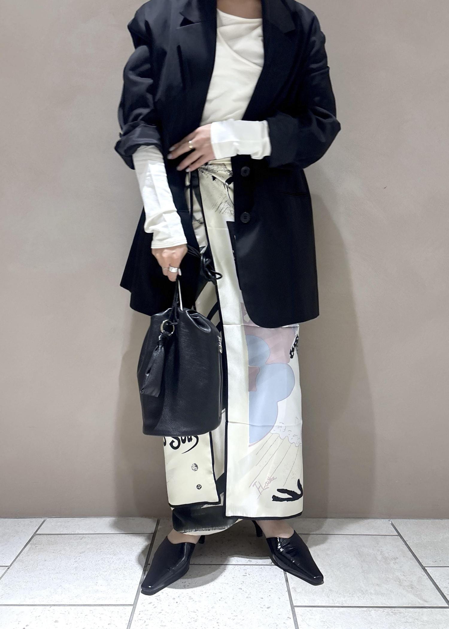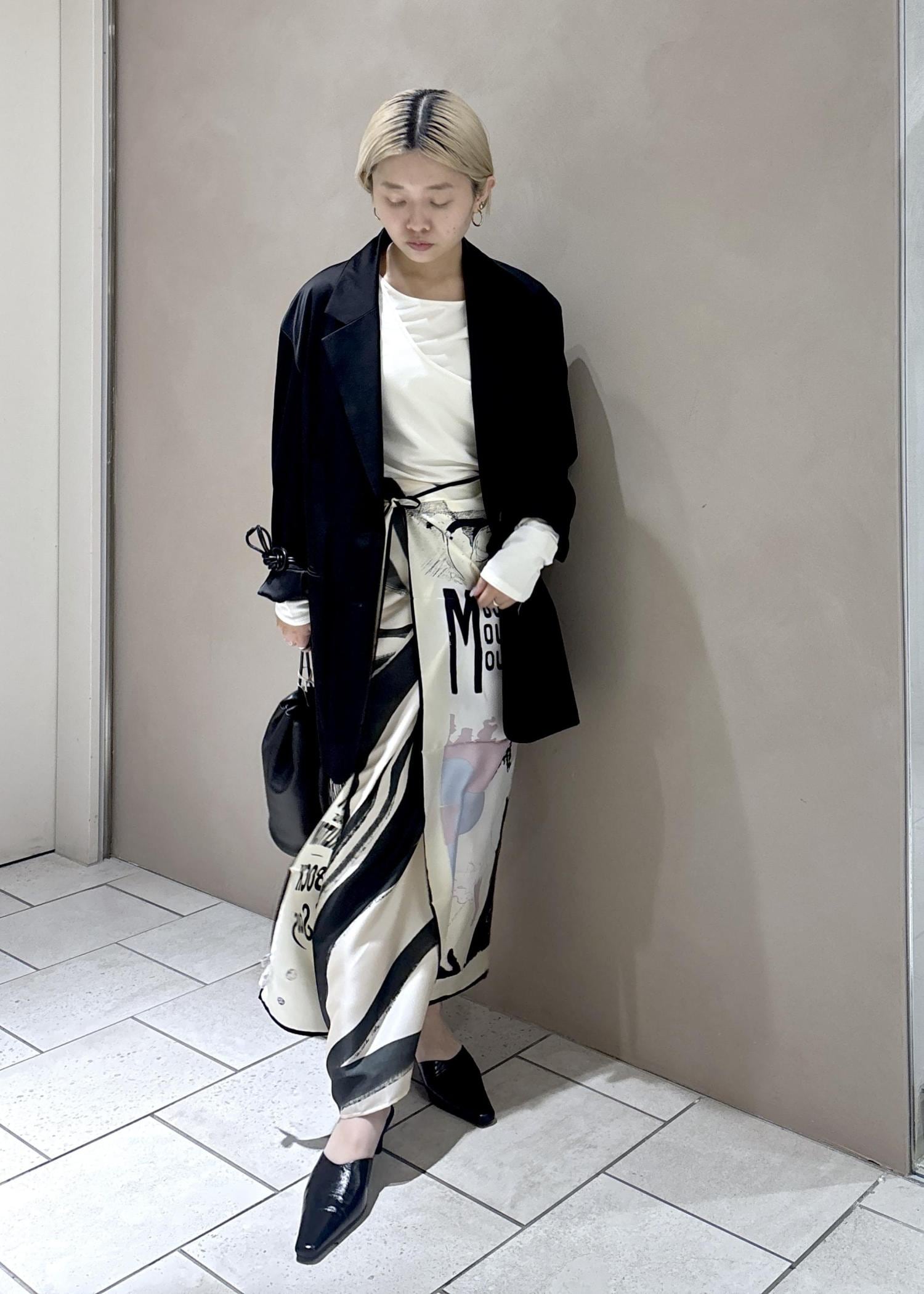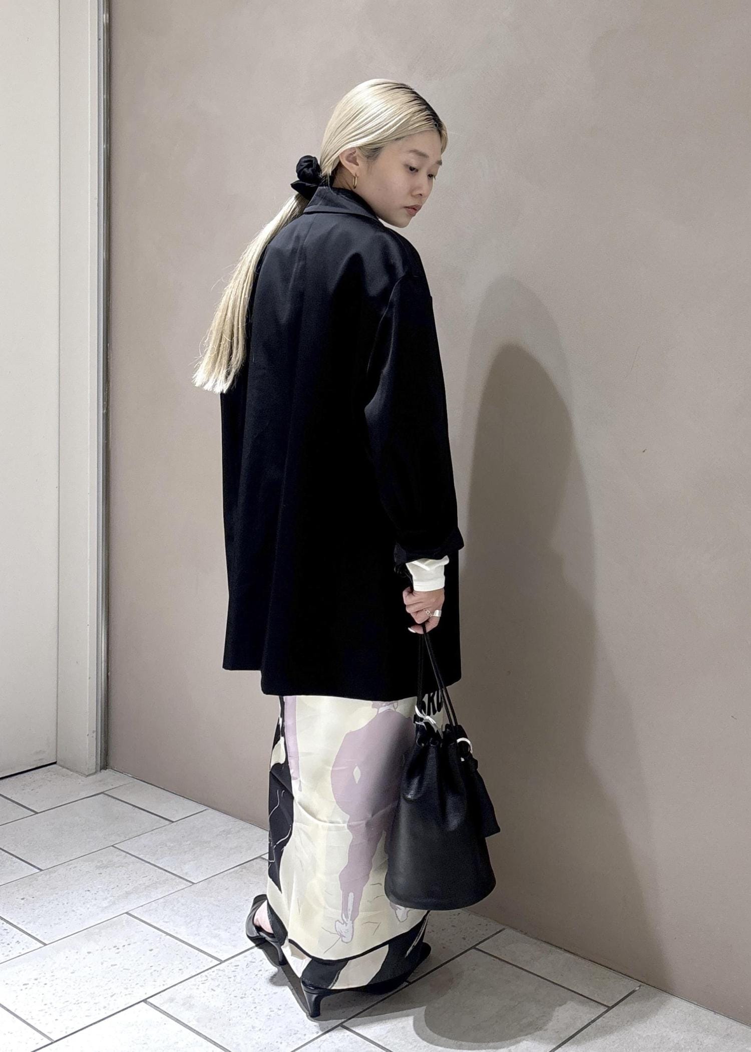 張りのある生地ですが、肩パッドが無い分落ち感がこなれな雰囲気を出してくれます。タイトなボトムスの時には嬉しいバランスです。