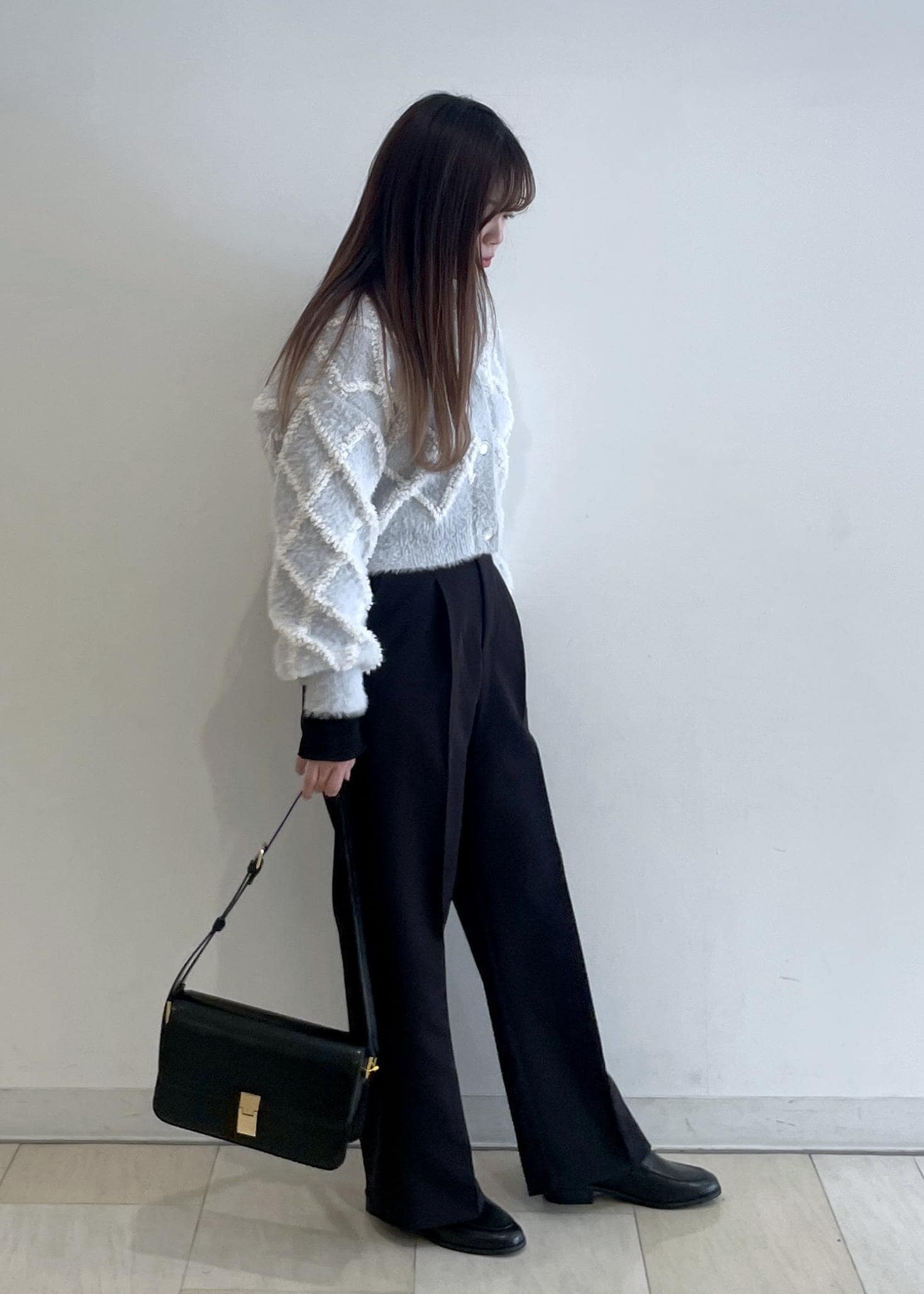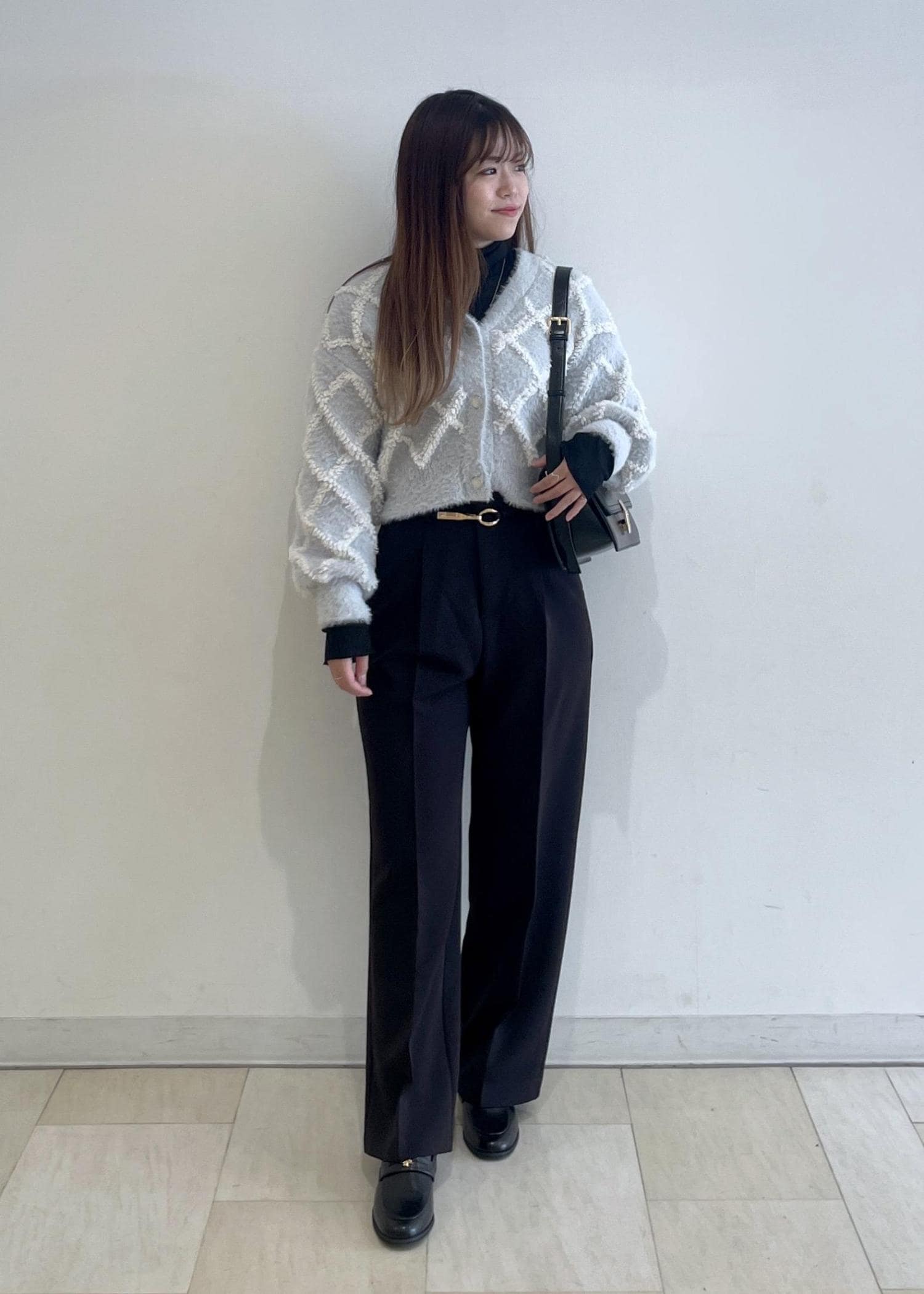 腰周り気になる派なので、基本的に隠すコーデになりがちですが、タックが入ったハイウエストのワイドパンツを合わせるとショート丈も着やすくなります!