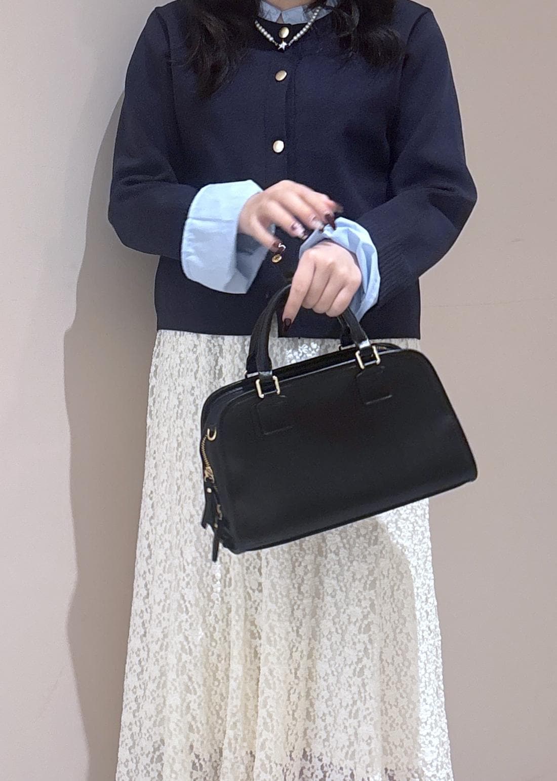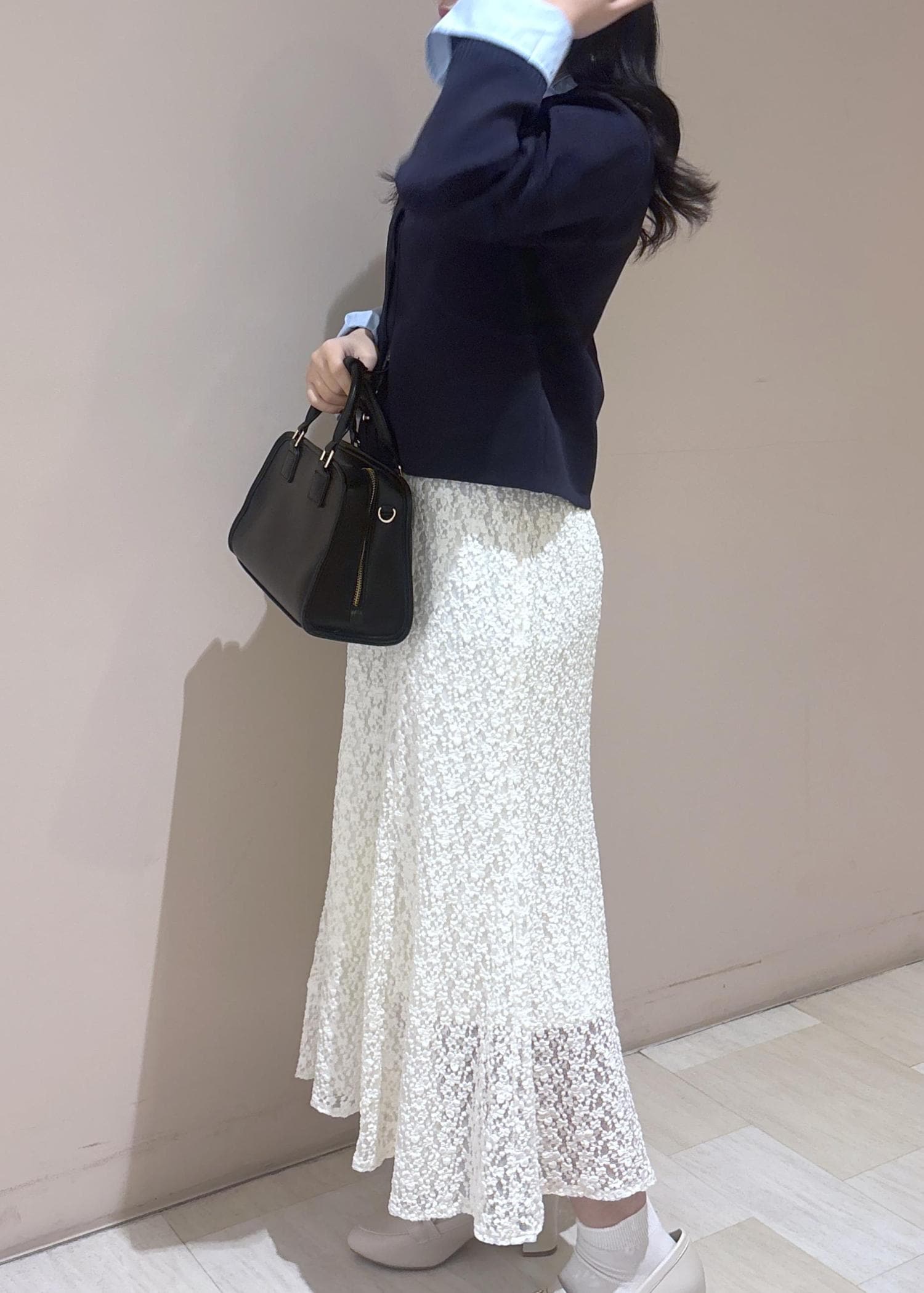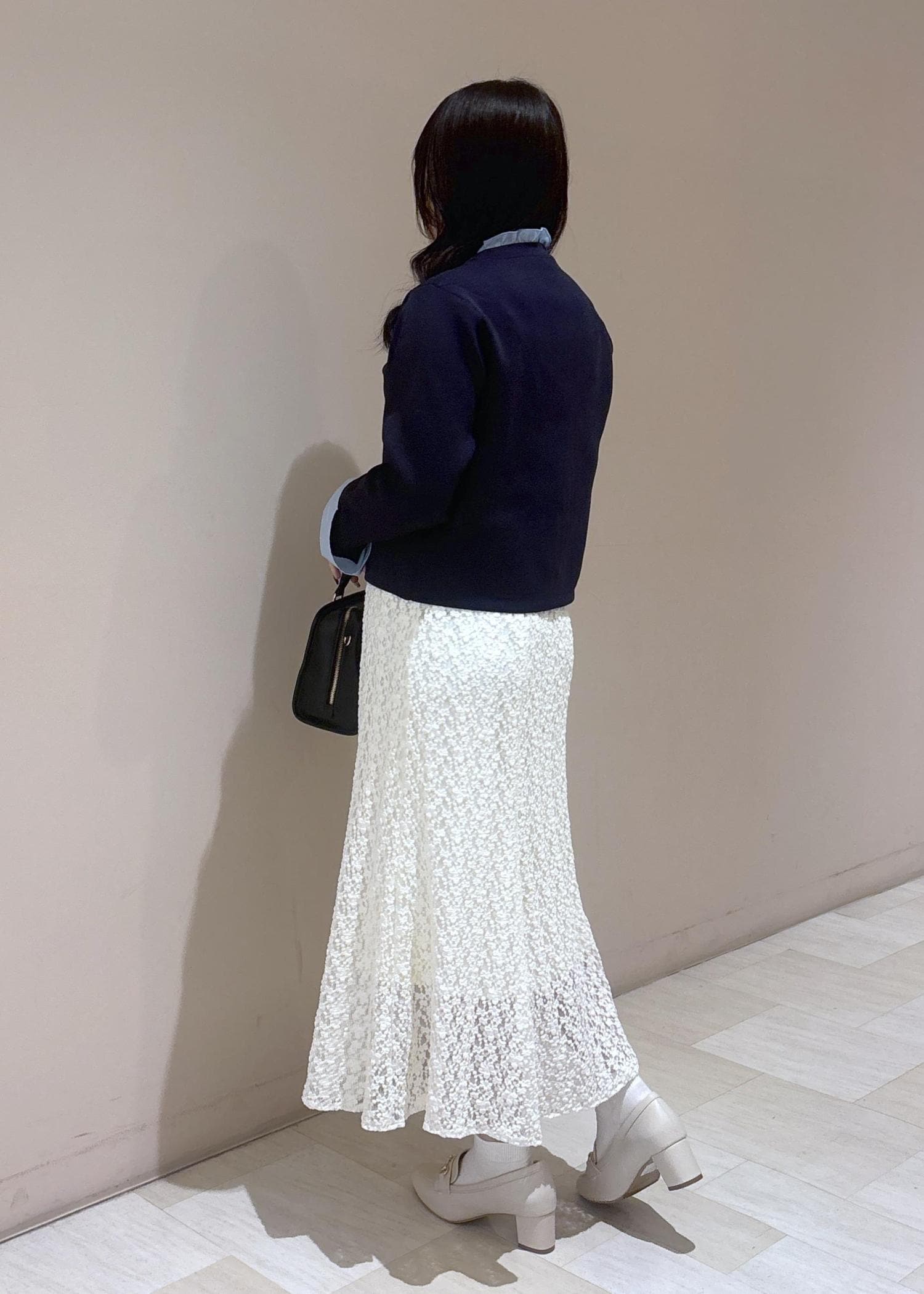 爽やかなブルーのカーディガンに軽やかなレーススカートを