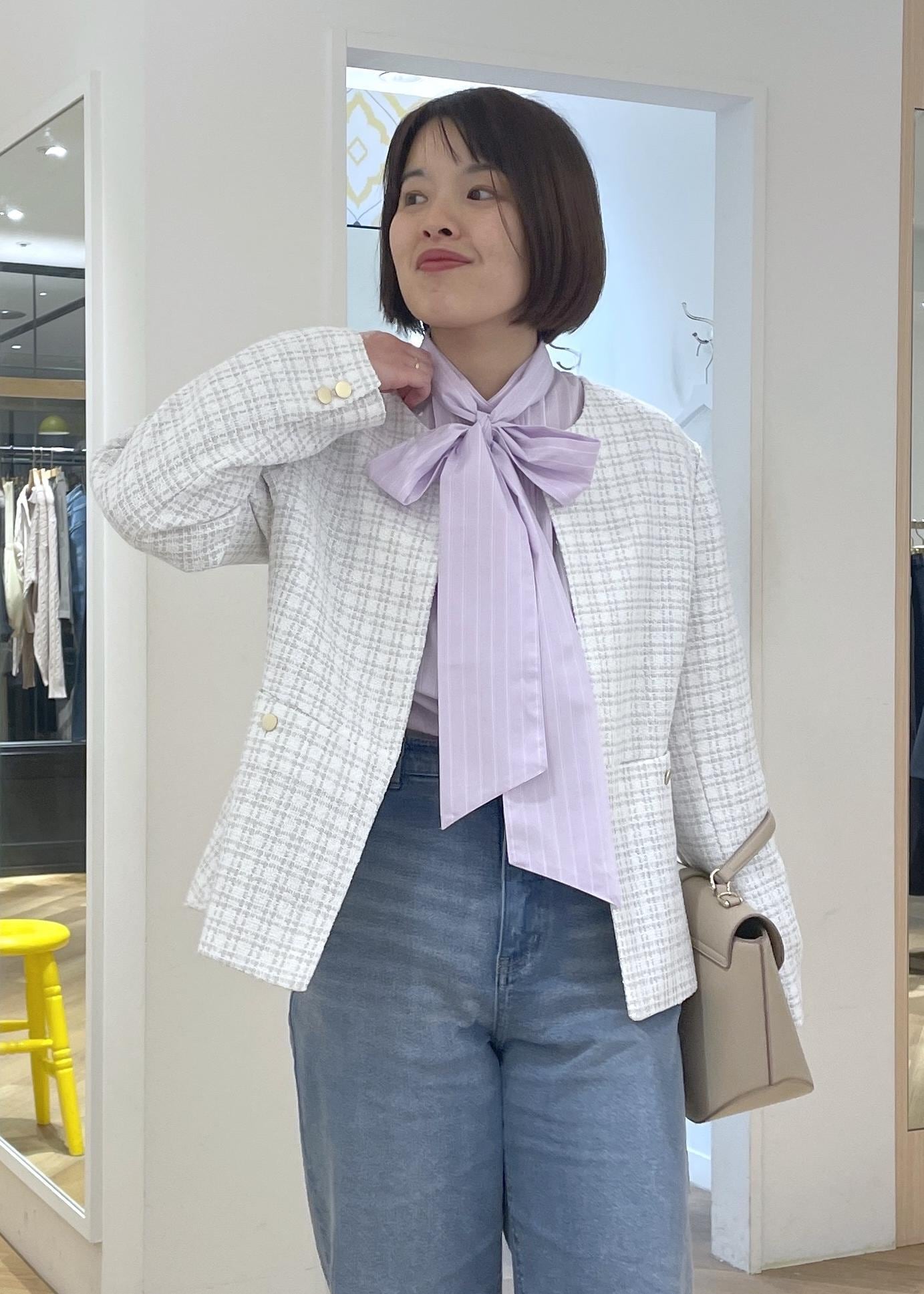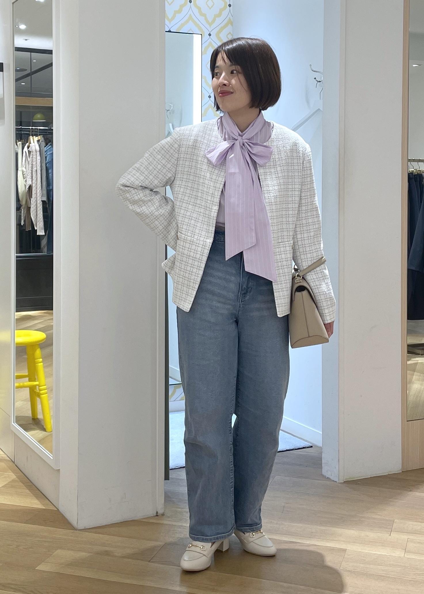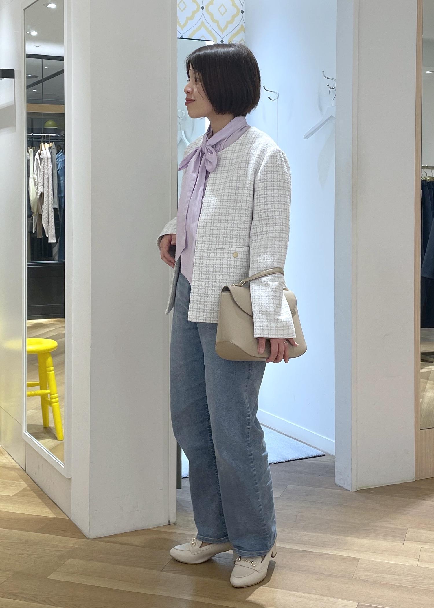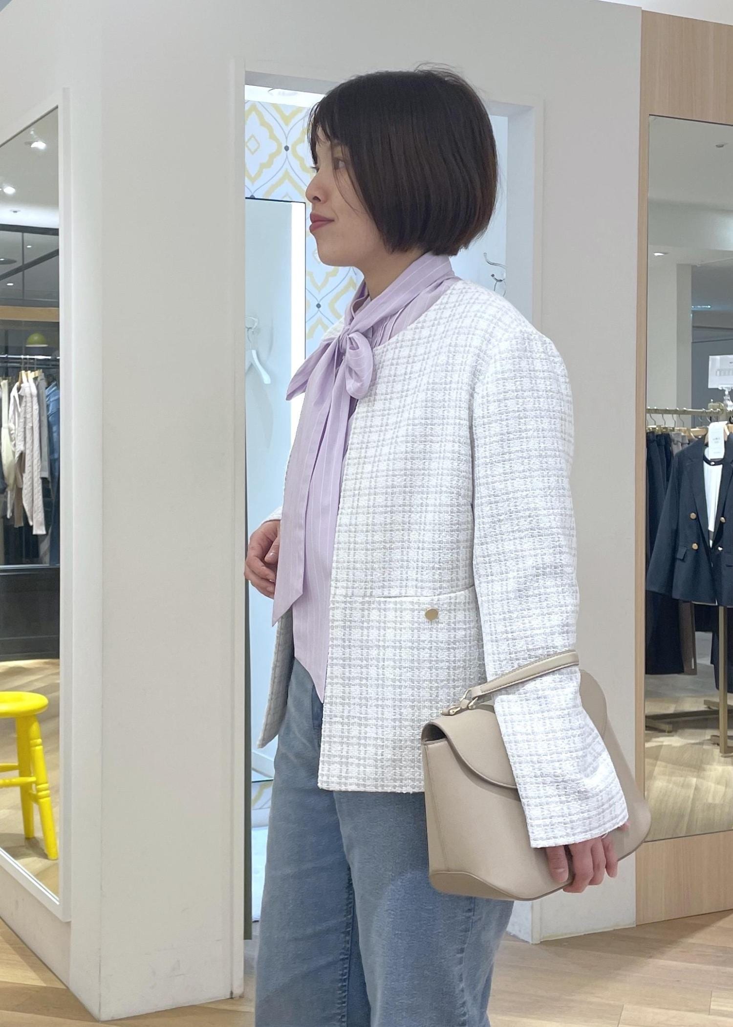 柔らかなグレーのツイードジャケットに、パープルのリボンタイシャツを合わせた、品良く決まる春カラーコーデです!