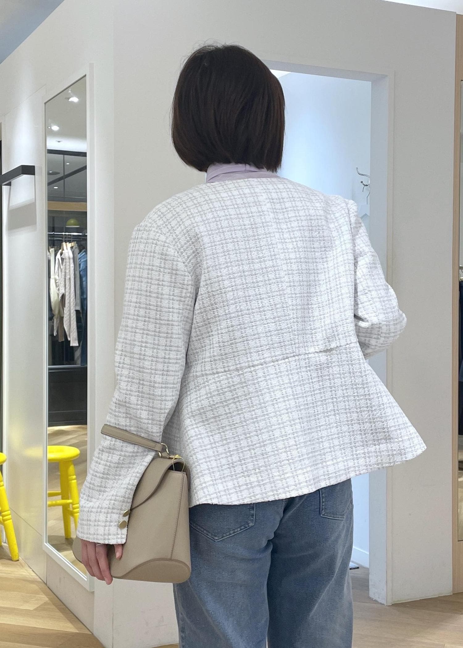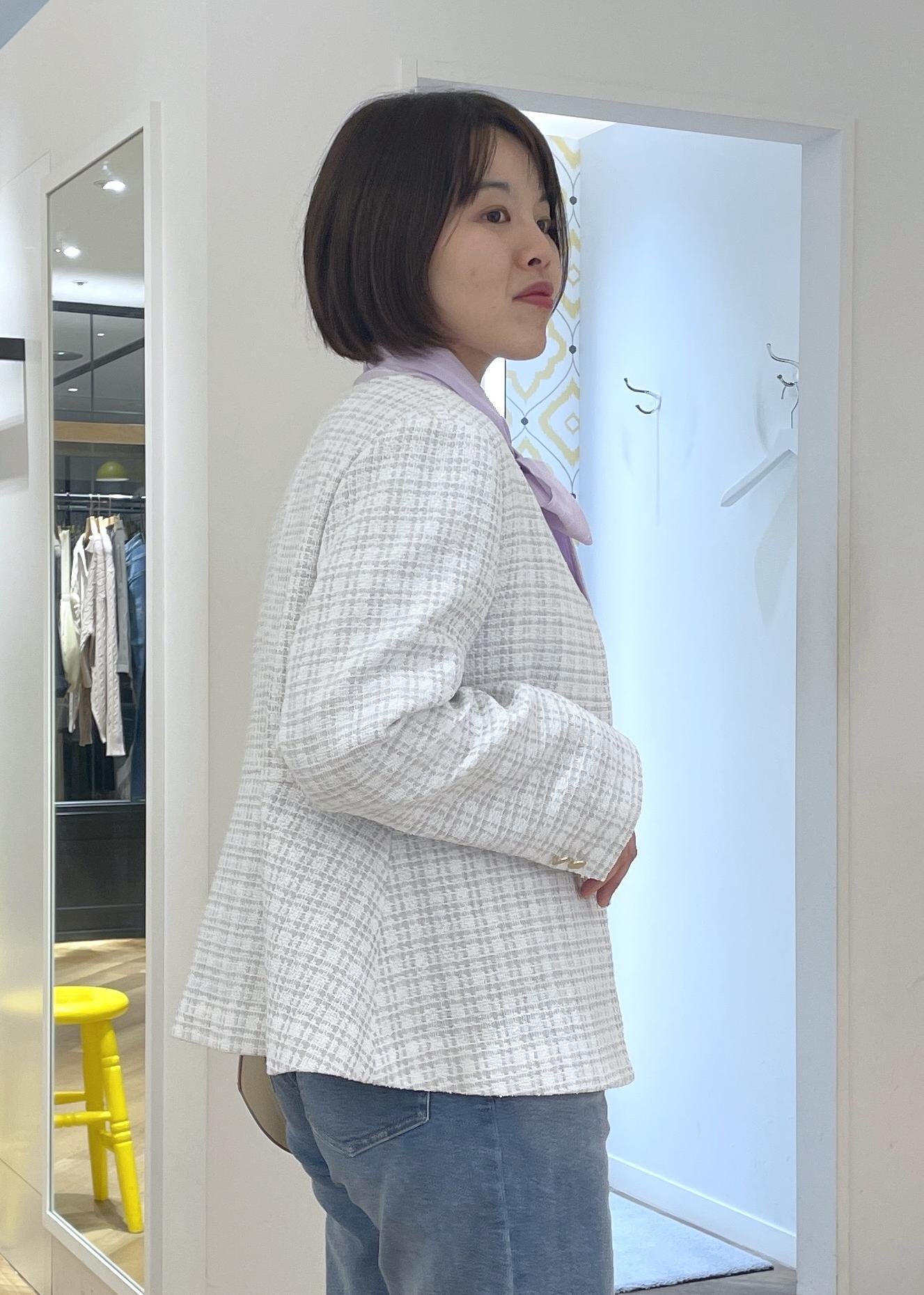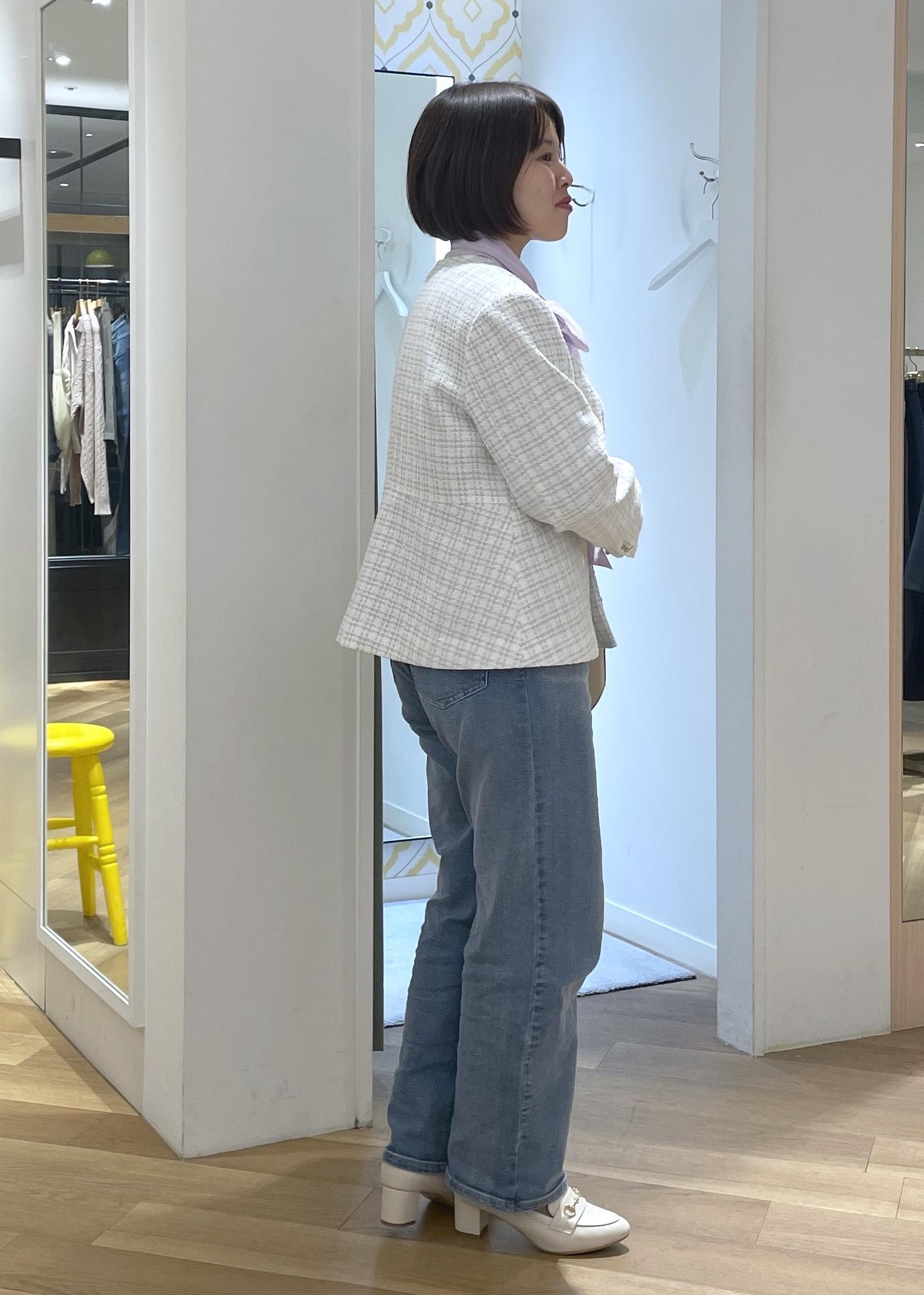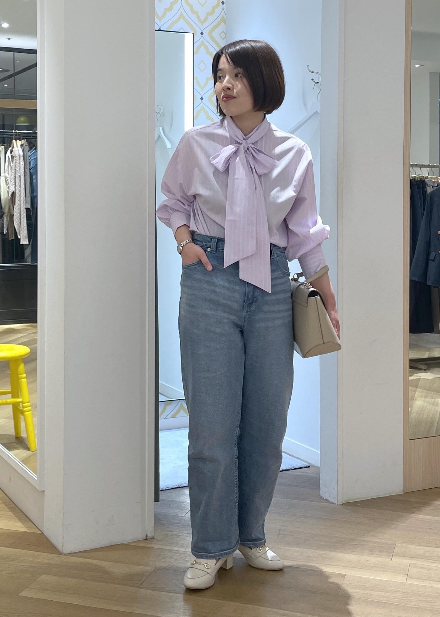 柔らかなグレーのツイードジャケットに、パープルのリボンタイシャツを合わせた、品良く決まる春カラーコーデです!