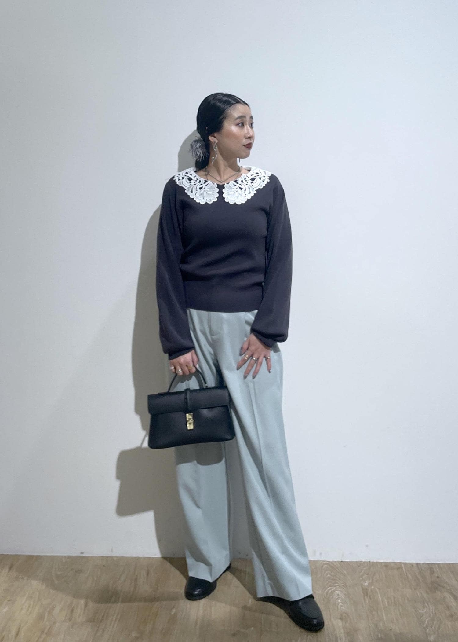 深めの股上とワイドな腿廻りが特徴のカーブパンツシルエット。