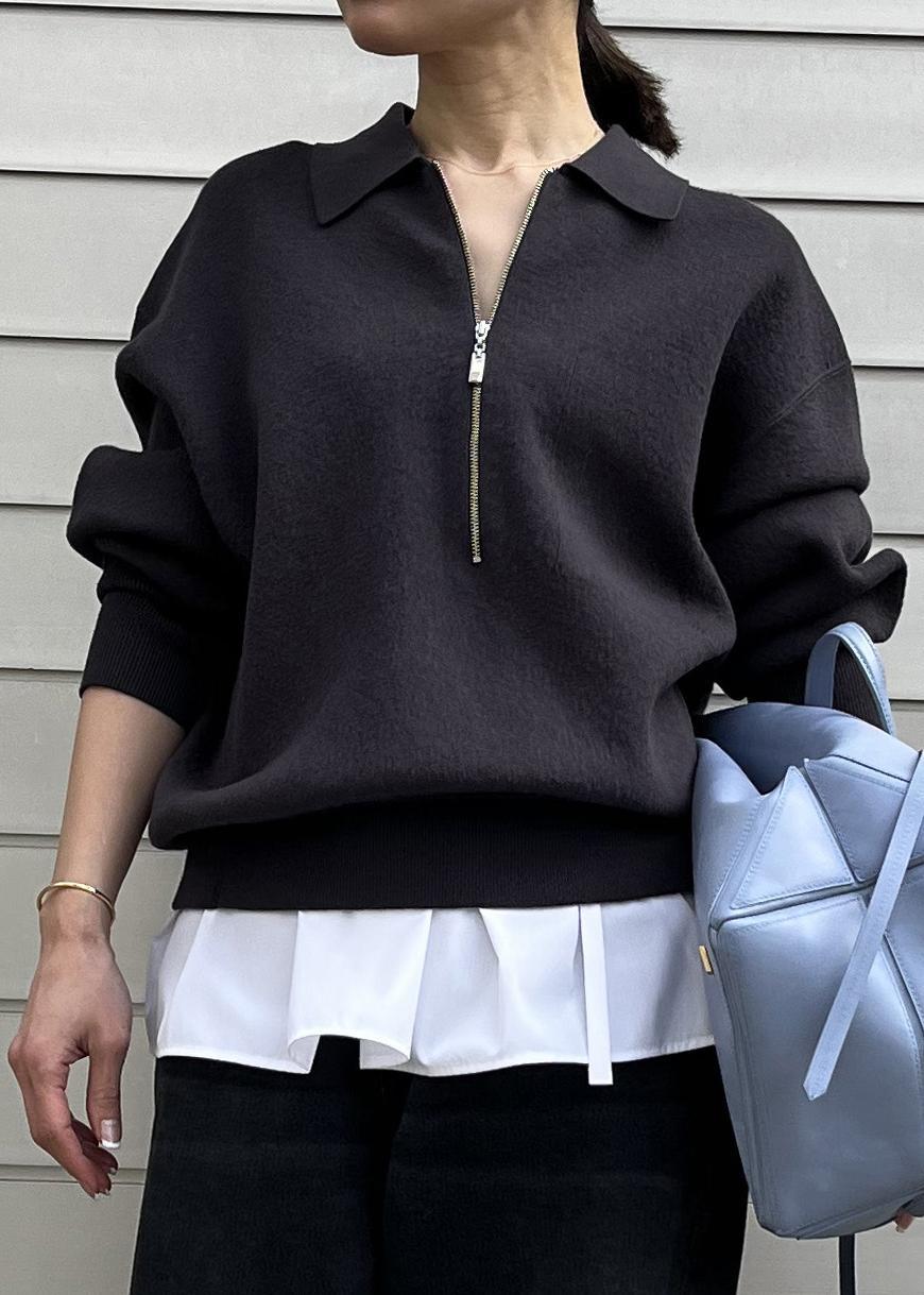 SALON adam et ropéクレープスウェットライクポロプルオーバーチャコール / F¥15,840レビュー程よいボリュームと肉厚なニットなのでスウェットライクに着こなせるのがポイント。154cmでヒップの半分がかかるくらいの着丈ですが、ウエスト部分のブラウジングで丈は調整しやすいです。春の寒い時期にもぴったりなニット。