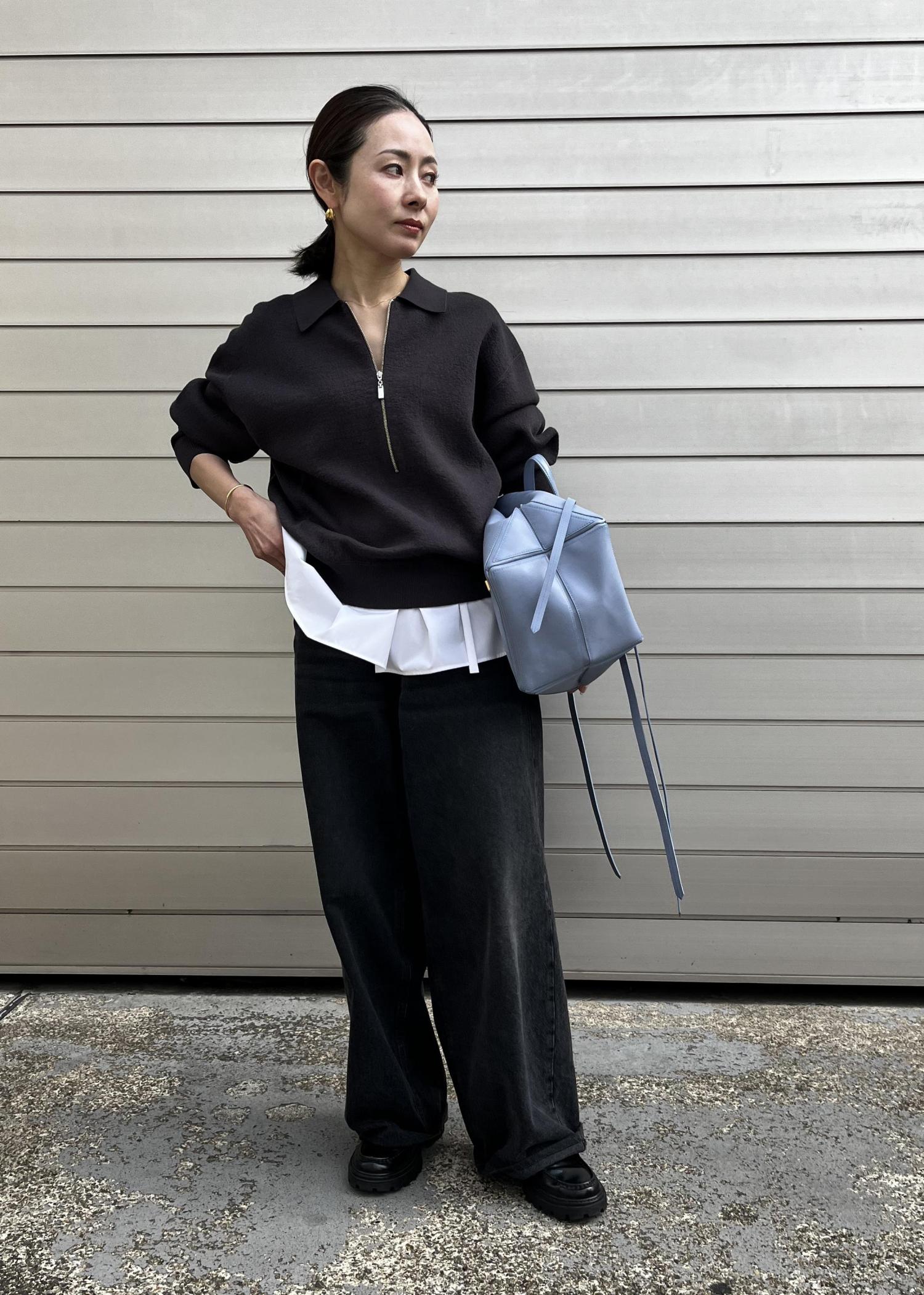 デニム合わせのカジュアルスタイルは間違えると普段着に見えやすい、、、40代以上の大人が着るにはどこかにキレイ目要素をプラス、今回はニットの裾からペプラムをのぞかせて。辛口派の私も取り入れやすい今年のおすすめニットの着こなしです。