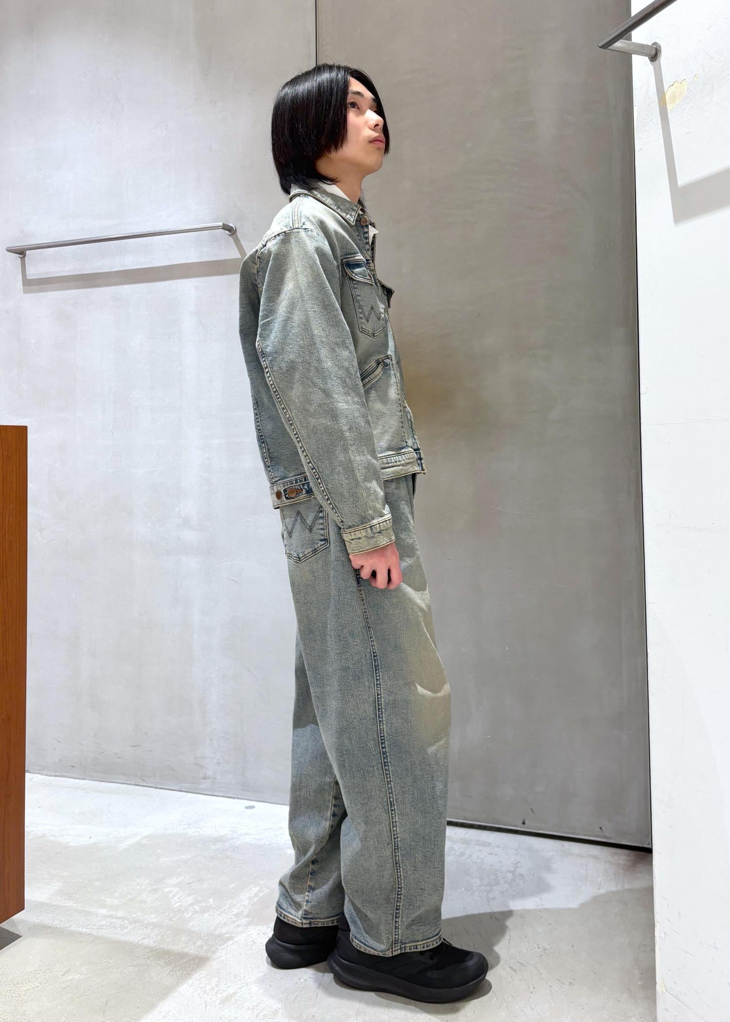 Wrangler別注のデニムセットアップです。見た目はガチガチにデニムですがめちゃくちゃ伸びます。ストレッチ性抜群で着やすいです。あと格好いい。セットアップなのでコーデ考えずに楽にオシャレできるのもいいです。