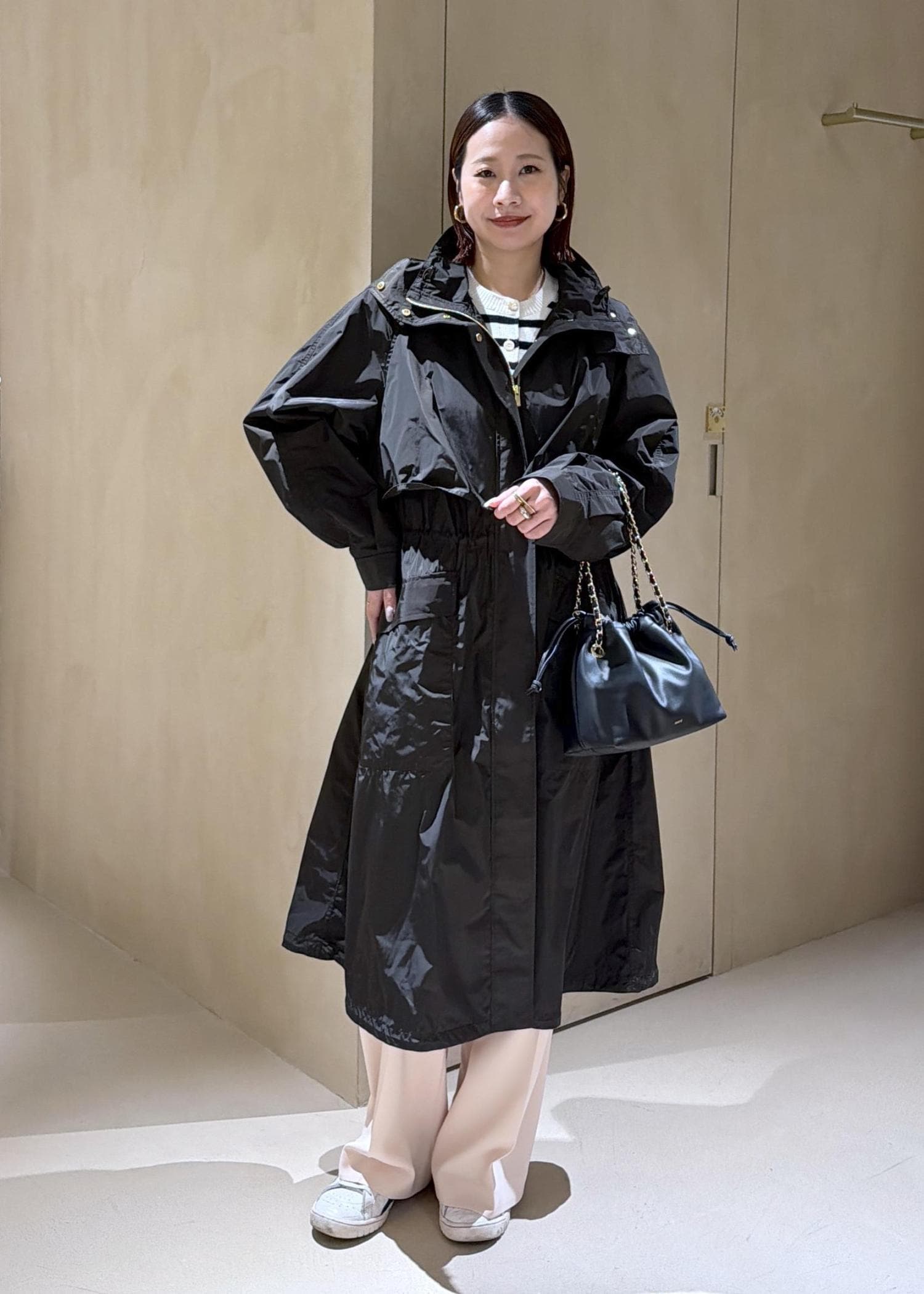 全体的にゆったりとしたサイズ感です。襟元、ウエスト、裾はコードが付いているので絞ることが可能なため絞ってメリハリのある着こなしも可能。