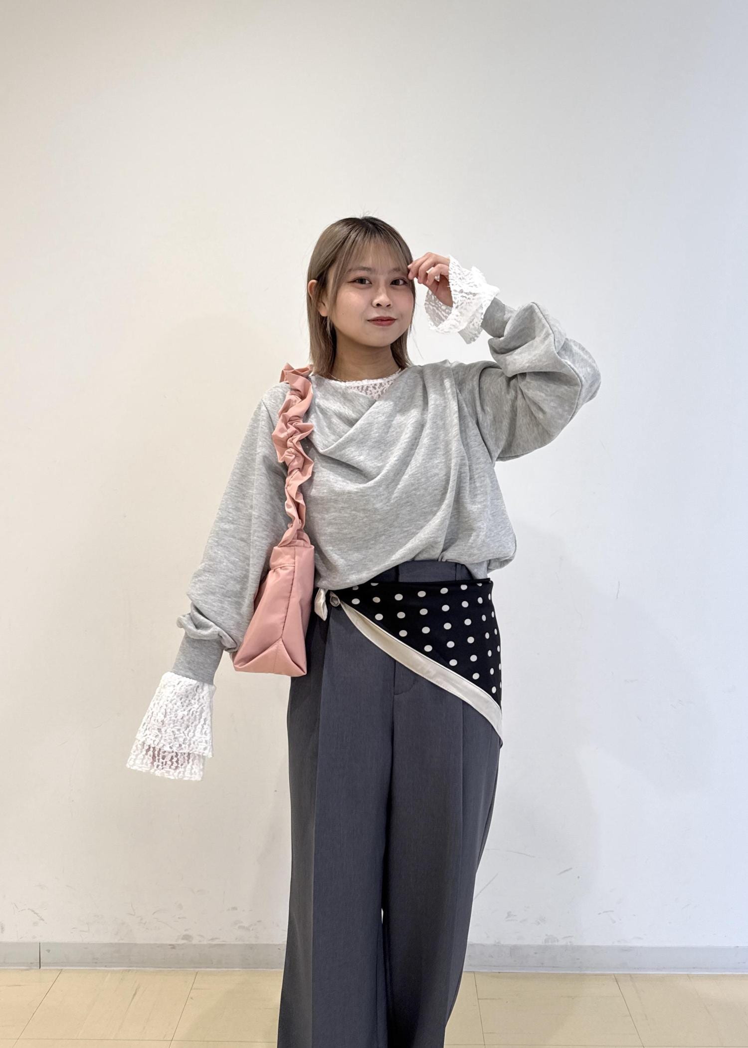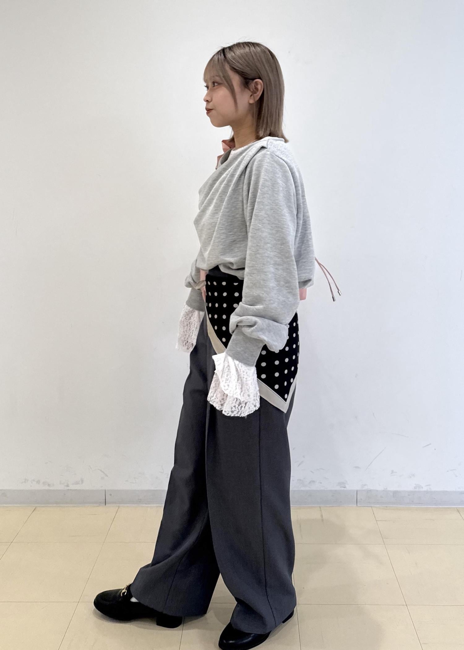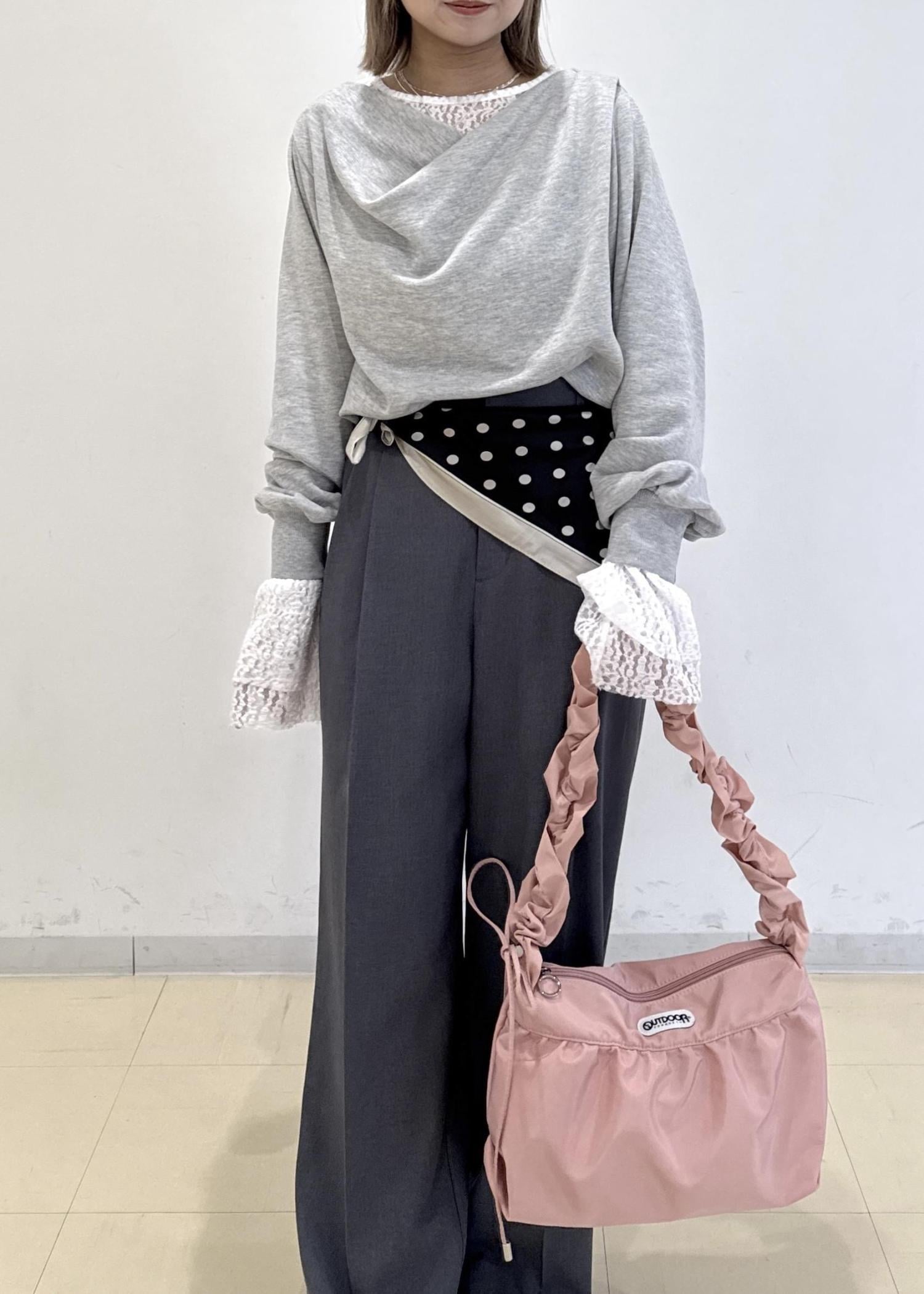ライトグレーのドレープトップスに、チャコールグレーのパンツを合わせたグレーコーデにしました。
