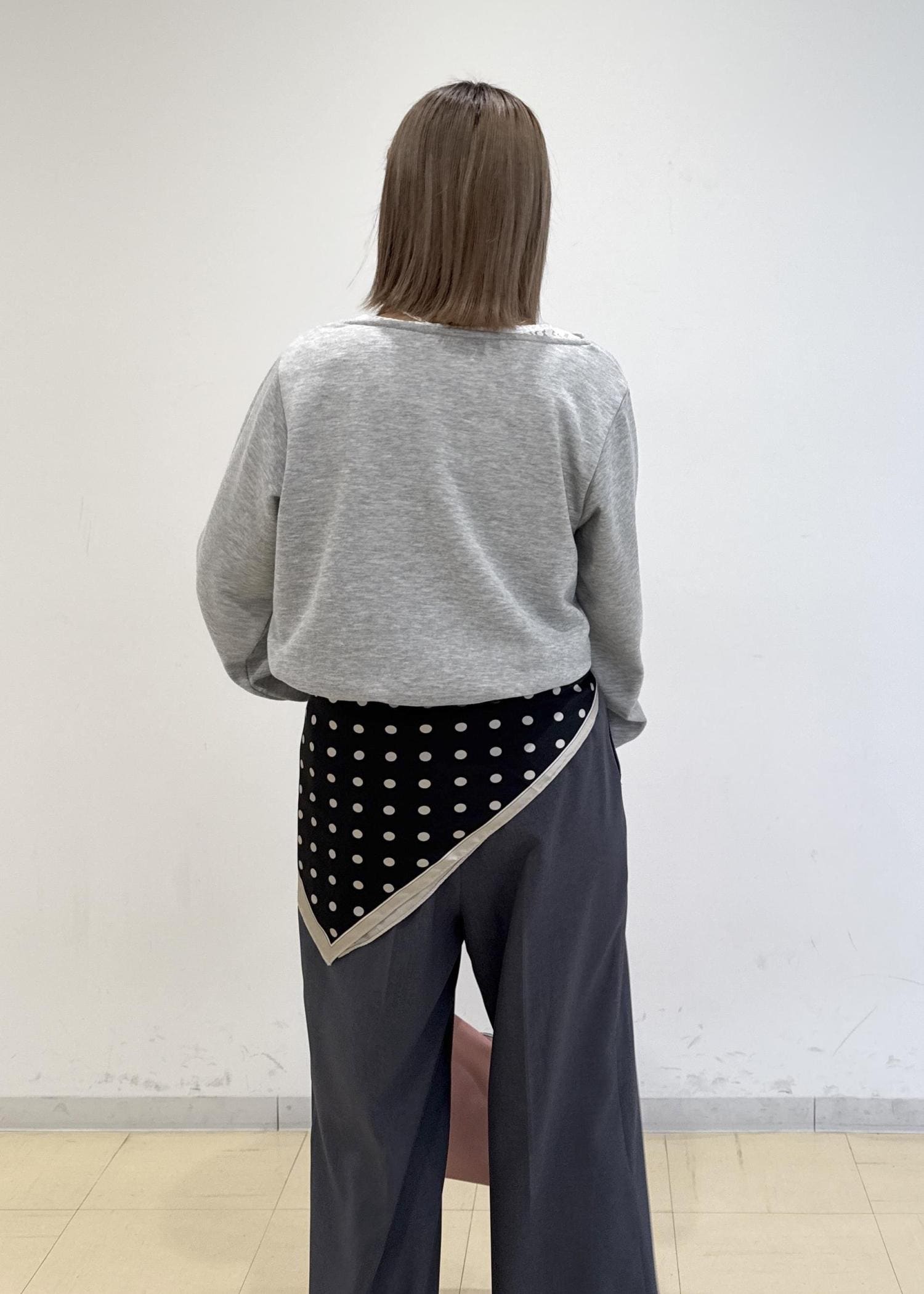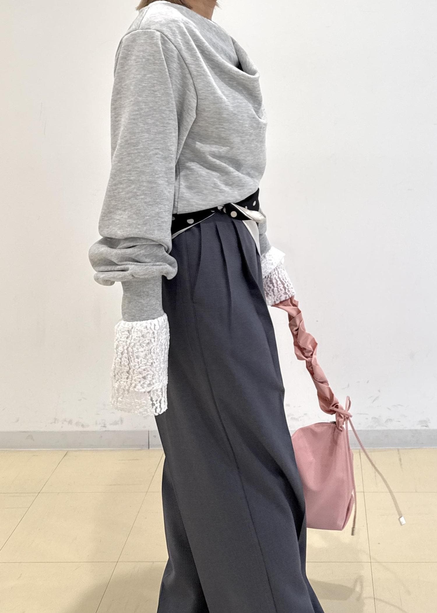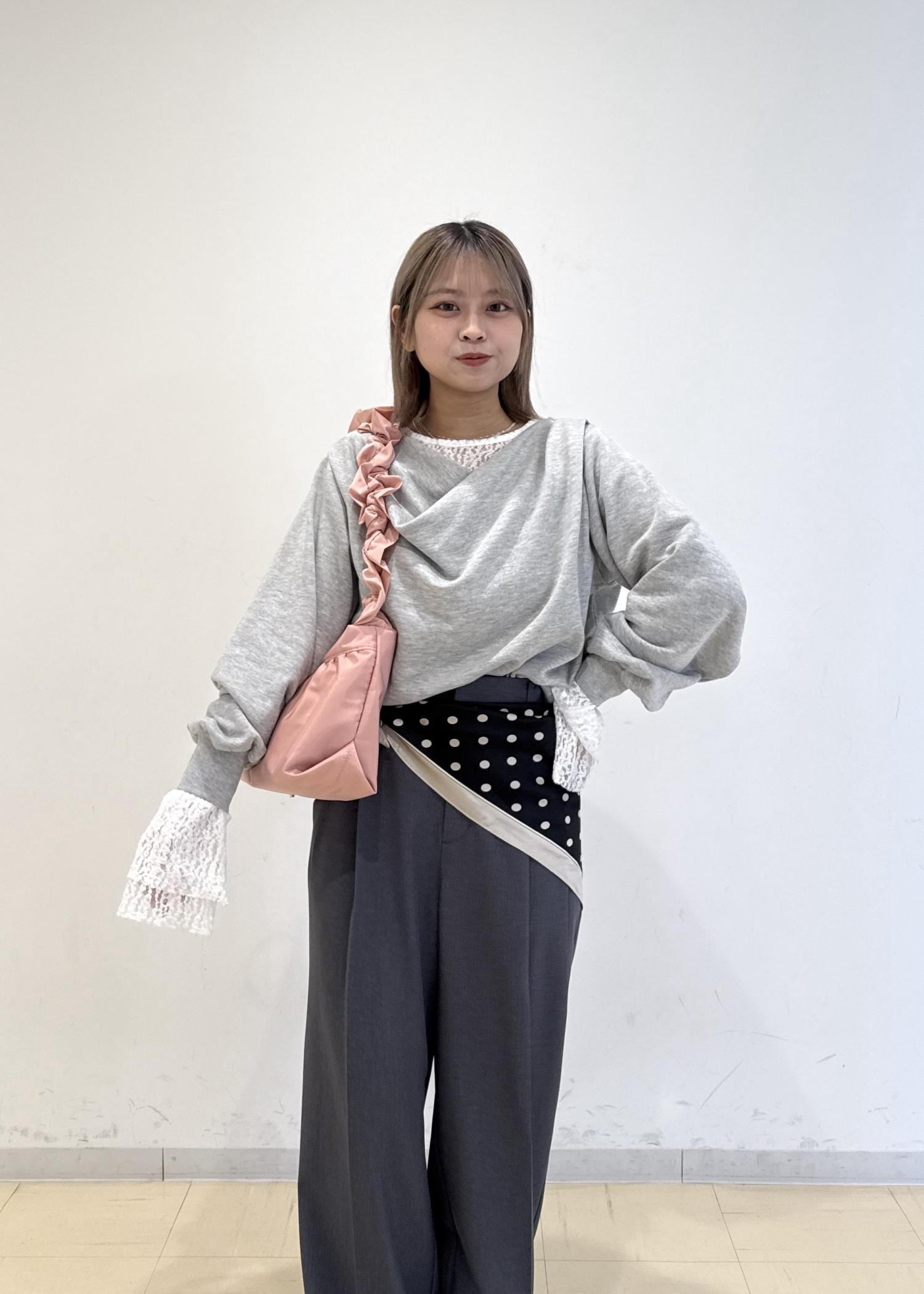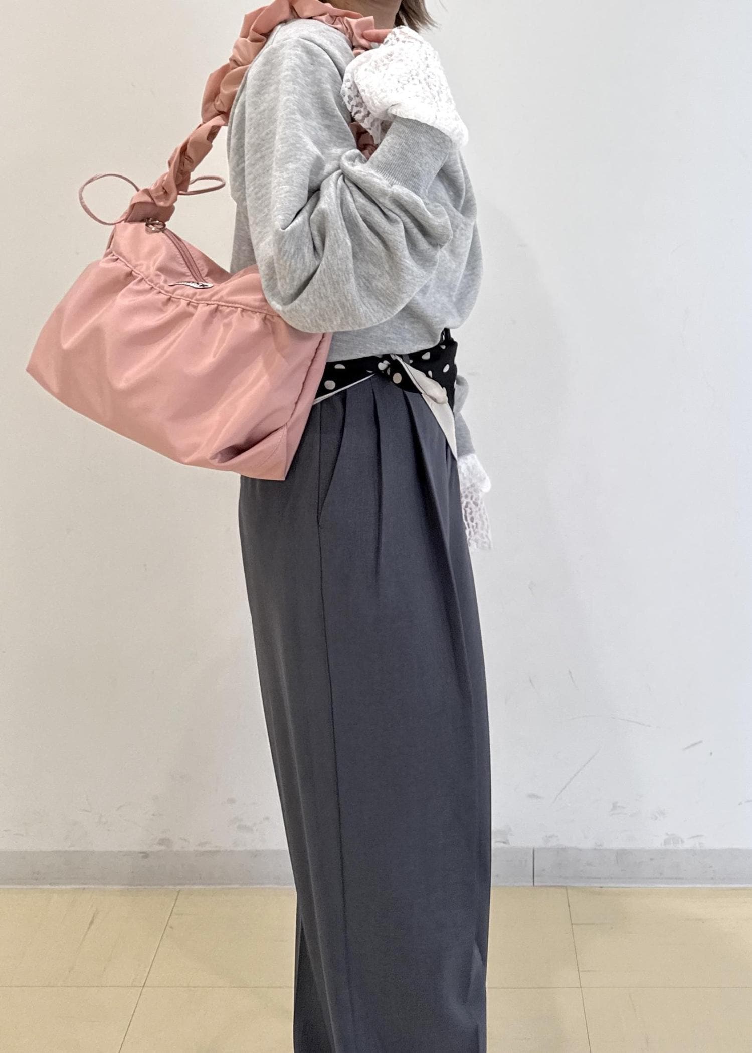 ライトグレーのドレープトップスに、チャコールグレーのパンツを合わせたグレーコーデにしました。